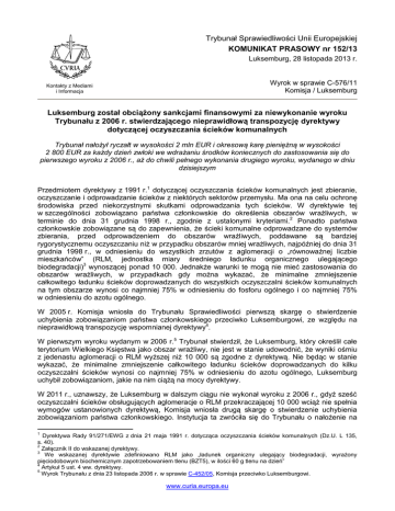 Trybunał Sprawiedliwości Unii Europejskiej KOMUNIKAT PRASOWY nr 152/13 Luksemburg, 28 listopada 2013 r. Wyrok w sprawie C-576/11 Komisja / Luksemburg Kontakty z Mediami i Informacja Luksemburg został obciążony sankcjami finansowymi za niewykonanie wyroku Trybunału z 2006 r. stwierdzającego nieprawidłową transpozycję dyrektywy dotyczącej oczyszczania ścieków komunalnych Trybunał nałożył ryczałt w wysokości 2 mln EUR i okresową karę pieniężną w wysokości 2 800 EUR za każdy dzień zwłoki we wdrażaniu środków koniecznych do zastosowania się do pierwszego wyroku z 2006 r., aż do chwili pełnego wykonania drugiego wyroku, wydanego w dniu dzisiejszym Przedmiotem dyrektywy z 1991 r.1 dotyczącej oczyszczania ścieków komunalnych jest zbieranie, oczyszczanie i odprowadzanie ścieków z niektórych sektorów przemysłu. Ma ona na celu ochronę środowiska przed niekorzystnymi skutkami odprowadzania tych ścieków. W dyrektywie tej w szczególności zobowiązano państwa członkowskie do określenia obszarów wrażliwych, w terminie do dnia 31 grudnia 1998 r., zgodnie z ustalonymi kryteriami.2 Ponadto państwa członkowskie zobowiązane są do zapewnienia, że ścieki komunalne odprowadzane do systemów zbierania, przed odprowadzeniem do obszarów wrażliwych, poddawane są bardziej rygorystycznemu oczyszczaniu niż w przypadku obszarów mniej wrażliwych, najpóźniej do dnia 31 grudnia 1998 r., w odniesieniu do wszystkich zrzutów z aglomeracji o „równoważnej liczbie mieszkańcówˮ (RLM, jednostka miary średniego ładunku organicznego ulegającego biodegradacji)3 wynoszącej ponad 10 000. Jednakże warunki te mogą nie mieć zastosowania do obszarów wrażliwych, w przypadkach gdy można wykazać, że minimalne zmniejszenie całkowitego ładunku ścieków doprowadzanych do wszystkich oczyszczalni ścieków komunalnych na tym obszarze wynosi co najmniej 75% w odniesieniu do fosforu ogólnego i co najmniej 75% w odniesieniu do azotu ogólnego. W 2005 r. Komisja wniosła do Trybunału Sprawiedliwości pierwszą skargę o stwierdzenie uchybienia zobowiązaniom państwa członkowskiego przeciwko Luksemburgowi, ze względu na nieprawidłową transpozycję wspomnianej dyrektywy4. W pierwszym wyroku wydanym w 2006 r.5 Trybunał stwierdził, że Luksemburg, który określił całe terytorium Wielkiego Księstwa jako obszar wrażliwy, nie jest w stanie udowodnić, że wyniki ośmiu z jedenastu aglomeracji o RLM wyższej niż 10 000 są zgodne z dyrektywą. Nie będąc w stanie wykazać, że minimalne zmniejszenie całkowitego ładunku ścieków doprowadzanych do kilku oczyszczalni ścieków wynosi co najmniej 75% w odniesieniu do azotu ogólnego, Luksemburg uchybił zobowiązaniom, jakie na nim ciążą na mocy dyrektywy. W 2011 r., uznawszy, że Luksemburg w dalszym ciągu nie wykonał wyroku z 2006 r., gdyż sześć oczyszczalni ścieków obsługujących aglomeracje o RLM przekraczającej 10 000 wciąż nie spełnia wymogów ustanowionych dyrektywą, Komisja wniosła drugą skargę o stwierdzenie uchybienia zobowiązaniom państwa członkowskiego. Instytucja ta zwróciła się do Trybunału o nałożenie na 1 Dyrektywa Rady 91/271/EWG z dnia 21 maja 1991 r. dotycząca oczyszczania ścieków komunalnych (Dz.U. L 135, s. 40). 2 Załącznik II do wskazanej dyrektywy. 3 We wskazanej dyrektywie zdefiniowano RLM jako „ładunek organiczny ulegający biodegradacji, wyrażony pięciodobowym biochemicznym zapotrzebowaniem tlenu (BZT5), w ilości 60 g tlenu na dzień” 4 Artykuł 5 ust. 4 ww. dyrektywy. 5 Wyrok Trybunału z dnia 23 listopada 2006 r. w sprawie C-452/05, Komisja przeciwko Luksemburgowi. www.curia.europa.eu Luksemburg obowiązku zapłaty okresowej kary pieniężnej w wysokości 11 340 EUR za każdy dzień zwłoki, począwszy od dnia dzisiejszego, tj. dnia ogłoszenia niniejszego wyroku, do dnia, w którym zostanie wykonany pierwszy wyrok z 2006 r., oraz dziennej stawki ryczałtu w wysokości 1248 EUR, licząc od dnia ogłoszenia pierwszego wyroku (czyli od dnia 23 listopada 2006 r.) do dnia ogłoszenia wyroku w niniejszej sprawie albo do dnia, w którym pierwszy wyrok zostanie wykonany, jeżeli nastąpi to wcześniej. W wydanym dzisiaj wyroku Trybunał stwierdził, że skoro Luksemburg przyznał, iż nie dostosował się do wymogów określonych w wyroku z 2006 r. co najmniej w odniesieniu do dwóch oczyszczalni ścieków (Beggen i Bleesbruck), to bezsporne jest, że do dnia 28 sierpnia 2010 r. (czyli w terminie wyznaczonym przez Komisję w dodatkowym wezwaniu do usunięcia uchybienia) Luksemburg nie podjął wszystkich środków niezbędnych do pełnego wykonania zobowiązań wynikających z pierwszego wyroku Trybunału. Luksemburg uchybił zatem zobowiązaniom, jakie ciążą na nim na mocy prawa Unii. W konsekwencji Luksemburg został zobowiązany do zapłaty ryczałtu w wysokości 2 mln EUR. Trybunał przypomniał, że zasądzanie zapłaty takiej kary opiera się zasadniczo na ocenie skutków niewykonania zobowiązań danego państwa członkowskiego dla interesów prywatnych i interesu publicznego, w szczególności gdy uchybienie trwało przez długi czas od chwili wydania stwierdzającego je wyroku. Jednakże w przypadku realizacji na szeroką skalę projektów infrastrukturalnych, takich jak projekty omawiane w niniejszej sprawie, złożoność, koszt i czas realizacji tych projektów przez dane państwo członkowskie powinny być brane pod uwagę zarówno przy ocenie konieczności nałożenia ryczałtu, jak i przy ustalaniu jego kwoty. Tymczasem z akt sprawy wynika, że Luksemburg podejmuje znaczne wysiłki i realizuje istotne inwestycje w celu wykonania pierwszego wyroku z 2006 r. Komisja wskazała ponadto, że do dnia dzisiejszego liczba aglomeracji, które nie spełniają wymogów dyrektywy, została zmniejszona do sześciu aglomeracji (Beggen, Bleesbruck, Bonnevoie, Hespérange, Mersch i Übersyren6) na dwanaście istniejących. Podkreśliwszy, że