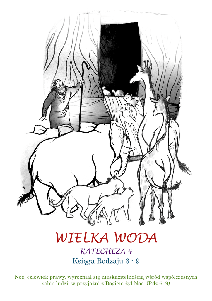 WIELKA WODA KATECHEZA 4 Księga Rodzaju 6 - 9 ! Noe, człowiek prawy, wyróżniał się nieskazitelnością wśród współczesnych sobie ludzi; w przyjaźni z Bogiem żył Noe. (Rdz 6, 9) ! Księga Rodzaju - rozdziały 6 - 9 Kiedy zaś Pan widział, że wielka jest niegodziwość ludzi na ziemi i że usposobienie ich jest wciąż złe, żałował, że stworzył ludzi na ziemi, i zasmucił się. Wreszcie Pan rzekł: «Zgładzę ludzi, których stworzyłem, z powierzchni ziemi: ludzi, bydło, zwierzęta pełzające i ptaki powietrzne, bo żal mi, że ich stworzyłem». [Tylko] Noego Pan darzył życzliwością. Oto dzieje Noego. Noe, człowiek prawy, wyróżniał się nieskazitelnością wśród współczesnych sobie ludzi; w przyjaźni z Bogiem żył Noe. A Noe był ojcem trzech synów: Sema, Chama i Jafeta. Ziemia została skażona w oczach Boga. Gdy Bóg widział, iż ziemia jest skażona, że wszyscy ludzie postępują na ziemi niegodziwie, rzekł do Noego: «Postanowiłem położyć kres istnieniu wszystkich ludzi, bo ziemia jest pełna wykroczeń przeciw mnie; zatem zniszczę ich wraz z ziemią. Ty zaś zbuduj sobie arkę z drzewa żywicznego, uczyń w arce przegrody i powlecz ją smołą wewnątrz i zewnątrz. A oto, jak masz ją wykonać: długość arki - trzysta łokci, pięćdziesiąt łokci - jej szerokość i wysokość jej - trzydzieści łokci. Nakrycie arki, przepuszczające światło, sporządzisz na łokieć wysokie i zrobisz wejście do arki w jej bocznej ścianie; uczyń przegrody: dolną, drugą i trzecią. Ja zaś sprowadzę na ziemię potop, aby zniszczyć wszelką istotę pod niebem, w której jest tchnienie życia; wszystko, co istnieje na ziemi, wyginie, ale z tobą zawrę przymierze. Wejdź przeto do arki z synami twymi, z żoną i z żonami twych synów. Spośród wszystkich istot żyjących wprowadź do arki po parze, samca i samicę, aby ocalały wraz z tobą od zagłady. Z każdego gatunku ptactwa, bydła i zwierząt pełzających po ziemi po parze; niechaj wejdą do ciebie, aby nie wyginęły. A ty nabierz sobie wszelkiej żywności - wszystkiego, co nadaje się do jedzenia - i zgromadź u siebie, aby była na pokarm dla ciebie i na paszę dla zwierząt». I Noe wykonał wszystko tak, jak Bóg polecił mu uczynić. A potem Pan rzekł do Noego: «Wejdź wraz z całą twą rodziną do arki, bo przekonałem się, że tylko ty jesteś wobec mnie prawy wśród tego pokolenia. Z wszelkich zwierząt czystych weź z sobą siedem samców i siedem samic, ze zwierząt zaś nieczystych po jednej parze: samca i samicę; również i z ptactwa - po siedem samców i po siedem samic, aby w ten sposób zachować ich potomstwo dla całej ziemi. Bo za siedem dni spuszczę na ziemię deszcz, który będzie padał czterdzieści dni i czterdzieści nocy, aby wyniszczyć wszystko, co istnieje na powierzchni ziemi - cokolwiek stworzyłem». I spełnił Noe wszystko tak, jak mu Pan polecił. Noe miał sześćset lat, gdy nastał potop na ziemi. Noe wszedł z synami, z żoną i z żonami swych synów do arki, aby schronić się przed wodami potopu. Ze zwierząt czystych i nieczystych, z ptactwa i ze wszystkiego, co pełza po ziemi, po dwie sztuki, samiec i samica, weszły do Noego, do arki, tak jak mu Bóg rozkazał. A gdy upłynęło siedem dni, wody potopu spadły na ziemię. W roku sześćsetnym życia Noego, w drugim miesiącu roku, siedemnastego dnia miesiąca, w tym właśnie dniu trysnęły z hukiem wszystkie źródła Wielkiej Otchłani i otworzyły się upusty nieba; przez czterdzieści dni i przez czterdzieści nocy padał deszcz na ziemię. I właśnie owego dnia Noe oraz jego synowie, Sem, Cham, Jafet, żona Noego i trzy żony jego synów weszli do arki, a wraz z nimi wszelkie gatunki zwierząt, bydła, zwierząt pełzających po ziemi, wszelkiego ptactwa [i istot ze skrzydłami]. Wszelkie istoty, w których było tchnienie życia, weszły po parze do Noego do arki. Gdy już weszły do arki samiec i samica każdej istoty żywej, jak Bóg rozkazał Noemu, Pan zamknął za nim [drzwi]. A potop trwał na ziemi czterdzieści dni i wody wezbrały, i podniosły arkę ponad ziemię. Kiedy przybywało coraz więcej wody i poziom jej podniósł się wysoko ponad ziemią, arka płynęła po powierzchni wód. Wody bowiem podnosiły się coraz bardziej nad ziemię, tak że zakryły wszystkie góry wysokie, które były pod niebem. Wody się więc podniosły na piętnaście łokci ponad góry i zakryły je. Wszystkie istoty poruszające się na ziemi z ptactwa, bydła i innych zwierząt i z wszelkich jestestw, których było wielkie mnóstwo na ziemi, wyginęły wraz ze wszystkimi ludźmi. Wszystkie istoty, w których nozdrzach było ożywiające tchnienie życia, wszystkie, które żyły na lądzie, zginęły. I tak Bóg wygubił doszczętnie wszystko, co istniało na ziemi, od człowieka do bydła, zwierząt pełzających i ptactwa powietrznego; wszystko zostało doszczętnie wytępione z ziemi. Pozostał tylko Noe i to, co z nim było w arce. A wody stale się podnosiły na ziemi przez sto pięćdziesiąt dni. Ale Bóg, pamiętając o Noem, o wszystkich istotach żywych i o wszystkich zwierzętach, które z nim były w arce, sprawił, że powiał wiatr nad całą ziemią i wody zaczęły opadać. Zamknęły się bowiem zbiorniki Wielkiej Otchłani tak, że deszcz przestał padać z nieba. Wody ustępowały z ziemi powoli, lecz nieustannie, i po upływie stu pięćdziesięciu dni się obniżyły. Miesiąca siódmego, siedemnastego dnia miesiąca arka osiadła na górach Ararat. Woda wciąż opadała aż do miesiąca dziesiątego. W pierwszym dniu miesiąca dziesiątego ukazały się szczyty gór. A po czterdziestu dniach Noe, otworzywszy okno arki, które przedtem uczynił, wypuścił kruka; ale ten wylatywał i zaraz wracał, dopóki nie wyschła woda na ziemi. Potem wypuścił z arki gołębicę, aby się przekonać, czy ustąpiły wody z powierzchni ziemi. Gołębica, nie znalaz