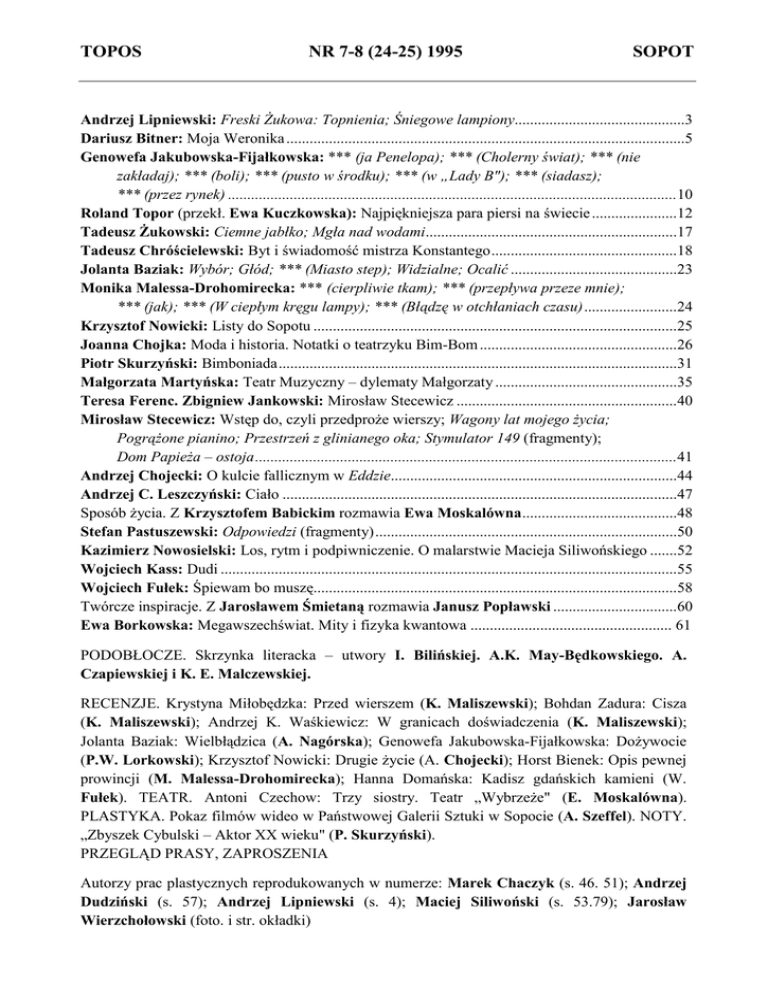 TOPOS NR 7-8 (24-25) 1995 SOPOT Andrzej Lipniewski: Freski Żukowa: Topnienia; Śniegowe lampiony............................................3 Dariusz Bitner: Moja Weronika .......................................................................................................5 Genowefa Jakubowska-Fijałkowska: *** (ja Penelopa); *** (Cholerny świat); *** (nie zakładaj); *** (boli); *** (pusto w środku); *** (w „Lady B"); *** (siadasz); *** (przez rynek) ....................................................................................................................10 Roland Topor (przekł. Ewa Kuczkowska): Najpiękniejsza para piersi na świecie ......................12 Tadeusz Żukowski: Ciemne jabłko; Mgła nad wodami.................................................................17 Tadeusz Chróścielewski: Byt i świadomość mistrza Konstantego ................................................18 Jolanta Baziak: Wybór; Głód; *** (Miasto step); Widzialne; Ocalić ...........................................23 Monika Malessa-Drohomirecka: *** (cierpliwie tkam); *** (przepływa przeze mnie); *** (jak); *** (W ciepłym kręgu lampy); *** (Błądzę w otchłaniach czasu) ........................24 Krzysztof Nowicki: Listy do Sopotu ..............................................................................................25 Joanna Chojka: Moda i historia. Notatki o teatrzyku Bim-Bom ...................................................26 Piotr Skurzyński: Bimboniada .......................................................................................................31 Małgorzata Martyńska: Teatr Muzyczny – dylematy Małgorzaty ...............................................35 Teresa Ferenc. Zbigniew Jankowski: Mirosław Stecewicz .........................................................40 Mirosław Stecewicz: Wstęp do, czyli przedproże wierszy; Wagony lat mojego życia; Pogrążone pianino; Przestrzeń z glinianego oka; Stymulator 149 (fragmenty); Dom Papieża – ostoja .............................................................................................................41 Andrzej Chojecki: O kulcie fallicznym w Eddzie..........................................................................44 Andrzej C. Leszczyński: Ciało ......................................................................................................47 Sposób życia. Z Krzysztofem Babickim rozmawia Ewa Moskalówna ........................................48 Stefan Pastuszewski: Odpowiedzi (fragmenty) ..............................................................................50 Kazimierz Nowosielski: Los, rytm i podpiwniczenie. O malarstwie Macieja Siliwońskiego .......52 Wojciech Kass: Dudi ......................................................................................................................55 Wojciech Fułek: Śpiewam bo muszę..............................................................................................58 Twórcze inspiracje. Z Jarosławem Śmietaną rozmawia Janusz Popławski ................................60 Ewa Borkowska: Megawszechświat. Mity i fizyka kwantowa .................................................... 61 PODOBŁOCZE. Skrzynka literacka – utwory I. Bilińskiej. A.K. May-Będkowskiego. A. Czapiewskiej i K. E. Malczewskiej. RECENZJE. Krystyna Miłobędzka: Przed wierszem (K. Maliszewski); Bohdan Zadura: Cisza (K. Maliszewski); Andrzej K. Waśkiewicz: W granicach doświadczenia (K. Maliszewski); Jolanta Baziak: Wielbłądzica (A. Nagórska); Genowefa Jakubowska-Fijałkowska: Dożywocie (P.W. Lorkowski); Krzysztof Nowicki: Drugie życie (A. Chojecki); Horst Bienek: Opis pewnej prowincji (M. Malessa-Drohomirecka); Hanna Domańska: Kadisz gdańskich kamieni (W. Fułek). TEATR. Antoni Czechow: Trzy siostry. Teatr „Wybrzeże" (E. Moskalówna). PLASTYKA. Pokaz filmów wideo w Państwowej Galerii Sztuki w Sopocie (A. Szeffel). NOTY. „Zbyszek Cybulski – Aktor XX wieku" (P. Skurzyński). PRZEGLĄD PRASY, ZAPROSZENIA Autorzy prac plastycznych reprodukowanych w numerze: Marek Chaczyk (s. 46. 51); Andrzej Dudziński (s. 57); Andrzej Lipniewski (s. 4); Maciej Siliwoński (s. 53.79); Jarosław Wierzchołowski (foto. i str. okładki)