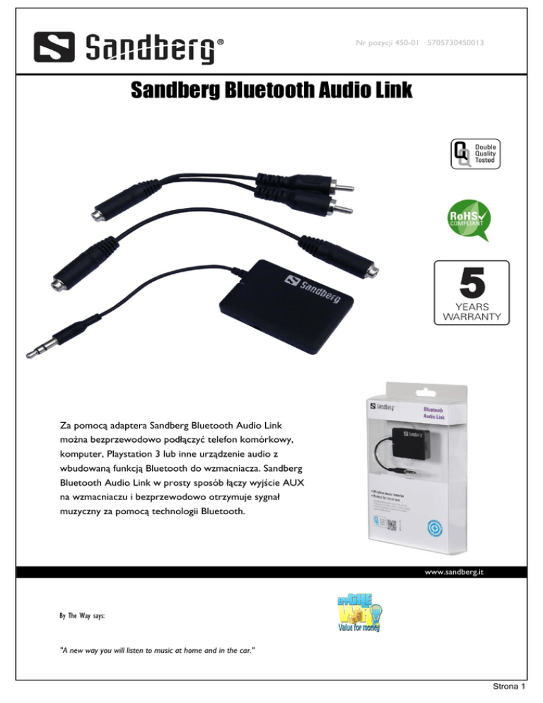 Nr pozycji 450-01 · 5705730450013 Sandberg Bluetooth Audio Link Za pomocą adaptera Sandberg Bluetooth Audio Link można bezprzewodowo podłączyć telefon komórkowy, komputer, Playstation 3 lub inne urządzenie audio z wbudowaną funkcją Bluetooth do wzmacniacza. Sandberg Bluetooth Audio Link w prosty sposób łączy wyjście AUX na wzmacniaczu i bezprzewodowo otrzymuje sygnał muzyczny za pomocą technologii Bluetooth. www.sandberg.it By The Way says: "A new way you will listen to music at home and in the car." Strona 1 Nr pozycji 450-01 · 5705730450013 Dane techniczne Opis: Sandberg Bluetooth Audio Link //Audio/Bluetooth EAN 5705730450013 Bluetooth profiles: A2DP and AVRCP Operating distance: 10 metres Bluetooth frequency range: 2.4 GHz-2.4835 GHz Output: 3.5 mm MiniJack male, line signal 100 mV Rechargeable 250 mAh Li-polymer battery Working time: Up to 12 hours Standby time: Up to 230 hours Charging time: About 2.5 hours Charging input: USB DC 5V/ 300mA Can work and charge simultaneously Informacje o opakowaniu 1 Sandberg Bluetooth Audio Link 1 MiniJack female to 2 x RCA male adapter cable 10 cm Wymiary Opakowanie wysokość: 19,0 cm Opakowanie szerokość: 11,3 cm Opakowanie głębokość: 2,7 cm Opakowanie masa: 106 g Produkt wysokość: 0,7 cm Produkt szerokość: 4,5 cm Produkt głębokość: 3,3 cm Produkt masa: 15 g Łącza Produkt strona: http://www.sandberg.it/product/bluetooth-audio-link Helpdesk strona: http://www.sandberg.it/support/bluetooth-audio-link Pobierz duże zdjęcie: http://files.sandberg.it/products/images/lg/450-01_lg.jpg Pobierz PDF: http://files.sandberg.it/products/pdf/450-01pl.pdf www.sandberg.it Dealer Strona 2