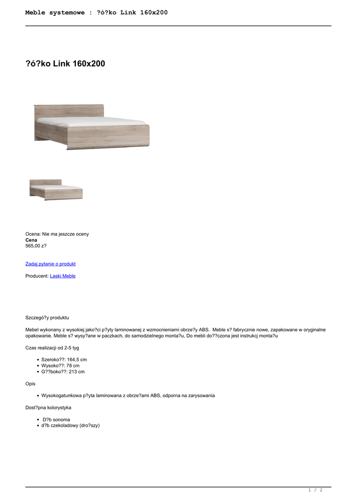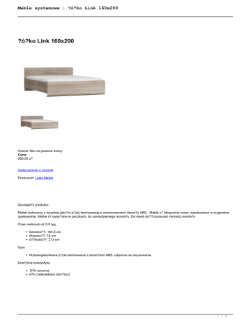 Meble systemowe : ?ó?ko Link 160x200 ?ó?ko Link 160x200 Ocena: Nie ma jeszcze oceny Cena 565,00 z? Zadaj pytanie o produkt Producent: Laski Meble Szczegó?y produktu Mebel wykonany z wysokiej jako?ci p?yty laminowanej z wzmocnieniami obrze?y ABS. Meble s? fabrycznie nowe, zapakowane w oryginalne opakowanie. Meble s? wysy?ane w paczkach, do samodzielnego monta?u, Do mebli do??czona jest instrukcj monta?u Czas realizacji od 2-5 tyg Szeroko??: 164,5 cm Wysoko??: 78 cm G??boko??: 213 cm Opis Wysokogatunkowa p?yta laminowana z obrze?ami ABS, odporna na zarysowania Dost?pna kolorystyka D?b sonoma d?b czekoladowy (dro?szy) 1 / 2 Meble systemowe : ?ó?ko Link 160x200 Opinie Nikt jeszcze nie ocenia? tego produktu. 2 / 2 Powered by TCPDF (www.tcpdf.org)