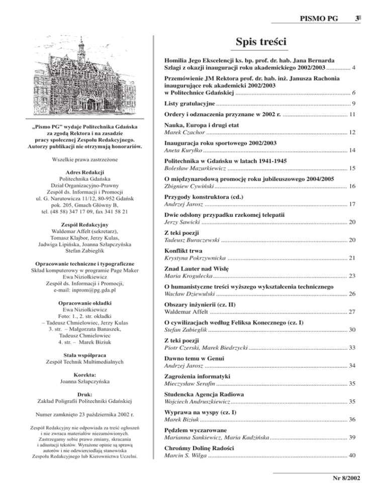 PISMO PG 3 Spis treci Homilia Jego Ekscelencji ks. bp. prof. dr. hab. Jana Bernarda Szlagi z okazji inauguracji roku akademickiego 2002/2003 ............... 4 Przemówienie JM Rektora prof. dr. hab. in¿. Janusza Rachonia inauguruj¹ce rok akademicki 2002/2003 w Politechnice Gdañskiej ....................................................................... 6 Listy gratulacyjne ................................................................................... 9 Ordery i odznaczenia przyznane w 2002 r. ........................................ 11 Pismo PG wydaje Politechnika Gdañska za zgod¹ Rektora i na zasadzie pracy spo³ecznej Zespo³u Redakcyjnego. Autorzy publikacji nie otrzymuj¹ honorariów. Nauka, Europa i drugi etat Marek Czachor ....................................................................................... 12 Wszelkie prawa zastrze¿one Politechnika w Gdañsku w latach 1941-1945 Boles³aw Mazurkiewicz .......................................................................... 15 Adres Redakcji Politechnika Gdañska Dzia³ Organizacyjno-Prawny Zespó³ ds. Informacji i Promocji ul. G. Narutowicza 11/12, 80-952 Gdañsk pok. 205, Gmach G³ówny B, tel. (48 58) 347 17 09, fax 341 58 21 Zespó³ Redakcyjny Waldemar Affelt (sekretarz), Tomasz Klajbor, Jerzy Kulas, Jadwiga Lipiñska, Joanna Sz³apczyñska Stefan Zabieglik Opracowanie techniczne i typograficzne Sk³ad komputerowy w programie Page Maker Ewa Nizio³kiewicz Zespó³ ds. Informacji i Promocji, e-mail: [email protected] Opracowanie ok³adki Ewa Nizio³kiewicz Foto: 1., 2. str. ok³adki Tadeusz Chmielowiec, Jerzy Kulas 3. str. Ma³gorzata Banaszek, Tadeusz Chmielowiec 4. str. Marek Biziuk Sta³a wspó³praca Zespó³ Technik Multimedialnych Inauguracja roku sportowego 2002/2003 Aneta Kury³ko ......................................................................................... 14 O miêdzynarodow¹ promocjê roku jubileuszowego 2004/2005 Zbigniew Cywiñski .................................................................................. 16 Przygody konstruktora (cd.) Andrzej Jarosz ........................................................................................ 17 Dwie ods³ony przypadku rzekomej telepatii Jerzy Sawicki .......................................................................................... 20 Z teki poezji Tadeusz Buraczewski .............................................................................. 20 Konflikt trwa Krystyna Pokrzywnicka .......................................................................... 21 Znad Lauter nad Wis³ê Maria Krogulecka ................................................................................... 23 O humanistyczne treci wy¿szego wykszta³cenia technicznego Wac³aw Dziewulski ................................................................................. 26 Obszary in¿ynierii (cz. II) Waldemar Affelt ..................................................................................... 27 O cywilizacjach wed³ug Feliksa Konecznego (cz. I) Stefan Zabieglik ...................................................................................... 30 Z teki poezji Piotr Czerski, Marek Biedrzycki ............................................................. 33 Dawno temu w Genui Andrzej Jarosz ........................................................................................ 34 Korekta: Joanna Sz³apczyñska Zagro¿enia informatyki Mieczys³aw Serafin ................................................................................. 35 Druk: Zak³ad Poligrafii Politechniki Gdañskiej Studencka Agencja Radiowa Wojciech Andruszkiewicz ........................................................................ 35 Numer zamkniêto 23 padziernika 2002 r. Wyprawa na wyspy (cz. I) Marek Biziuk ........................................................................................... 36 Zespó³ Redakcyjny nie odpowiada za treæ og³oszeñ i nie zwraca materia³ów niezamówionych. Zastrzegamy sobie prawo zmiany, skracania i adiustacji tekstów. Wyra¿one opinie s¹ spraw¹ autorów i nie odzwierciedlaj¹ stanowiska Zespo³u Redakcyjnego lub Kierownictwa Uczelni. Pêdzlem wyczarowane Marianna Sankiewicz, Maria Kadziñska ................................................ 39 Chroñmy Dolinê Radoci Marcin S. Wilga ...................................................................................... 40 Nr 8/2002