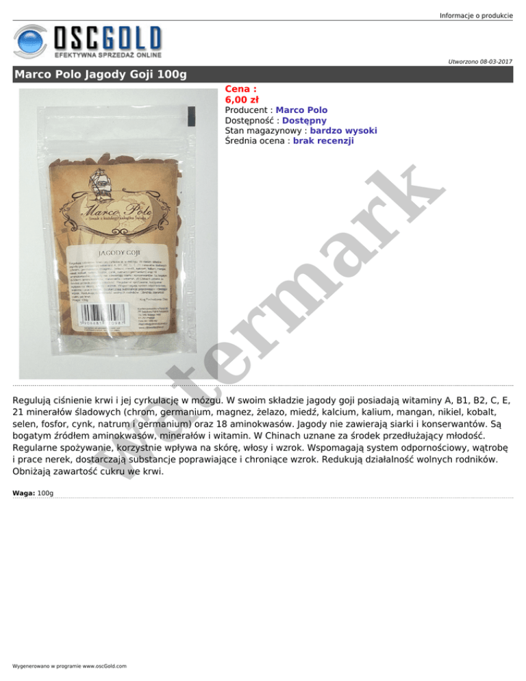 Informacje o produkcie Utworzono 08-03-2017 Marco Polo Jagody Goji 100g Cena : 6,00 zł at er m ar k Producent : Marco Polo Dostępność : Dostępny Stan magazynowy : bardzo wysoki Średnia ocena : brak recenzji w Regulują ciśnienie krwi i jej cyrkulację w mózgu. W swoim składzie jagody goji posiadają witaminy A, B1, B2, C, E, 21 minerałów śladowych (chrom, germanium, magnez, żelazo, miedź, kalcium, kalium, mangan, nikiel, kobalt, selen, fosfor, cynk, natrum i germanium) oraz 18 aminokwasów. Jagody nie zawierają siarki i konserwantów. Są bogatym źródłem aminokwasów, minerałów i witamin. W Chinach uznane za środek przedłużający młodość. Regularne spożywanie, korzystnie wpływa na skórę, włosy i wzrok. Wspomagają system odpornościowy, wątrobę i prace nerek, dostarczają substancje poprawiające i chroniące wzrok. Redukują działalność wolnych rodników. Obniżają zawartość cukru we krwi. Waga: 100g Wygenerowano w programie www.oscGold.com