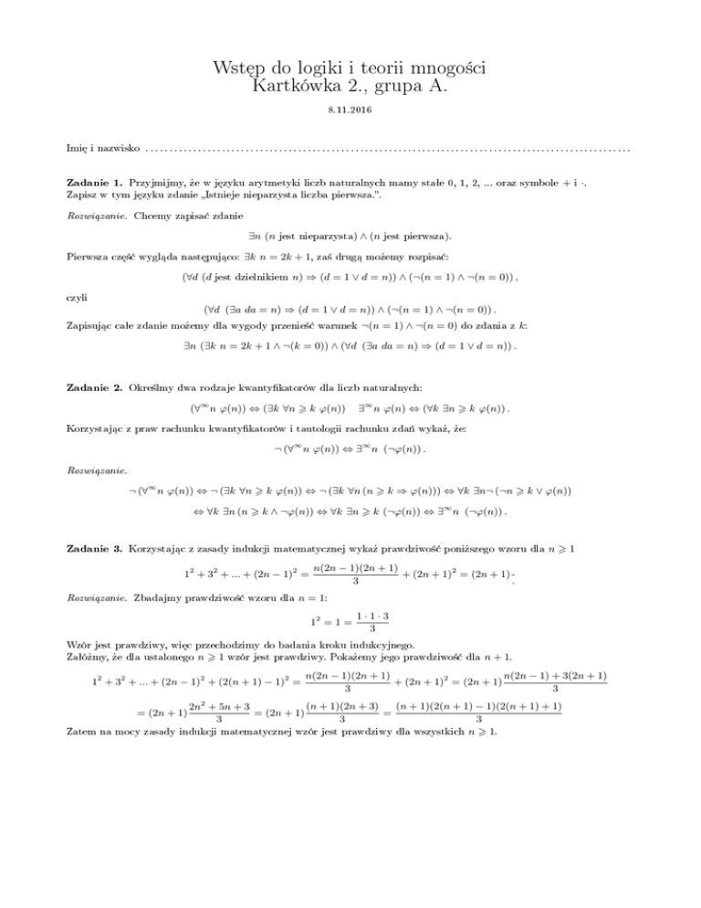 Wst¦p do logiki i teorii mnogo±ci Kartkówka 2., grupa A. 8.11.2016 Imi¦ i nazwisko . . . . . . . . . . . . . . . . . . . . . . . . . . . . . . . . . . . . . . . . . . . . . . . . . . . . . . . . . . . . . . . . . . . . . . . . . . . . . . . . . . . . . . . . . . . . . . . . . . . . . . Zadanie 1. Przyjmijmy, »e w j¦zyku arytmetyki liczb naturalnych mamy staªe 0, 1, 2, ... oraz symbole + i ·. Zapisz w tym j¦zyku zdanie Istnieje nieparzysta liczba pierwsza.. Rozwi¡zanie. Chcemy zapisa¢ zdanie ∃n (n Pierwsza cz¦±¢ wygl¡da nast¦puj¡co: (∀d (d jest nieparzysta) ∃k n = 2k + 1, jest dzielnikiem ∧ (n jest pierwsza). za± drug¡ mo»emy rozpisa¢: n) ⇒ (d = 1 ∨ d = n)) ∧ (¬(n = 1) ∧ ¬(n = 0)) , czyli (∀d (∃a da = n) ⇒ (d = 1 ∨ d = n)) ∧ (¬(n = 1) ∧ ¬(n = 0)) . Zapisuj¡c caªe zdanie mo»emy dla wygody przenie±¢ warunek ¬(n = 1) ∧ ¬(n = 0) do zdania z k: ∃n (∃k n = 2k + 1 ∧ ¬(k = 0)) ∧ (∀d (∃a da = n) ⇒ (d = 1 ∨ d = n)) . Zadanie 2. Okre±lmy dwa rodzaje kwantykatorów dla liczb naturalnych: (∀∞ n ϕ(n)) ⇔ (∃k ∀n k ϕ(n)) ∃∞ n ϕ(n) ⇔ (∀k ∃n k ϕ(n)) . Korzystaj¡c z praw rachunku kwantykatorów i tautologii rachunku zda« wyka», »e: ¬ (∀∞ n ϕ(n)) ⇔ ∃∞ n (¬ϕ(n)) . Rozwi¡zanie. ¬ (∀∞ n ϕ(n)) ⇔ ¬ (∃k ∀n k ϕ(n)) ⇔ ¬ (∃k ∀n (n k ⇒ ϕ(n))) ⇔ ∀k ∃n¬ (¬n k ∨ ϕ(n)) ⇔ ∀k ∃n (n k ∧ ¬ϕ(n)) ⇔ ∀k ∃n k (¬ϕ(n)) ⇔ ∃∞ n (¬ϕ(n)) . Zadanie 3. Korzystaj¡c z zasady indukcji matematycznej wyka» prawdziwo±¢ poni»szego wzoru dla 12 + 32 + ... + (2n − 1)2 = Rozwi¡zanie. Zbadajmy prawdziwo±¢ wzoru dla n1 n(2n − 1)(2n + 1) + (2n + 1)2 = (2n + 1) 3 . n = 1: 12 = 1 = 1·1·3 3 Wzór jest prawdziwy, wi¦c przechodzimy do badania kroku indukcyjnego. Zaªó»my, »e dla ustalonego n1 wzór jest prawdziwy. Poka»emy jego prawdziwo±¢ dla 12 + 32 + ... + (2n − 1)2 + (2(n + 1) − 1)2 = n(2n − 1)(2n + 1) n(2n − 1) + 3(2n + 1) + (2n + 1)2 = (2n + 1) 3 3 (n + 1)(2n + 3) (n + 1)(2(n + 1) − 1)(2(n + 1) + 1) 2n2 + 5n + 3 = (2n + 1) = 3 3 3 indukcji matematycznej wzór jest prawdziwy dla wszystkich n 1. = (2n + 1) Zatem na mocy zasady n + 1. Wst¦p do logiki i teorii mnogo±ci Kartkówka 2., grupa B. 8.11.2016 Imi¦ i nazwisko . . . . . . . . . . . . . . . . . . . . . . . . . . . . . . . . . . . . . . . . . . . . . . . . . . . . . . . . . . . . . . . . . . . . . . . . . . . . . . . . . . . . . . . . . . . . . . . . . . . . . . Zadanie 1. Przyjmijmy, »e w j¦zyku arytmetyki liczb naturalnych mamy staªe 0, 1, 2, ... oraz symbole + i ·. Zapisz w tym j¦zyku zdanie Istnieje parzysta liczba pierwsza.. Rozwi¡zanie. Chcemy zapisa¢ zdanie ∃n (n Pierwsza cz¦±¢ wygl¡da nast¦puj¡co: (∀d (d jest parzysta) ∃k n = 2k, jest dzielnikiem ∧ (n jest pierwsza). za± drug¡ mo»emy rozpisa¢: n) ⇒ (d = 1 ∨ d = n)) ∧ (¬(n = 1) ∧ ¬(n = 0)) , czyli (∀d (∃a da = n) ⇒ (d = 1 ∨ d = n)) ∧ (¬(n = 1) ∧ ¬(n = 0)) . Zapisuj¡c caªe zdanie mo»emy dla wygody przenie±¢ warunek ¬(n = 1) ∧ ¬(n = 0) do zdania z k: ∃n (∃k n = 2k ∧ ¬(k = 0)) ∧ (∀d (∃a da = n) ⇒ (d = 1 ∨ d = n)) . Zadanie 2. Okre±lmy dwa rodzaje kwantykatorów dla liczb naturalnych: ∀∞ n ϕ(n) ⇔ ∃k ∀n k ϕ(n) ∃∞ n ϕ(n) ⇔ ∀k ∃n k ϕ(n). Korzystaj¡c z praw rachunku kwantykatorów i tautologii rachunku zda« wyka», »e: (¬ (∃∞ n ϕ(n))) ⇔ (∀∞ n (¬ϕ(n))) . Rozwi¡zanie. ¬ (∃∞ n ϕ(n)) ⇔ ¬ (∀k ∃n k ϕ(n)) ⇔ ¬ (∀k ∃n (n k ∧ ϕ(n))) ⇔ ∃k ∀n¬ (n k ∧ ϕ(n)) ⇔ ∃k ∀n (¬n k ∨ ¬ϕ(n)) ⇔ ∃k ∀n (n k ⇒ ¬ϕ(n)) ⇔ ∃k ∀n k (¬ϕ(n)) ⇔ ∀∞ n (¬ϕ(n)) . Zadanie 3. Korzystaj¡c z zasady indukcji matematycznej wyka» prawdziwo±¢ poni»szego wzoru dla 2 13 + 23 + ... + n3 = Rozwi¡zanie. Zbadajmy prawdziwo±¢ wzoru dla 2 n (n + 1) . 4 n = 1: 13 = 1 = 12 · 22 4 Wzór jest prawdziwy, wi¦c przechodzimy do badania kroku indukcyjnego. Zaªó»my, »e dla ustalonego n1 wzór jest prawdziwy. Poka»emy jego prawdziwo±¢ dla 13 + 23 + ... + n3 + (n + 1)3 = n2 (n + 1)2 n2 + 4(n + 1) + (n + 1)3 = (n + 1)2 4 4 (n + 2)2 (n + 1)2 ((n + 1) + 1)2 n2 + 4n + 4 = (n + 1)2 = 4 4 4 matematycznej wzór jest prawdziwy dla wszystkich n 1. = (n + 1)2 Zatem na mocy zasady indukcji n + 1. n1