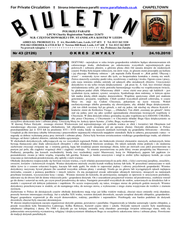 For Private Circulation † Strona internetowa parafii: www.parafialeeds.co.uk CHAPELTOWN POLSKIEJ PARAFII LPCM Charity Registration Number 213673 M.B. CZĘSTOCHOWSKIEJ I ŚW. STANISŁAWA KOSTKI W LEEDS ADRES KS. PROBOSZCZA † 6A, Harehills Lane, Leeds, LS7 4EY † Tel. 0113 262 3220 POLSKI OŚRODEK KATOLICKI † Newton Hill Road, Leeds, LS7 4JE † Tel. 0113 262 8019 Na prawach rękopisu + + + + + + + + + + + + + + + + + + + + + + + + + Ks. Proboszcz Jan Zaręba Nr 43 (2126) † OKRES ZWYKŁY † 24.10.2010 DOŻYNKI - największe w roku święto gospodarskie rolników będące ukoronowaniem ich całorocznego trudu, obchodzone po zakończeniu wszystkich najważniejszych prac polowych i zebraniu plonów, a głównie plonu zbóż. Od zarania dziejów do niedawnych czasów Polska była krajem rolniczym, nie dziw więc, że głosem ziemi przesiąkły jej kultura i jej obyczaje. Problemy rolnicze – jak napisała Zofia Kossak w: „Rok polski. Obyczaj i wiara” - zostawały żywe nawet dla tych, co bezpośrednio kontaktu z ziemią nie mieli. Żniwa stanowiły centralny punkt roku, oczekiwany z nadzieją i troska. Ogrom czasu i pracy, cała racja istnienia rolnika zależały od udanych albo nieudanych zbiorów. Uroczystości dożynkowe to nie tylko święto dziękczynienia – jak pisze ks. A. Gul, lecz również okazja uświadomienia sobie, jak wiele potrzeba harmonijnego wysiłku we współczesnym świecie, by głodnym podać chleb. Ofiarowany chleb – owoc ziemi oraz pracy rąk ludzkich – jest symbolem życia, radości, sytości, szczęścia. Symbolizuje dom rodzinny, w którym ojciec lub matka dzielą chleb między domowników. Wspólnie spożywany chleb jest znakiem gościnności, przyjaźni, wspólnoty. Chleb symbol wszystkich potrzeb człowieka, w czasie Mszy św. staje się Ciałem Chrystusa, pokarmem na życie wieczne. Wokół eucharystycznego chleba gromadzą się chrześcijanie, aby składać Bogu dziękczynienie. „Jak ten chleb rozsiany był po górach, a stał się jedno, tak niechaj się zbierze Kościół z krańców ziemi do Królestwa Twego…„ (Didache). Ten chleb „rozsiany po górach”, który stał się jedno, jawi się jako symbol zgromadzenia chrześcijan tworzących wspólnotę w Chrystusie. W dniu dożynek rolnicy gromadzą się jako wspólnota na ŁAMANIU CHLEBA, aby przez Chrystusa, z Chrystusem i w Chrystusie składać Bogu Ojcu dziękczynienie za szczęśliwe ukończenie żniw i zebrane plony. Uroczystą Mszę św. kończy śpiew hymnu: „Ciebie, Boga, wysławiamy”. W dawnej Polsce Dożynki zwanego również Wieńcowem (od najważniejszego ich symbolu wieńca ze zbóż i kwiatów) lub Okrężnem (od starodawnego obyczaju jesiennego obchodzenia, lub objeżdżania, czyli okrążania pól po sprzęcie zboża). Dożynki obchodzono w Polsce prawdopodobnie już w XVI lub na przełomie XVI i XVII wieku, kiedy na naszych ziemiach rozwinęła się gospodarka folwarczno - dworska. Urządzali ja dla żniwiarzy (służby folwarcznej i pracowników najemnych) właściciele majątków ziemskich. Była to zabawa, poczęstunek i tańce - w nagrodę za dobrze wykonaną pracę przy żniwach i zebrane plony. Żniwa były bowiem uwieńczeniem wielkiego gospodarskiego trudu, od efektów którego, od ilości i jakości zbiorów, zależała ludzka egzystencja. W obchodach dożynkowych, odbywających się we wszystkich regionach Polski, nie brakowało również elementów starszych, archaicznych, które bywają tłumaczone jako ślady odwiecznych obrzędów i ofiar składanych bóstwom urodzaju. Do takich należały różne praktyki i do niedawna zachowane zwyczaje związane np. z ostatnią garścią, kępą lub (rzadziej) pasem niezżętego zboża, które po żniwach czas jakiś pozostawiano na pustym już polu, dla ciągłości wegetacji zbóż i ciągłości urodzaju. Te ostatnie pozostawione na polu kłosy zwano przepiórką (na Mazowszu i Podlasiu), perepełką (na kresach wschodnich), brodą (we wschodniej części Mazowsza), kozą (w Małopolsce), pępem lub pępkiem (w poznańskiem); zwano je także wiązką, wiązanką lub garstką. Ścinano je bardzo uroczyście i mógł to zrobić tylko najlepszy kośnik, po czym wręczano je żniwiarkom przodownicom, aby uplotły z nich wieniec. Obchody dożynkowe rozpoczynały się bowiem wiciem wieńca, z tych właśnie pozostawionych na polu zbóż, z kiści czerwonej jarzębiny, orzechów, owoców, kwiatów i kolorowych wstążek. Wieńce dożynkowe miewały zwykle kształt wielkiej korony lub koła. W przeszłości umieszczano w nich także żywe (a z czasem sztuczne) koguty, kaczęta lub małe gąski, bo miało to zapewniać piękny i zdrowy przychówek gospodarski. Wieniec dożynkowy nazywany bywał plonem (bo uosabiał wszystkie zebrane plony i urodzaj). Niosła go na głowie lub wyciągniętych rękach najlepsza żniwiarka, czasami z pomocą parobków i innych żeńców. Za nią postępował orszak odświętnie ubranych żniwiarzy, niosących na ramionach przybrane kwiatami, wyczyszczone kosy i sierpy. Wieniec niesiono do kościoła, do poświęcenia; następnie ze śpiewem w uroczystym pochodzie, udawano się do dworu lub do domu właściciela pola - gospodarza dożynek. On z szacunkiem przyjmował wieniec od przodownicy, osobiście wnosił go do domu i ustawiał na stole, po czym prosił przodownicę do tańca. Następnie prowadził wszystkich do stołów, ustawionych na dziedzińcu lub w stodole i częstował ich dobrym jedzeniem i napitkiem. Po uczcie rozpoczynały się tańce, trwające nieraz do późnych godzin nocnych. Wieniec dożynkowy przechowywano w stodole, aż do następnego roku, do nowego siewu, a wykruszone z niego ziarna wsypywano do worków z ziarnem siewnym. Zachowane w Polsce do dzisiejszych czasów obchody dożynkowe mają więc już kilka wieków tradycji, chociaż nieco zmieniły swój charakter, przeszły bowiem interesująca ewolucję. Już u schyłku XIX wieku, wzorem dożynek dworskich, zacz
