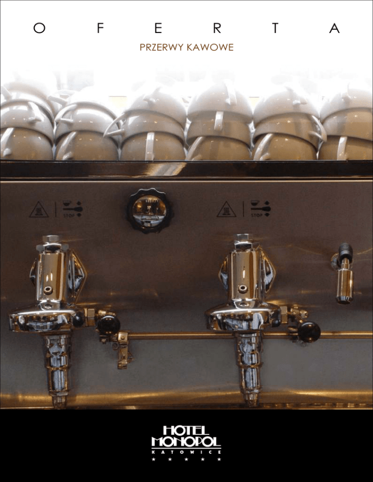 O F E R PRZERWY KAWOWE T A Przerwy kawowe - kawa, herbata: 10 zł osoba brutto - kawa, herbata, woda: 15 zł osoba brutto - kawa, herbata, ciasteczka koktajlowe własnego wypieku: 18 zł osoba brutto - kawa, herbata, woda, soki: 20 zł osoba brutto - kawa, herbata, soki, ciasteczka koktajlowe własnego wypieku: 20 zł osoba brutto - kawa, herbata, woda, soki, ciasteczka koktajlowe własnego wypieku: 25 zł osoba brutto - kawa, herbata, woda, soki, ciasteczka koktajlowe własnego wypieku, owoce: 33 zł osoba brutto - kawa, herbata, woda, soki, ciasteczka koktajlowe własnego wypieku, kanapki (3 szt./osoba): 37 zł osoba brutto - kawa, herbata, woda, soki, ciasteczka koktajlowe własnego wypieku, kanapki (3 szt./osoba), owoce: 45 zł osoba brutto Przerwy kawowe ciągłe a. czas trwania do 4 godzin: - kawa, herbata: 20 zł osoba brutto - kawa, herbata, woda: 30 zł osoba brutto - kawa, herbata, woda, soki: 40 zł osoba brutto - kawa, herbata, woda, soki, ciasteczka koktajlowe własnego wypieku: 50 zł osoba brutto b. czas trwania do 8 godzin: - kawa, herbata: 25 zł osoba brutto - kawa, herbata, woda: 40 zł osoba brutto - kawa, herbata, woda, soki: 50 zł osoba brutto - kawa, herbata, woda, soki, ciasteczka koktajlowe własnego wypieku: 65 zł osoba brutto HOTEL MONOPOL ul. Dworcowa 5, 40-012 Katowice tel. 32/ 782 82 82, fax. 32/ 782 82 83 mail.: [email protected] Piotr Dyduch, Manager ds. konferencji tel. 32/ 782 82 18, fax. 32/ 782 82 83 tel. kom. 0 602 432 971 mail.: [email protected] Dariusz Ziemiański, Manager Restauracji tel. 32/ 782 82 12, fax. 32/ 782 82 83 tel. kom. 0 600 909 920 mail.: [email protected] www.lhr.com.pl www.monopolkatowice.hotel.com.pl book online: www.hotel.com.pl www.lhr.com.pl
