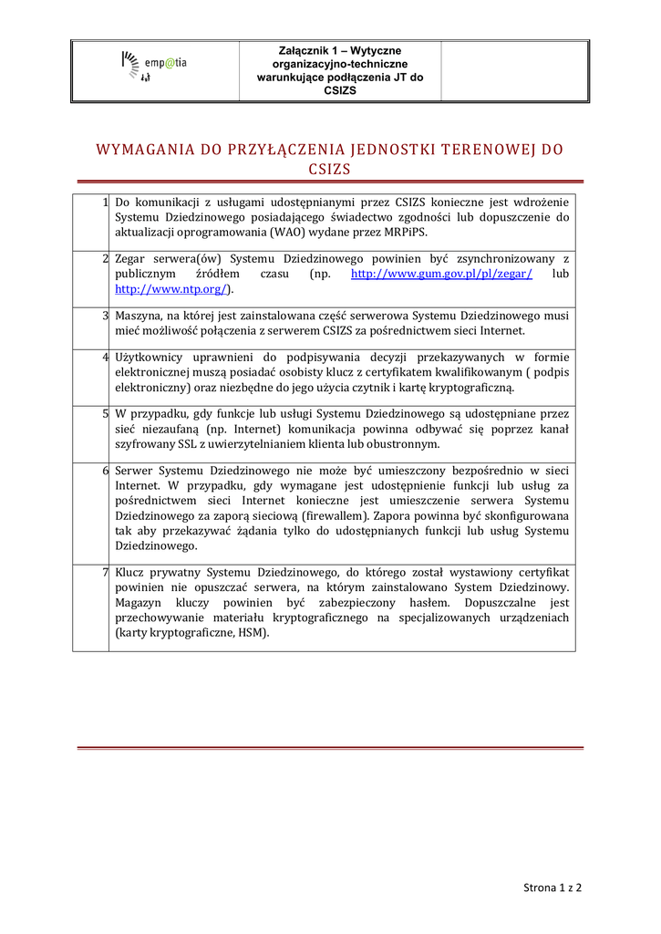 Załącznik 1 – Wytyczne organizacyjno-techniczne warunkujące podłączenia JT do CSIZS WYMAGANIA DO PRZYŁĄCZENIA JEDNOSTKI TERENOWEJ DO CSIZS 1. Do komunikacji z usługami udostępnianymi przez CSIZS konieczne jest wdrożenie Systemu Dziedzinowego posiadającego świadectwo zgodności lub dopuszczenie do aktualizacji oprogramowania (WAO) wydane przez MRPiPS. 2. Zegar serwera(ów) Systemu Dziedzinowego powinien być zsynchronizowany z publicznym źródłem czasu (np. http://www.gum.gov.pl/pl/zegar/ lub http://www.ntp.org/). 3. Maszyna, na której jest zainstalowana część serwerowa Systemu Dziedzinowego musi mieć możliwość połączenia z serwerem CSIZS za pośrednictwem sieci Internet. 4. Użytkownicy uprawnieni do podpisywania decyzji przekazywanych w formie elektronicznej muszą posiadać osobisty klucz z certyfikatem kwalifikowanym ( podpis elektroniczny) oraz niezbędne do jego użycia czytnik i kartę kryptograficzną. 5. W przypadku, gdy funkcje lub usługi Systemu Dziedzinowego są udostępniane przez sieć niezaufaną (np. Internet) komunikacja powinna odbywać się poprzez kanał szyfrowany SSL z uwierzytelnianiem klienta lub obustronnym. 6. Serwer Systemu Dziedzinowego nie może być umieszczony bezpośrednio w sieci Internet. W przypadku, gdy wymagane jest udostępnienie funkcji lub usług za pośrednictwem sieci Internet konieczne jest umieszczenie serwera Systemu Dziedzinowego za zaporą sieciową (firewallem). Zapora powinna być skonfigurowana tak aby przekazywać żądania tylko do udostępnianych funkcji lub usług Systemu Dziedzinowego. 7. Klucz prywatny Systemu Dziedzinowego, do którego został wystawiony certyfikat powinien nie opuszczać serwera, na którym zainstalowano System Dziedzinowy. Magazyn kluczy powinien być zabezpieczony hasłem. Dopuszczalne jest przechowywanie materiału kryptograficznego na specjalizowanych urządzeniach (karty kryptograficzne, HSM). Strona 1 z 2 Załącznik 1 – Wytyczne organizacyjno-techniczne warunkujące podłączenia JT do CSIZS WYMAGANIA W TRAKCIE UŻYTKOWANIA CSIZS PR ZEZ UŻYTKOWNIKÓW I SYSTEMY DZIEDZINOWE JEDNOSTKI TERENOWEJ 1. Administrator Jednostki Terenowej musi przekazać dane umożliwiające zalogowanie (login i hasło) użytkownikom kont założonych w Module Zarządzania Tożsamością CSIZS w sposób uniemożliwiający ich przechwycenie (np. osobiście etc). 2. Użytkownik zarejestrowany w Module Zarządzania Tożsamością CSIZS musi powiadomić administratora właściwej jednostki terenowej w przypadku utraty hasła. Administrator jednostki terenowej dokonuje w Module Zarządzania Tożsamością CSIZS zmiany jego hasła. Nowe hasło przekazywane jest do użytkownika w sposób uniemożliwiający przechwycenie. 3. Użytkownik zarejestrowany w Module Zarządzania Tożsamością CSIZS musi niezwłocznie zmienić swoje hasło w przypadku jego ujawnienia (np. opublikowania hasła do wiadomości innych pracowników) 4. W przypadku zaginięcia lub ujawnienia klucza prywatnego Systemu Dziedzinowego administrator Jednostki Terenowej musi niezwłocznie pozyskać nowy certyfikat CSIZS. 5. Dostęp do wrażliwych funkcji Systemu Dziedzinowego oraz danych przez niego przetwarzanych lub przesyłanych musi być możliwy wyłącznie po uwierzytelnieniu. 6. Użytkownicy Systemu Dziedzinowego muszą posiadać indywidualne konta w Systemie Dziedzinowym. Zasady tworzenia hasła mają być zgodne z ROZPORZĄDZENIEM MINISTRA SPRAW WEWNĘTRZNYCH I ADMINISTRACJI1) z dnia 29 kwietnia 2004 r. w sprawie dokumentacji przetwarzania danych osobowych oraz warunków technicznych i organizacyjnych, jakim powinny odpowiadać urządzenia i systemy informatyczne służące do przetwarzania danych osobowych 7. Zdarzenia udostępnienia danych i funkcji Systemu Dziedzinowego użytkownikom powinny być rejestrowane i przechowywane w postaci elektronicznej przez okres 5 lat. 8. Administrator Jednostki Terenowej nie może zakładać w Module Zarządzania Tożsamością CSIZS kont dla nieuprawnionych osób (niezwiązanych odpowiednią umową z Jednostką Terenową). 9. Administrator jednostki powinien przypisywać użytkownikom w Module Zarządzania Tożsamością CSIZS najmniejszy zestaw ról wymaganych do realizacji obowiązków. Strona 2 z 2