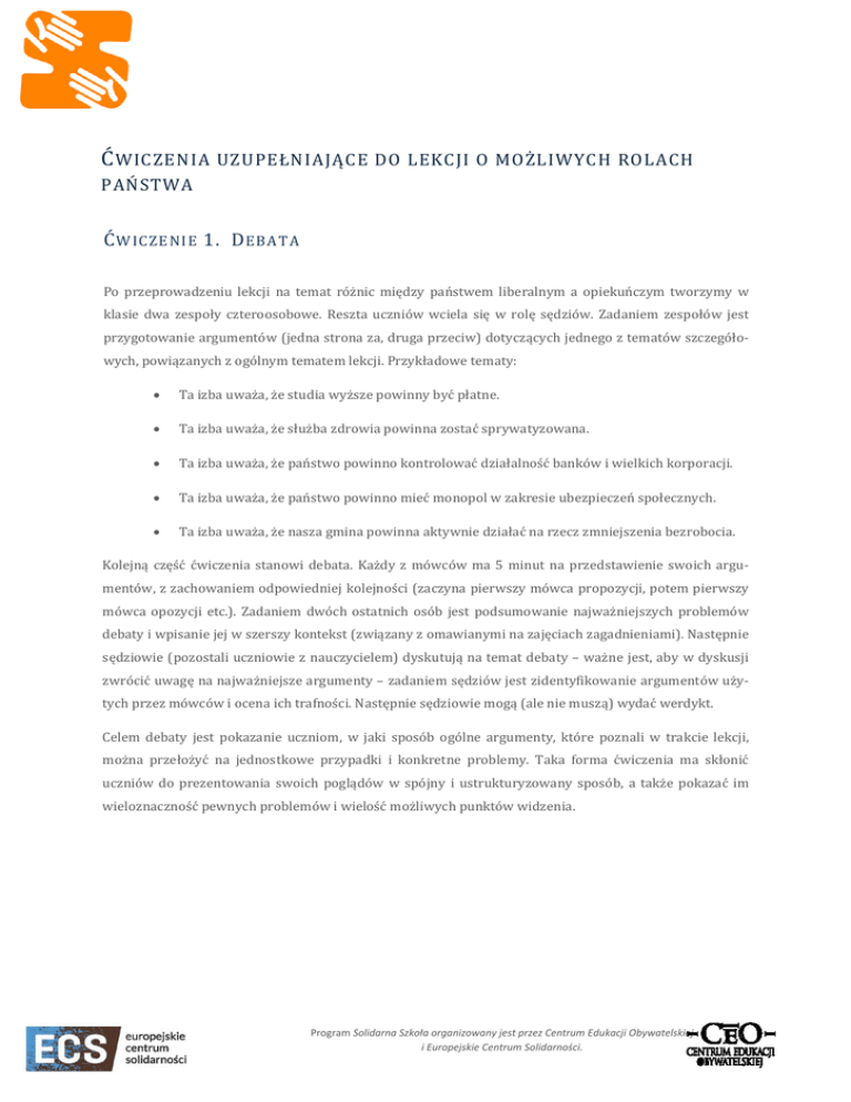 Ć WICZENIA UZUPEŁNIAJĄCE DO LEKCJI O MOŻLIWYCH ROLACH PAŃSTWA Ć WICZENIE 1. D EBATA Po przeprowadzeniu lekcji na temat różnic między państwem liberalnym a opiekuńczym tworzymy w klasie dwa zespoły czteroosobowe. Reszta uczniów wciela się w rolę sędziów. Zadaniem zespołów jest przygotowanie argumentów (jedna strona za, druga przeciw) dotyczących jednego z tematów szczegółowych, powiązanych z ogólnym tematem lekcji. Przykładowe tematy: • • • • • Ta izba uważa, że studia wyższe powinny być płatne. Ta izba uważa, że służba zdrowia powinna zostać sprywatyzowana. Ta izba uważa, że państwo powinno kontrolować działalność banków i wielkich korporacji. Ta izba uważa, że państwo powinno mieć monopol w zakresie ubezpieczeń społecznych. Ta izba uważa, że nasza gmina powinna aktywnie działać na rzecz zmniejszenia bezrobocia. Kolejną część ćwiczenia stanowi debata. Każdy z mówców ma 5 minut na przedstawienie swoich argu- mentów, z zachowaniem odpowiedniej kolejności (zaczyna pierwszy mówca propozycji, potem pierwszy mówca opozycji etc.). Zadaniem dwóch ostatnich osób jest podsumowanie najważniejszych problemów debaty i wpisanie jej w szerszy kontekst (związany z omawianymi na zajęciach zagadnieniami). Następnie sędziowie (pozostali uczniowie z nauczycielem) dyskutują na temat debaty – ważne jest, aby w dyskusji zwrócić uwagę na najważniejsze argumenty – zadaniem sędziów jest zidentyfikowanie argumentów uży- tych przez mówców i ocena ich trafności. Następnie sędziowie mogą (ale nie muszą) wydać werdykt. Celem debaty jest pokazanie uczniom, w jaki sposób ogólne argumenty, które poznali w trakcie lekcji, można przełożyć na jednostkowe przypadki i konkretne problemy. Taka forma ćwiczenia ma skłonić uczniów do prezentowania swoich poglądów w spójny i ustrukturyzowany sposób, a także pokazać im wieloznaczność pewnych problemów i wielość możliwych punktów widzenia. Program Solidarna Szkoła organizowany jest przez Centrum Edukacji Obywatelskiej i Europejskie Centrum Solidarności. Ć WICZENIE 2. „O D Ś CIANY DO ŚCIAN Y ” Ćwiczenie można wykonać z uczniami przed albo po realizacji scenariusza lekcji. Do jego organizacji po- trzebujemy w miarę pustej przestrzeni (np. sali lekcyjnej, w której nie stoją ławki, korytarza w szkole, sali gimnastycznej). Uczniowie ustawiają się na środku pomieszczenia. Osoba prowadząca ćwiczenie czyta z kartki stwierdzenia, do których uczniowie muszą się ustosunkować poprzez ustawienie się między jedną a drugą ścianą (w zależności od tego, do jakiego stopnia zgadzają się z tezą). Proponowane tezy (na podstawie materiału A. Pawlickiego): • • • • • • • • • • • • • • tworzenie zakładów pracy i zarządzanie nimi to zadanie dla państwa świadczenie usług lekarskich to zadanie dla państwa tworzenie szkół i zarządzanie nimi to zadanie dla państwa zapewnienie bezpieczeństwa na ulicach to zadanie dla państwa regulowanie spraw związanych z ochroną środowiska naturalnego to zadanie dla państwa pomoc osobom w trudnej sytuacji materialnej np. bezrobotnym to zadanie dla państwa budowa i sprzeda¿ mieszkań to zadanie dla państwa zarz¹dzanie bankami i sektorem finansowym to zadanie dla państwa opieka nad osobami starszymi i niedołężnymi to zadanie dla państwa aktywne uczestnictwo w grze rynkowej to zadanie dla państwa wyrównywanie szans ludzi pochodzących z różnych środowisk społecznych to zadanie dla państwa finansowanie badań naukowych to zadanie dla państwa tworzenie infrastruktury komunikacyjnej (np. autostrad) to zadanie dla państwa ubezpieczenia emerytalne to zadanie dla państwa Ćwiczenie ma na celu pokazanie uczniom różnorodności poglądów na dane problemy oraz braku oczywi- stych rozstrzygnięć. Program Solidarna Szkoła organizowany jest przez Centrum Edukacji Obywatelskiej i Europejskie Centrum Solidarności.