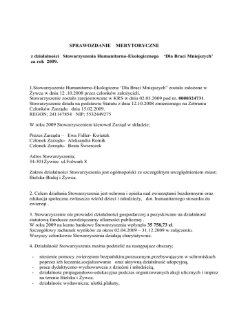 SPRAWOZDANIE MERYTORYCZNE z działalności Stowarzyszenia Humanitarno-Ekologicznego za rok 2009. ‘Dla Braci Mniejszych’ 1.Stowarzyszenie Humanitarno-Ekologiczne ‘Dla Braci Mniejszych” zostało założone w Żywcu w dniu 12 .10.2008 przez członków założycieli. Stowarzyszenie zostało zarejestrowane w KRS w dniu 02.03.2009 pod nr. 0000324731. Stowarzyszenie działa na podstawie Statutu z dnia 12.10.2008 zmienionego na Zebraniu Członków Zarządu dnia 15.02.2009. REGON; 241147854 NIP; 5532449275 W roku 2009 Stowarzyszeniem kierował Zarząd w składzie; Prezes Zarządu – Ewa Fidler- Kwiatek Członek Zarządu- Aleksandra Romik Członek Zarządu- Beata Świerczek Adres Stowarzyszenia; 34-301 Żywiec ul.Folwark 8 Zakres działalności Stowarzyszenia jest ogólnopolski ze szczególnym uwzględnieniem miast; Bielska-Białej i Żywca. 2. Celem działania Stowarzyszenia jest ochrona i opieka nad zwierzętami bezdomnymi oraz edukacja społeczna zwłaszcza wśród dzieci i młodzieży, dot. humanitarnego stosunku do zwierząt . 3. Stowarzyszenie nie prowadzi działalności gospodarczej a pozyskiwane na działalność statutową fundusze zawdzięczamy ofiarności publicznej . W roku 2009 na konto bankowe Stowarzyszenia wpłynęło 35 758,73 zł. Szczegółowy rachunek wyników za okres 02.04.2009 – 31.12.2009 w załączeniu. Wszyscy członkowie Stowarzyszenia działają charytatywnie. 4. Działalność Stowarzyszenia można podzielić na następujace obszary; - niesienie pomocy zwierzętom bezpańskim,porzuconym,przebywającym w schroniskach poprzez ich leczenie,socjalizowanie oraz aktywną działalność adopcyjną, praca dydaktyczno-wychowawcza z dziećmi i młodzieżą, działalnośc propagandowo-edukacyjna podczas organizowanych akcji ulicznych i imprez na terenie Bielska i Żywca. działalnośc wydawnicza; ulotki,plakaty, Zwalczanie bezdomności zwierząt to jedno z priorytetowych zadań Stowarzyszenia. Dzięki zaangażowaniu i ogromnej pracy osób zajmujacych się adopcjami, znaleziono nowe domy 78 psom i kotom. Często były to zwierzęta wymagające wcześniej kosztownego leczenia, rehabilitacji a nie rzadko długiego pobytu stacjonarnego w lecznicy czy Domu Tymczasowym. Staramy się również by wydawane do adopcji zwierzęta były na koszt Stowarzyszenia szczepione, sterylizowane i kastrowane. Należy podkreslić szczególnie dobrze układającą się współpracę z Kierownictwem Schroniska dla Bezdomnych Zwierzat w Żywcu, dzieki ktorej wiekszośc wyadoptowanych zwierząt pochodziła z tego własnie Schroniska. W 2009r. przeprowadzone zostały w 24 spotkania z młodzieżą szkolną i 6 spotkań z przedszkolakami . W zależności od grupy wiekowej dzieci, tematyka spotkań dotyczyła nauki bezpiecznego zachowania w kontakcie z psem,kotem a także kształtowanie wrażliwości na los zwierząt /metamorfozy/ jak też popularyzowanie idei kontrolowanego ich rozmnażania. Zebrana przez dzieci karma dla zwierząt, koce, miski itp. przekazana została Schronisku w Żywcu. W ramach działalności propagandowo-edukacyjnej Stowarzyszenie zaprezentowało swój dorobek na stoisku podczas Tygodnia Kultury Beskidzkiej w Żywcu /5,7,9 sierpnia 2009r./ Wolontariuszom towarzyszyły psy ze Schroniska w Żywcu, zwracając w ten sposób uwagę na problem zwierząt bezdomnych. Rozdawane były również ulotki zachęcajace do odpowiedzialnej adopcji zwierząt schroniskowych,a także uwrażliwiające na problem przemocy wobec nich jak również promujące kastrację i sterylizację. 4 pazdziernika 2009 Stowarzyszenie dolączyło do ogólnopolskiej akcji’Zerwijmy Łańcuchy’ ustawiając swoje stoisko na żywieckim rynku. Najwazniejszym publicznym wydarzeniem minionego roku był całodniowy „Festyn dla Braci Mniejszych”, który odbył się 25 pazdziernika na terenie Parku Miejskiego w Żywcu. Głównym celem festynu poprzez liczne konkursy i zabawę, było uświadomienie zgromadzonym dzieciom i dorosłym jak winno się traktować zwierzęta i zapobiegać ich bezdomności. W roku 2009 w Stowarzyszeniu nie przeprowadzona została żadna kontrola. Zarząd podjał … Uchwał. Żywiec, dnia 4 kwietnia 2009r.