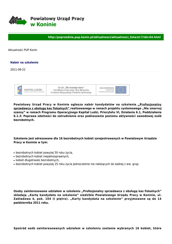 http://poprzednia.pup.konin.pl/aktualnosci/aktualnosci_lista/st:7/idn:64.html Aktualności PUP Konin Nabór na szkolenie 2011-09-22 Powiatowy Urząd Pracy w Koninie ogłasza nabór kandydatów na szkolenie „Profesjonalny sprzedawca z obsługą kas fiskalnych” realizowanego w ramach projektu systemowego „Nie zmarnuj szansy” w ramach Programu Operacyjnego Kapitał Ludzi, Priorytetu VI, Działania 6.1, Poddziałania 6.1.3: Poprawa zdolności do zatrudnienia oraz podnoszenie poziomu aktywności zawodowej osób bezrobotnych. Szkolenie jest adresowane dla 16 bezrobotnych kobiet zarejestrowanych w Powiatowym Urzędzie Pracy w Koninie w tym: ● ● ● ● bezrobotnych kobiet powyżej 50 roku życia, bezrobotnych kobiet niepełnosprawnych, kobiet długotrwale bezrobotnych, bezrobotnych kobiet powyżej 25 roku życia jednocześnie nie należących do żadnej z ww. grup. Osoby zainteresowane udziałem w szkoleniu „Profesjonalny sprzedawca z obsługą kas fiskalnych” składają „Kartę kandydata na szkolenie” siedzibie Powiatowego Urzędu Pracy w Koninie, ul. Zakładowa 4, pok. 104 (I piętro). „Karty kandydata na szkolenie” przyjmowane są do 14 października 2011 roku. Spośród osób zainteresowanych udziałem w szkoleniu zostanie wybranych 16 kobiet, które zakwalifikują się do udziału w projekcie „Nie zmarnuj szansy”. Lista kryteriów na podstawie których będzie dokonana weryfikacja złożonych „Kart kandydata na szkolenie”, dostępna jest w siedzibie Powiatowego Urzędu Pracy w Koninie. W 2011 roku w projekcie „Nie zmarnuj szansy” nie mogą brać udziału osoby bezrobotne, które uczestniczyły w omawianym projekcie w poprzednich latach jego realizacji. Nazwa pliku Rozmiar Pobierz Kategoria: Powiązane pliki [ 1 ] Karta kandydata na szkolenie powrót 81KB pobierz