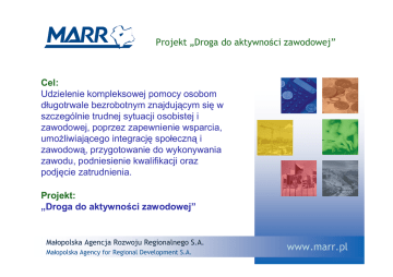 Projekt „Droga do aktywności zawodowej” Cel: Udzielenie kompleksowej pomocy osobom długotrwale bezrobotnym znajdującym się w szczególnie trudnej sytuacji osobistej i zawodowej, poprzez zapewnienie wsparcia, umoŜliwiającego integrację społeczną i zawodową, przygotowanie do wykonywania zawodu, podniesienie kwalifikacji oraz podjęcie zatrudnienia. Projekt: „Droga do aktywności zawodowej” Małopolska Agencja Rozwoju Regionalnego S.A. Małopolska Agency for Regional Development S.A. www.marr.pl Projekt „Droga do aktywności zawodowej” „Droga do aktywności zawodowej” Projekt realizowany przez MAŁOPOLSKĄ AGENCJĘ ROZWOJU REGIONALNEGO S.A. – Departament Rozwoju Przedsiębiorczości i Kształcenia Kadr w ramach Sektorowego Programu Operacyjnego Rozwój Zasobów Ludzkich Działanie 1.5 „Promocja aktywnej polityki społecznej poprzez wsparcie grup szczególnego ryzyka”, współfinansowany w 99% z Europejskiego Funduszu Społecznego Małopolska Agencja Rozwoju Regionalnego S.A. Małopolska Agency for Regional Development S.A. www.marr.pl Projekt „Droga do aktywności zawodowej” BudŜet projektu: Wydatki kwalifikowane ogółem: 889 518,00 zł brutto Wnioskowana kwota dofinansowania: 880 622,82 zł brutto Wkład własny: 8 895,18 zł brutto Małopolska Agencja Rozwoju Regionalnego S.A. Małopolska Agency for Regional Development S.A. www.marr.pl Projekt „Droga do aktywności zawodowej” Okres wdraŜania projektu: 01.08.2007 – 31.03.2008 ZałoŜenia projektu: Projekt stanowi ofertę dla 250 osób długotrwale bezrobotnych, zarejestrowanych powyŜej 24 miesięcy w Powiatowych Urzędach Pracy, zamieszkałych na terenie województwa małopolskiego. Małopolska Agencja Rozwoju Regionalnego S.A. Małopolska Agency for Regional Development S.A. www.marr.pl Projekt „Droga do aktywności zawodowej” Działania: Doradztwo zawodowe (indywidualne, grupowe) Szkolenia zawodowe Pośrednictwo pracy Działania dodatkowe Małopolska Agencja Rozwoju Regionalnego S.A. Małopolska Agency for Regional Development S.A. www.marr.pl Projekt „Droga do aktywności zawodowej” Doradztwo zawodowe: Etap obligatoryjny Spotkanie indywidualne: Analiza zasobów klienta (ok. 1.5 godziny) Badanie predyspozycji i preferencji zawodowych klienta. Wybór warsztatu tematycznego oraz szkolenia zawodowego (ok. 1.5 godziny) Małopolska Agencja Rozwoju Regionalnego S.A. Małopolska Agency for Regional Development S.A. www.marr.pl Projekt „Droga do aktywności zawodowej” Doradztwo zawodowe: Spotkanie grupowe: Warsztaty obligatoryjne: Techniki poszukiwania pracy – 2 dni: 2 x 6 godzin Warsztaty fakultatywne: Asertywność w kontaktach międzyludzkich – 1 dzień: 6 godzin Negocjacje i walka ze stresem – 1 dzień: 6 godzin Motywacja i zarządzanie czasem – 1 dzień: 6 godzin Małopolska Agencja Rozwoju Regionalnego S.A. Małopolska Agency for Regional Development S.A. www.marr.pl Projekt „Droga do aktywności zawodowej” Szkolenia zawodowe: MoŜliwość uzyskania nowych kwalifikacji zawodowych, udoskonalenie posiadanych umiejętności Udokumentowanie nowych kwalifikacji (certyfikaty) Indywidualnie dobrane programy szkoleń Małopolska Agencja Rozwoju Regionalnego S.A. Małopolska Agency for Regional Development S.A. www.marr.pl Projekt „Droga do aktywności zawodowej” Pośrednictwo pracy: Analiza potrzeb pracodawców Tworzenie bazy ofert pracy Tworzenie bazy danych potencjalnych kandydatek do zatrudnienia Kojarzenie beneficjentów projektu z pracodawcami Małopolska Agencja Rozwoju Regionalnego S.A. Małopolska Agency for Regional Development S.A. www.marr.pl Projekt „Droga do aktywności zawodowej” Działania dodatkowe: Zwrot kosztów przejazdu Pokrycie kosztów noclegu w przypadku gdy uczestnik projektu mieszka powyŜej 50 km od miejsca świadczenia usługi w ramach projektu Małopolska Agencja Rozwoju Regionalnego S.A. Małopolska Agency for Regional Development S.A. www.marr.pl