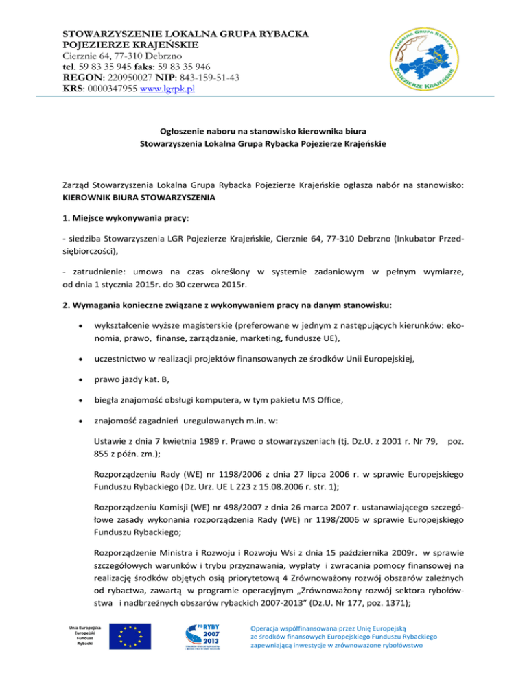 STOWARZYSZENIE LOKALNA GRUPA RYBACKA POJEZIERZE KRAJEŃSKIE Cierznie 64, 77-310 Debrzno tel. 59 83 35 945 faks: 59 83 35 946 REGON: 220950027 NIP: 843-159-51-43 KRS: 0000347955 www.lgrpk.pl Ogłoszenie naboru na stanowisko kierownika biura Stowarzyszenia Lokalna Grupa Rybacka Pojezierze Krajeńskie Zarząd Stowarzyszenia Lokalna Grupa Rybacka Pojezierze Krajeńskie ogłasza nabór na stanowisko: KIEROWNIK BIURA STOWARZYSZENIA 1. Miejsce wykonywania pracy: - siedziba Stowarzyszenia LGR Pojezierze Krajeńskie, Cierznie 64, 77-310 Debrzno (Inkubator Przedsiębiorczości), - zatrudnienie: umowa na czas określony w systemie zadaniowym w pełnym wymiarze, od dnia 1 stycznia 2015r. do 30 czerwca 2015r. 2. Wymagania konieczne związane z wykonywaniem pracy na danym stanowisku: wykształcenie wyższe magisterskie (preferowane w jednym z następujących kierunków: ekonomia, prawo, finanse, zarządzanie, marketing, fundusze UE), uczestnictwo w realizacji projektów finansowanych ze środków Unii Europejskiej, prawo jazdy kat. B, biegła znajomość obsługi komputera, w tym pakietu MS Office, znajomość zagadnień uregulowanych m.in. w: Ustawie z dnia 7 kwietnia 1989 r. Prawo o stowarzyszeniach (tj. Dz.U. z 2001 r. Nr 79, poz. 855 z późn. zm.); Rozporządzeniu Rady (WE) nr 1198/2006 z dnia 27 lipca 2006 r. w sprawie Europejskiego Funduszu Rybackiego (Dz. Urz. UE L 223 z 15.08.2006 r. str. 1); Rozporządzeniu Komisji (WE) nr 498/2007 z dnia 26 marca 2007 r. ustanawiającego szczegółowe zasady wykonania rozporządzenia Rady (WE) nr 1198/2006 w sprawie Europejskiego Funduszu Rybackiego; Rozporządzenie Ministra i Rozwoju i Rozwoju Wsi z dnia 15 października 2009r. w sprawie szczegółowych warunków i trybu przyznawania, wypłaty i zwracania pomocy finansowej na realizację środków objętych osią priorytetową 4 Zrównoważony rozwój obszarów zależnych od rybactwa, zawartą w programie operacyjnym „Zrównoważony rozwój sektora rybołówstwa i nadbrzeżnych obszarów rybackich 2007-2013” (Dz.U. Nr 177, poz. 1371); Operacja współfinansowana przez Unię Europejską ze środków finansowych Europejskiego Funduszu Rybackiego zapewniającą inwestycje w zrównoważone rybołówstwo STOWARZYSZENIE LOKALNA GRUPA RYBACKA POJEZIERZE KRAJEŃSKIE Cierznie 64, 77-310 Debrzno tel. 59 83 35 945 faks: 59 83 35 946 REGON: 220950027 NIP: 843-159-51-43 KRS: 0000347955 www.lgrpk.pl Statucie Stowarzyszenia oraz Lokalnej Strategii Rozwoju Obszarów Rybackich. 3. Wymagania pożądane: min. 2-letni staż pracy na samodzielnym stanowisku związanym z inicjowaniem i przygotowaniem wniosków o dofinansowanie ze środków unijnych, język angielski lub niemiecki w stopniu komunikatywnym, umiejętność organizacji i prowadzenia szkoleń, konferencji, spotkań informacyjnopromocyjnych, wysoka kultura osobista, umiejętność korzystania z aktów prawnych, interpretacja i analiza zmian w przepisach, predyspozycje osobowe: kreatywność, umiejętność pracy w zespole, dyspozycyjność, obsługa urządzeń biurowych, sumienność i odpowiedzialność, gotowość do wyjazdów służbowych, doświadczenie w zakresie zarządzania, kierowania zespołem, umiejętność prowadzenia negocjacji i nawiązywania kontaktów interpersonalnych. 4. Zakres czynności: Wykonywanie uchwał Walnego Zebrania Członków, Zarządu Stowarzyszenia. Nadzór nad przygotowaniem i wdrażaniem projektów w ramach LSROR. Prowadzenie bieżących spraw stowarzyszenia. Gromadzenie i udostępnianie informacji z zakresu działalności Stowarzyszenia. Prowadzenie działalności wydawniczej oraz współpraca z mediami. Przygotowywanie wewnętrznych materiałów informacyjnych i analiz problemowych. Przygotowywanie materiałów na Walne Zebranie Członków, zebrania Zarządu Stowarzyszenia. Opracowywanie projektów zmian w statucie, LSROR i regulaminach organizacyjnych. Obsługa posiedzeń Zarządu. Prowadzenie dokumentacji posiedzeń Zarządu. Sporządzanie odpisów uchwał Walnego Zebrania Członków i wydawanie ich uprawnionym Operacja współfinansowana przez Unię Europejską ze środków finansowych Europejskiego Funduszu Rybackiego zapewniającą inwestycje w zrównoważone rybołówstwo STOWARZYSZENIE LOKALNA GRUPA RYBACKA POJEZIERZE KRAJEŃSKIE Cierznie 64, 77-310 Debrzno tel. 59 83 35 945 faks: 59 83 35 946 REGON: 220950027 NIP: 843-159-51-43 KRS: 0000347955 www.lgrpk.pl organom. Prowadzenie rejestru posiedzeń Zarządu. Opracowywanie planów pracy, budżetu oraz sprawozdań merytorycznych i finansowych. Zarządzanie biurem LGR i nadzór nad zespołem (sporządzanie planów pracy). Nadzór nad budżetem LGR. Przygotowywanie wniosków o dofinansowanie w ramach działania 4.1 Funkcjonowanie lokalnej grupy działania oraz nabywanie umiejętności i aktywizacja lokalnych społeczności. Składanie wniosku o płatność w ramach działania 4.1. Udział w naradach, sympozjach, szkoleniach, uroczystościach związanych z działalnością Stowarzyszenia. Współpraca z: instytucją wdrażającą PO RYBY, Członkami LGR, wnioskodawcami LGR, zewnętrznymi ekspertami i zleceniobiorcami. Sprawowanie pieczy nad sprzętem biurowym oraz zlecanie przeprowadzenia jego konserwacji lub naprawy. Wykonywanie zaleceń pokontrolnych organów prowadzących kontrole oraz udzielanie wyczerpujących wyjaśnień wraz z przedstawieniem wszelkich dokumentów i innych materiałów dotyczących przedmiotu kontroli. Nadzór nad obsługą wniosków, udzielanie potencjalnym wnioskodawcom informacji dotyczącej przygotowania i składania wniosków o dofinansowanie. 5. Ogólny zakres odpowiedzialności: Za powierzone zadania pracownik odpowiada bezpośrednio przed Zarządem. Odpowiedzialność za prawidłowe wykonywanie budżetu. Odpowiedzialność służbowa i cywilna za powierzony sprzęt, akta i informacje. 6. Wymagane dokumenty: CV, dane kontaktowe oferenta: telefon, adres do korespondencji, adres e-mail. Oświadczenie kandydata o wyrażeniu zgody na przetwarzanie dan