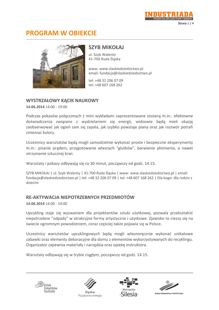 Strona 1 / 4 PROGRAM W OBIEKCIE SZYB MIKOŁAJ ul. Szyb Walenty 41-700 Ruda Śląska www: www.slaskiedziedzictwo.pl email: [email protected] tel: +48 32 206 07 09 tel: +48 607 168 262 WYSTRZAŁOWY KĄCIK NAUKOWY 14.06.2014 14:00 - 19:00 Podczas pokazów połączonych z mini wykładami zaprezentowane zostaną m.in.: efektowne doświadczenia związane z wydzielaniem się energii, widzowie będą mieli okazję zaobserwować jak ogień sam się zapala, jak szybko powstaje piana oraz jak roztwór potrafi zmieniać kolory. Uczestnicy warsztatów będą mogli samodzielnie wykonać proste i bezpieczne eksperymenty m.in.: pisanie prądem, przygotowanie własnych "glutków", barwienie płomienia, a nawet otrzymanie sztucznej krwi. Warsztaty i pokazy odbywają się co 30 minut, począwszy od godz. 14.15. SZYB MIKOŁAJ | ul. Szyb Walenty | 41-700 Ruda Śląska | www: www.slaskiedziedzictwo.pl | email: [email protected] | tel: +48 32 206 07 09 | tel: +48 607 168 262 | Dla kogo: dla rodzin z dziećmi RE-AKTYWACJA NIEPOTRZEBNYCH PRZEDMIOTÓW 14.06.2014 14:00 - 19:00 Upcykling staje się wyzwaniem dla projektantów sztuki użytkowej, pozwala przekształcić niepotrzebne "odpady" w atrakcyjne formy artystyczne i użytkowe. Zjawisko to cieszy się na świecie ogromnym powodzeniem, coraz częściej także pojawia się w Polsce. Uczestnicy warsztatów upcyklingowych będą mogli własnoręcznie wykonać unikatowe zabawki oraz elementy dekoracyjne dla domu z elementów wykorzystywanych do recyklingu. Organizator zapewnia materiały i narzędzia oraz opiekę instruktora. Warsztaty odbywają się w trybie ciągłym, począwszy od godz. 14.15. Strona 2 / 4 SZYB MIKOŁAJ | ul. Szyb Walenty | 41-700 Ruda Śląska | www: www.slaskiedziedzictwo.pl | email: [email protected] | tel: +48 32 206 07 09 | tel: +48 607 168 262 | Dla kogo: dla wszystkich ZBUDUJ SOBIE MIKOŁAJA 14.06.2014 14:00 - 19:00 Warsztaty upcyklingowe dla najmłodszych uczestników Industriady, podczas których dzieci wraz z rodzicami będą mogły zbudować model szybu "Mikołaj" z papieru i plastiku. Organizator zapewnia materiały, narzędzia oraz opiekę instruktora. SZYB MIKOŁAJ | ul. Szyb Walenty | 41-700 Ruda Śląska | www: www.slaskiedziedzictwo.pl | email: [email protected] | tel: +48 32 206 07 09 | tel: +48 607 168 262 | Dla kogo: dla rodzin z dziećmi WARSZTATY ORIGAMI 14.06.2014 14:00 - 19:00 Warsztaty tradycyjnej sztuki składania papieru. SZYB MIKOŁAJ | ul. Szyb Walenty | 41-700 Ruda Śląska | www: www.slaskiedziedzictwo.pl | email: [email protected] | tel: +48 32 206 07 09 | tel: +48 607 168 262 | Dla kogo: dla wszystkich SPACERKIEM PO "MIKOŁAJU" 14.06.2014 14:00 - 19:00 Uruchomienie zabytkowej maszyny wyciągowej połączone z wykładem na temat historii "Mikołaja", oprowadzenie gości po szybie "Mikołaj" oraz unikalna wycieczka po historycznej części elektrowni "Mikołaj" (hala maszyn, rozdzielnia 6 kV, kotłownia) - dzisiaj teren firmy Carbo Energia, na co dzień niedostępny do zwiedzania. SZYB MIKOŁAJ | ul. Szyb Walenty | 41-700 Ruda Śląska | www: www.slaskiedziedzictwo.pl | email: [email protected] | tel: +48 32 206 07 09 | tel: +48 607 168 262 | Dla kogo: dla pasjonatów techniki INDUSTRIADOWY RYNECZEK 14.06.2014 14:00 - 19:00 Strefa handlowa, gdzie będzie można kupić upominki i towary specjalnie przygotowane na tegoroczną Industraidę - m.in. ręcznie robione zapachowe świece, ręcznie robione myjki z mydełek, biżuterię, ceramikę, tkaniny. Strona 3 / 4 Atrakcją ryneczku jest piwo "Nikolaus" przygotowane spcjalnie na Industriadę i dostępne wyłącznie na terenie szybu "Mikołaj". SZYB MIKOŁAJ | ul. Szyb Walenty | 41-700 Ruda Śląska | www: www.slaskiedziedzictwo.pl | email: [email protected] | tel: +48 32 206 07 09 | tel: +48 607 168 262 | Dla kogo: dla wszystkich OCALIĆ OD ZAPOMNIENIA - WYSTAWA FOTOGRAFII 14.06.2014 14:00 - 19:00 Wystawa zdjęć przygotowanych przez pasjonatów historii pragnących dokumentować obiekty poprzemysłowe, zanim całkowicie znikną z naszych miast. Na zdjęciach zobaczymy wszelkiego rodzaju postindustrialne obiekty znajdujące się na obszarze historycznego Górnego Śląska oraz terenów bezpośrednio z nim sąsiadujących. Wystawę organizuje Stowrzyszenie Genius Loci - Duch Miejsca z Rudy Śląskiej. SZYB MIKOŁAJ | ul. Szyb Walenty | 41-700 Ruda Śląska | www: www.slaskiedziedzictwo.pl | email: [email protected] | tel: +48 32 206 07 09 | tel: +48 607 168 262 | Dla kogo: dla wszystkich ZAGADKI ZĘBATKI W KRAINIE INDU 14.06.2014 14:30 - 19:00 Zapraszamy do świata INDU, gdzie na żądnych przygody czekają tajemnice i zagadki, a dla spragnionych sztuki - pokazy taneczne w wykonaniu grupy Memento. W programie: pogadanka o steampunku, poszukiwanie maszynisty, rozwiązywanie zagadek i łamanie szyfrów, pokaz tańca, rzucanie zębatkami do celu, łowienie węgla. Zabawę organizuje Śląski Klub Fantastyki. Jeden pełny cykl zabawy odbywa się co 60 minut, począwszy od godz. 14.30; niektóre zadania będą odbywać się w sposób ciągły - można wziąć w nich udział w każdej chwili. SZYB MIKOŁAJ | ul. Szyb Walenty | 41-700 Ruda Śląska | www: www.slaskiedziedzictwo.pl | email: [email protected] | tel: +48 32 206 07 09 | tel: +48 607 168 262 | Dla kogo: dla rodzin z dziećmi FIRE SHOW 14.06.2014 18:45 - 19:00 Strona 4 / 4 Pokaz tańca z ogniem w wykonaniu grupy "Explodo". Linki do filmików grupy "Explodo" https://www.youtube.com/watch?v=u3PMZOMwnPI http://www.youtube.com/watch?v=Of7hoBI1js8 SZYB MIKOŁAJ | ul. Szyb Walenty | 41-700 Ruda Śląska | www: www.slaskiedziedzictwo.pl | email: [email protected] | tel: +48 32 206 07 09 | tel: +48 607 168 262 | Dla kogo: dla wszystkich