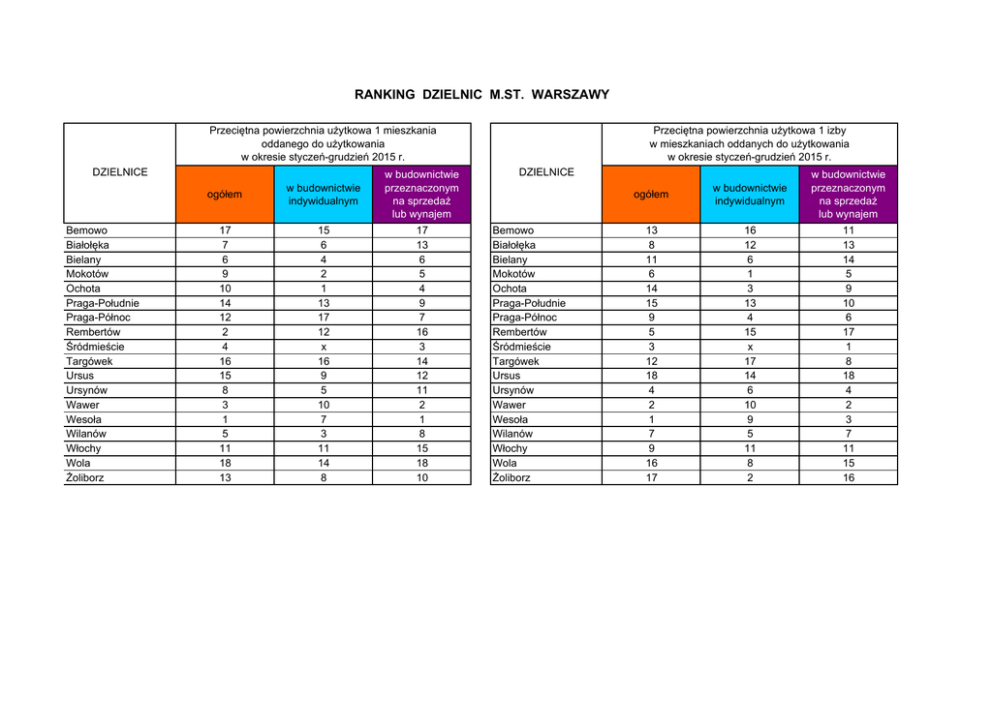 RANKING DZIELNIC M.ST. WARSZAWY Przeciętna powierzchnia użytkowa 1 mieszkania oddanego do użytkowania w okresie styczeń-grudzień 2015 r. DZIELNICE Bemowo Białołęka Bielany Mokotów Ochota Praga-Południe Praga-Północ Rembertów Śródmieście Targówek Ursus Ursynów Wawer Wesoła Wilanów Włochy Wola Żoliborz ogółem w budownictwie indywidualnym w budownictwie przeznaczonym na sprzedaż lub wynajem 17 7 6 9 10 14 12 2 4 16 15 8 3 1 5 11 18 13 15 6 4 2 1 13 17 12 x 16 9 5 10 7 3 11 14 8 17 13 6 5 4 9 7 16 3 14 12 11 2 1 8 15 18 10 Przeciętna powierzchnia użytkowa 1 izby w mieszkaniach oddanych do użytkowania w okresie styczeń-grudzień 2015 r. DZIELNICE Bemowo Białołęka Bielany Mokotów Ochota Praga-Południe Praga-Północ Rembertów Śródmieście Targówek Ursus Ursynów Wawer Wesoła Wilanów Włochy Wola Żoliborz ogółem w budownictwie indywidualnym w budownictwie przeznaczonym na sprzedaż lub wynajem 13 8 11 6 14 15 9 5 3 12 18 4 2 1 7 9 16 17 16 12 6 1 3 13 4 15 x 17 14 6 10 9 5 11 8 2 11 13 14 5 9 10 6 17 1 8 18 4 2 3 7 11 15 16
