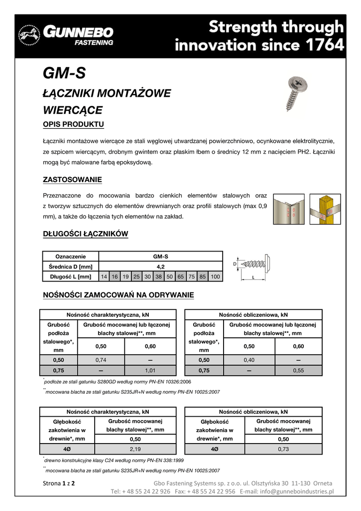 GM-S ŁĄCZNIKI MONTAŻOWE WIERCĄCE OPIS PRODUKTU Łączniki montażowe wiercące ze stali węglowej utwardzanej powierzchniowo, ocynkowane elektrolitycznie, ze szpicem wiercącym, drobnym gwintem oraz płaskim łbem o średnicy 12 mm z nacięciem PH2. Łączniki mogą być malowane farbą epoksydową. ZASTOSOWANIE Przeznaczone do mocowania bardzo cienkich elementów stalowych oraz z tworzyw sztucznych do elementów drewnianych oraz profili stalowych (max 0,9 mm), a także do łączenia tych elementów na zakład. DŁUGOŚCI ŁĄCZNIKÓW Oznaczenie GM-S Średnica D [mm] 4,2 Długość L [mm] 14 16 19 25 30 38 50 65 75 85 100 NOŚNOŚCI ZAMOCOWAŃ NA ODRYWANIE Nośność charakterystyczna, kN Grubość Grubość mocowanej lub łączonej podłoża blachy stalowej**, mm stalowego*, 0,50 0,60 0,50 0,74 — 0,75 — 1,01 mm Nośność obliczeniowa, kN Grubość Grubość mocowanej lub łączonej podłoża blachy stalowej**, mm stalowego*, 0,50 0,60 0,50 0,40 — 0,75 — 0,55 mm * podłoże ze stali gatunku S280GD według normy PN-EN 10326:2006 ** mocowana blacha ze stali gatunku S235JR+N według normy PN-EN 10025:2007 Nośność charakterystyczna, kN Nośność obliczeniowa, kN Głębokość Grubość mocowanej Głębokość Grubość mocowanej zakotwienia w blachy stalowej**, mm zakotwienia w blachy stalowej**, mm drewnie*, mm 0,50 drewnie*, mm 0,50 4Ø 2,19 4Ø 0,73 * drewno konstrukcyjne klasy C24 według normy PN-EN 338:1999 ** mocowana blacha ze stali gatunku S235JR+N według normy PN-EN 10025:2007 Strona 1 z 2 Gbo Fastening Systems sp. z o.o. ul. Olsztyńska 30 11-130 Orneta Tel: + 48 55 24 22 926 Fax: + 48 55 24 22 956 E-mail: [email protected] NOŚNOŚCI ZAMOCOWAŃ NA ŚCINANIE * Nośność charakterystyczna, kN Nośność obliczeniowa, kN Grubość mocowanej lub łączonej Grubość mocowanej lub łączonej blachy stalowej*, mm blachy stalowej*, mm 0,50 0,60 0,75 0,50 0,60 0,75 0,92 1,32 2,11 0,50 0,72 1,15 podłoże ze stali gatunku S280GD według normy PN-EN 10346:2006, mocowana blacha ze stali gatunku S235JR+N według normy PN-EN 10025:2007 INNE CECHY UŻYTKOWE BLACHA / DREWNO MATERIAŁ PODŁOŻA: ŚREDNICA ŁBA PŁASKIEGO: 12 mm TYP NACIĘCIA: PH2 0,9 mm MAKSYMALNA ZDOLNOŚĆ WIERCENIA: GRUBOŚĆ POWŁOKI CYNKOWEJ: 5 µm MOŻLIWOŚĆ MALOWANIA: TAK GRUBOŚĆ POWŁOKI LAKIERNICZEJ: 50 µm 1300 obr/min ZALECANA PRĘDKOŚĆ OBROTOWA ZAKRĘTARKI (BIEG JAŁOWY): AT-15-5242/2011 Strona 2 z 2 ITB-227/Z J-30-20151-11 Gbo Fastening Systems sp. z o.o. ul. Olsztyńska 30 11-130 Orneta Tel: + 48 55 24 22 926 Fax: + 48 55 24 22 956 E-mail: [email protected]