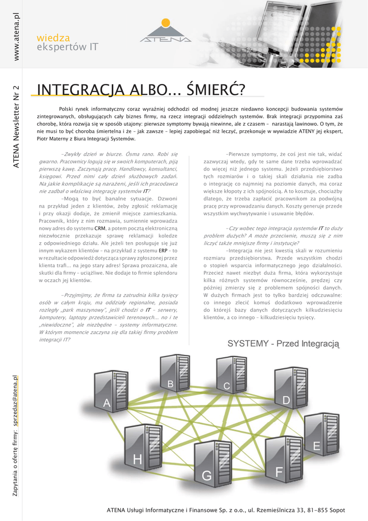 www.atena.pl ATENA Newsletter Nr 2 wiedza ekspertów IT INTEGRACJA ALBO... ŚMIERĆ? Polski rynek informatyczny coraz wyraźniej odchodzi od modnej jeszcze niedawno koncepcji budowania systemów zintegrowanych, obsługujących cały biznes firmy, na rzecz integracji oddzielnych systemów. Brak integracji przypomina zaś chorobę, która rozwija się w sposób utajony: pierwsze symptomy bywają niewinne, ale z czasem – narastają lawinowo. O tym, że nie musi to być choroba śmiertelna i że – jak zawsze – lepiej zapobiegać niż leczyć, przekonuje w wywiadzie ATENY jej ekspert, Piotr Materny z Biura Integracji Systemów. -Zwykły dzień w biurze. Ósma rano. Robi się gwarno. Pracownicy logują się w swoich komputerach, piją pierwszą kawę. Zaczynają pracę. Handlowcy, konsultanci, księgowi. Przed nimi cały dzień służbowych zadań. Na jakie komplikacje są narażeni, jeśli ich pracodawca nie zadbał o właściwą integrację systemów IT? -Mogą to być banalne sytuacje. Dzwoni na przykład jeden z klientów, żeby zgłosić reklamację i przy okazji dodaje, że zmienił miejsce zamieszkania. Pracownik, który z nim rozmawia, sumiennie wprowadza nowy adres do systemu CRM, a potem pocztą elektroniczną niezwłocznie przekazuje sprawę reklamacji koledze z odpowiedniego działu. Ale jeżeli ten posługuje się już innym wykazem klientów – na przykład z systemu ERP – to w rezultacie odpowiedź dotycząca sprawy zgłoszonej przez klienta trafi... na jego stary adres! Sprawa prozaiczna, ale skutki dla firmy – uciążliwe. Nie dodaje to firmie splendoru w oczach jej klientów. -Czy wobec tego integracja systemów IT to duży problem dużych? A może przeciwnie, muszą się z nim liczyć także mniejsze firmy i instytucje? -Integracja nie jest kwestią skali w rozumieniu rozmiaru przedsiębiorstwa. Przede wszystkim chodzi o stopień wsparcia informatycznego jego działalności. Przecież nawet niezbyt duża firma, która wykorzystuje kilka różnych systemów równocześnie, prędzej czy później zmierzy się z problemem spójności danych. W dużych firmach jest to tylko bardziej odczuwalne: co innego zlecić komuś dodatkowo wprowadzenie do którejś bazy danych dotyczących kilkudziesięciu klientów, a co innego – kilkudziesięciu tysięcy. Zapytania o ofertę firmy: [email protected] -Przyjmijmy, że firma ta zatrudnia kilka tysięcy osób w całym kraju, ma oddziały regionalne, posiada rozległy „park maszynowy”, jeśli chodzi o IT – serwery, komputery, laptopy przedstawicieli terenowych... no i te „niewidoczne”, ”, ale niezbędne – systemy informatyczne. W którym momencie omencie zaczyna się dla takiej firmy problem m integracji IT? -Pierwsze symptomy, że coś jest nie tak, widać zazwyczaj wtedy, gdy te same dane trzeba wprowadzać do więcej niż jednego systemu. Jeżeli przedsiębiorstwo tych rozmiarów i o takiej skali działania nie zadba o integrację co najmniej na poziomie danych, ma coraz większe kłopoty z ich spójnością. A to kosztuje, chociażby dlatego, że trzeba zapłacić pracownikom za podwójną pracę przy wprowadzaniu danych. Koszty generuje przede wszystkim wychwytywanie i usuwanie błędów. ATENA Usługi Informatyczne i Finansowe Sp. z o.o., ul. Rzemieślnicza 33, 81-855 Sopot www.atena.pl ATENA Newsletter Nr 2 wiedza ekspertów IT INTEGRACJA ALBO... ŚMIERĆ? -A do tego dochodzą jeszcze systemy partnerów biznesowych, dostawców, kontrahentów... -Tak, a poza tym jeszcze takie procesy, jak fuzje czy przejęcia... Podobnie, jak dzieje się to na całym świecie, i w Polsce właśnie te zjawiska wywołują temat integracji systemów IT. Firmy są po prostu zmuszone do radzenia sobie z różnymi środowiskami technologicznymi – strony przejmującej i przejmowanej. Tak rozległe przedsięwzięcia integracyjne obejmują oczywiście zarówno poziom danych, jak i procesów biznesowych. JAZON? -Czy na tak szerokie podejście pozwala platforma -Tu nie ma reguł, ponieważ integracja nie jest gotowym, „zamkniętym” produktem. Zawsze wymaga indywidualnego podejścia projektowego. Czas realizacji zależy zarówno od stopnia kompleksowości samej integracji, jak i użytych narzędzi. Idea wykorzystania integracji wpływa na sposób myślenia o architekturze firmowych systemów, które przestają być odrębnymi „silosami”, jak to często lubimy określać. Stają się natomiast systemem naczyń połączonych. Układem różnorodnych elementów, połączonych komunikacyjnym „krwiobiegiem”. -Jeśli nie integracja, to... co? -Koszty i problemy. Bez integracji IT menedżerowie firm są narażeni na coraz poważniejsze ograniczenia w rozwoju biznesu i reagowaniu na zmiany rynkowe. Od integracji nie da się uciec. Owszem, można bez niej przez jakiś czas żyć, stosując rozmaite półśrodki i leczenie „objawowe”. Jednak tylko integracja trafia w sedno zagadnienia, o którym mówimy. Zapytania o ofertę firmy: [email protected] -Tak, ponieważ jest ona rozwiązaniem, które integruje zarówno wewnętrzne systemy przedsiębiorstwa, jak i wykorzystywane poza nim, na przykład przez partnerów biznesowych. Uzyskujemy dzięki temu jednorodne środowisko przepływu informacji, co umożliwia kontrolę ich poprawności. Proces wymiany danych staje się w pełni niezależny od modyfikacji każdego z integrowanych systemów. Wszystkie one mogą mówić tym samym, uniwersalnym „językiem”. -Ile trwa proces integracji w danej firmie, od momentu zdiagnozowania potrzeb po wdrożenie nowego usprawnienia? ATENA Usługi Informatyczne i Finansowe Sp. z o.o., ul. Rzemieślnicza 33, 81-855 Sopot