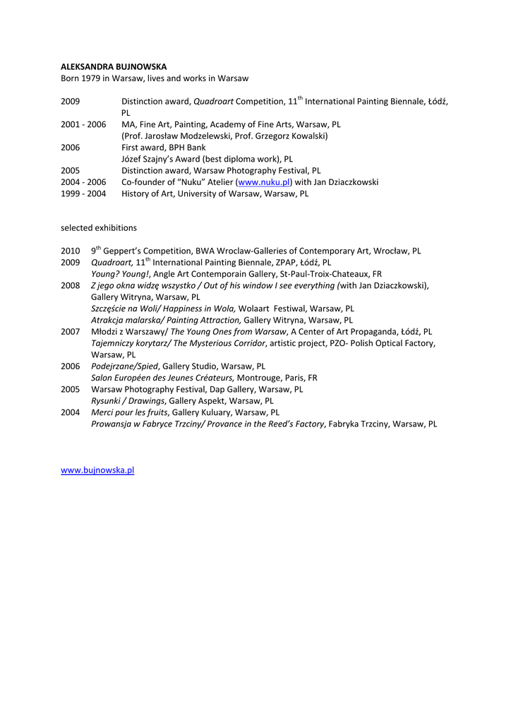 ALEKSANDRA BUJNOWSKA Born 1979 in Warsaw, lives and works in Warsaw 2009 2001 ‐ 2006 2006 2005 2004 ‐ 2006 1999 ‐ 2004 Distinction award, Quadroart Competition, 11th International Painting Biennale, Łódź, PL MA, Fine Art, Painting, Academy of Fine Arts, Warsaw, PL (Prof. Jarosław Modzelewski, Prof. Grzegorz Kowalski) First award, BPH Bank Józef Szajny’s Award (best diploma work), PL Distinction award, Warsaw Photography Festival, PL Co‐founder of “Nuku” Atelier (www.nuku.pl) with Jan Dziaczkowski History of Art, University of Warsaw, Warsaw, PL selected exhibitions 2010 2009 2008 2007 2006 2005 2004 9th Geppert’s Competition, BWA Wroclaw‐Galleries of Contemporary Art, Wrocław, PL Quadroart, 11th International Painting Biennale, ZPAP, Łódź, PL Young? Young!, Angle Art Contemporain Gallery, St‐Paul‐Troix‐Chateaux, FR Z jego okna widzę wszystko / Out of his window I see everything (with Jan Dziaczkowski), Gallery Witryna, Warsaw, PL Szczęście na Woli/ Happiness in Wola, Wolaart Festiwal, Warsaw, PL Atrakcja malarska/ Painting Attraction, Gallery Witryna, Warsaw, PL Młodzi z Warszawy/ The Young Ones from Warsaw, A Center of Art Propaganda, Łódź, PL Tajemniczy korytarz/ The Mysterious Corridor, artistic project, PZO‐ Polish Optical Factory, Warsaw, PL Podejrzane/Spied, Gallery Studio, Warsaw, PL Salon Européen des Jeunes Créateurs, Montrouge, Paris, FR Warsaw Photography Festival, Dap Gallery, Warsaw, PL Rysunki / Drawings, Gallery Aspekt, Warsaw, PL Merci pour les fruits, Gallery Kuluary, Warsaw, PL Prowansja w Fabryce Trzciny/ Provance in the Reed’s Factory, Fabryka Trzciny, Warsaw, PL www.bujnowska.pl