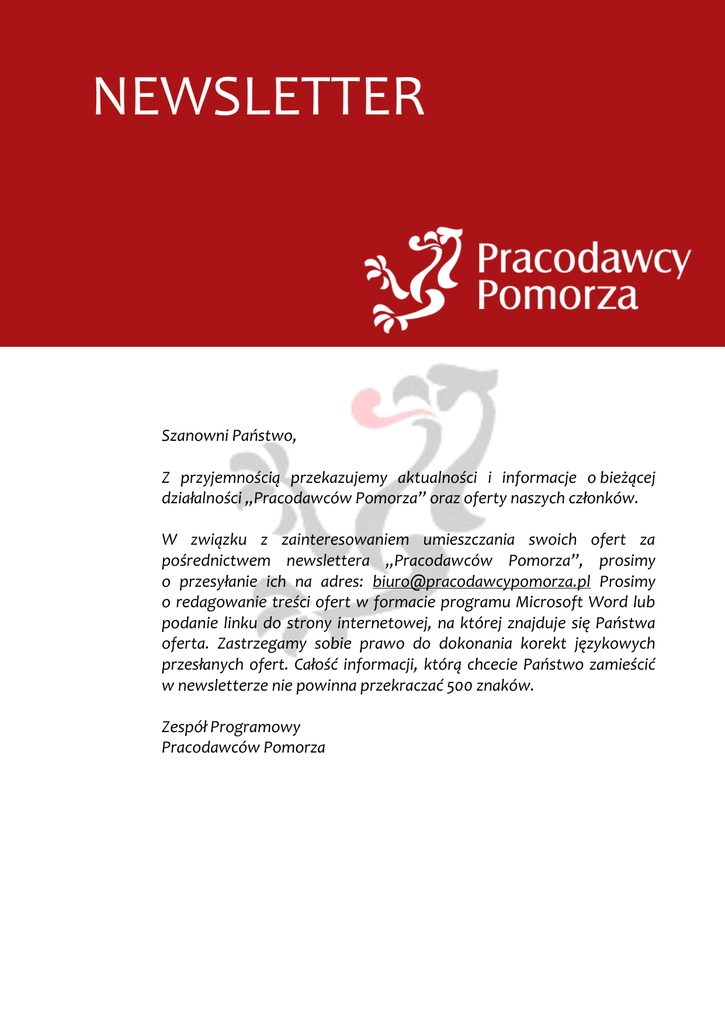 NEWSLETTER Szanowni Państwo, Z przyjemnością przekazujemy aktualności i informacje o bieżącej działalności „Pracodawców Pomorza” oraz oferty naszych członków. W związku z zainteresowaniem umieszczania swoich ofert za pośrednictwem newslettera „Pracodawców Pomorza”, prosimy o przesyłanie ich na adres: [email protected] Prosimy o redagowanie treści ofert w formacie programu Microsoft Word lub podanie linku do strony internetowej, na której znajduje się Państwa oferta. Zastrzegamy sobie prawo do dokonania korekt językowych przesłanych ofert. Całość informacji, którą chcecie Państwo zamieścić w newsletterze nie powinna przekraczać 500 znaków. Zespół Programowy Pracodawców Pomorza NEWSLETTER NR 23 z dnia 19 sierpnia 2011 INFORMACJE „PRACODAWCÓW POMORZA” Apel do Członków „Pracodawców Pomorza” o pomoc w remoncie siedziby „Pracodawcy Pomorza” zwracają się z gorącą prośbą do Członków o pomoc finansową lub rzeczową, w związku z kapitalnym remontem nowej siedziby. Po ponad 20 latach organizacja otrzymała od władz Gdańska budynek przy Alei Zwycięstwa 24, z przeznaczeniem na nową siedzibę „Pracodawców Pomorza”. Budynek ten jest obiektem zabytkowym i wymaga kompleksowego remontu celem dostosowania go do wymagań funkcjonowania biura „Pracodawców Pomorza”. Dlatego też, zwróciliśmy się do Państwa w formie pisemnej oraz mailowej o pomoc finansową lub rzeczową, która pozwoli nam dokończyć remont i udostępnić Państwu naszą wspólną nową siedzibę. Będziemy serdecznie wdzięczni za każdą formę okazanej pomocy. Pełna treść Apelu do Członków oraz informacje z postępu prac przy remoncie obiektu znajdziecie Państwo tu. Fotograficzna kronika remontu przyszłej siedziby „Pracodawców Pomorza” Zachęcamy Państwa do odwiedzenia strony internetowej „Pracodawców Pomorza”, gdzie przygotowaliśmy informację o postępach prac remontowych przyszłej siedziby „Pracodawców Pomorza”, zlokalizowanej w Gdańsku przy Alei Zwycięstwa 24. W miejscu tym zamieszczać będziemy zdjęcia obrazujące postęp prac do wykonania. Będzie Państwo mogli obserwować tym samym, iż pomoc finansowa lub rzeczowa, którą nam udzielicie będzie należycie dokumentowana i starannie wykorzystana w budowie naszej wspólnej nowej siedziby. Zdjęcia z prac remontowych znajdziecie Państwo na naszej stronie w zakładce Informacje lub pod tym linkiem. Zaproszenie na zebranie założycielskie oddziału „Pracodawców Pomorza” w powiecie kartuskim Zapraszamy w dniu 27.08.2011r. o godz. 11.00 do Zajazdu Ostrzyckiego w Ostrzycach (Droga Kaszubska 56) na spotkanie założycielskie oddziału „Pracodawców Pomorza” w powiecie kartuskim. Spotkanie poprowadzi Prezes Zarządu „Pracodawców Pomorza” dr Zbigniew Canowiecki. Zaproszenie skierowane jest do obecnych członków „Pracodawców Pomorza” z powiatu kartuskiego oraz firm działających na tym terenie, które wyrażają chęć przystąpienia do organizacji oraz aktywnego działania w strukturze powiatowej. Zaproszenie do udziału w spotkaniu znajdziecie Państwo w tym miejscu. Zaproszenie na zebranie założycielskie oddziału „Pracodawców Pomorza” w powiecie wejherowskim Zapraszamy w dniu 30.08.2011r. o godz. 14.00 do Starostwa Powiatowego w Wejherowie – sala konferencyjna na spotkanie założycielskie oddziału „Pracodawców Pomorza” w powiecie wejherowskim. Spotkanie poprowadzi Prezes Zarządu „Pracodawców Pomorza” dr Zbigniew Canowiecki. Zaproszenie skierowane jest do obecnych członków „Pracodawców Pomorza” z powiatu wejherowskiego oraz firm działających w tym terenie, które wyrażają chęć przystąpienia do organizacji oraz aktywnego działania w strukturze powiatowej. Zaproszenie do udziału w spotkaniu znajdziecie Państwo w tym miejscu. strona | 2 NEWSLETTER NR 23 z dnia 19 sierpnia 2011 Studia MBA – oferta Gdańskiej Fundacji Kształcenia Menedżerów dla członków Pracodawców Pomorza „Pracodawcy Pomorza” i Gdańska Fundacja Kształcenia Menedżerów we współpracy z Uniwersytetem Gdańskim oraz RSM Erasmus University, jako instytucją walidującą zapraszają Członków „Pracodawców Pomorza” na Międzynarodowy Program MBA GFKM. Studia MBA Prowadzone przez GFKM maja charakter programu Executive, to jest adresowanego do osób posiadających co najmniej 4 letnie doświadczenie zawodowe. Studia MBA w GFKM prowadzone są od 1991 roku. Początkowo zagranicznym partnerem był University of Strathclyde w Glasgow, a od 2000 roku jest nim renomowana Rotterdam School of Management, Erasmus University, lokowana przez Financial Times i The Economist w ścisłej czołówce szkół biznesu w Europie. GFKM posiada międzynarodową akredytację IQA (International Quality Accreditation) przyznawaną przez Central and East European Management Development Association (CEEMAN) wyróżniającym się instytucjom szkoleniowym w naszej części Europy. CEEMAN jest największym stowarzyszeniem rozwoju zarządzania krajów Europy środkowej, zrzeszającym 169 organizacji szkoleniowych i doradczych z 39 krajów w Europie, Północnej Ameryce, Afryce i Azji. GFKM uzyskała International Quality Accreditation jako pierwsza firma szkoleniowa w Polsce i szósta w Europie. Po pomyślnym ukończeniu programu absolwenci otrzymują dyplom MBA podpisany przez wszystkie partnerskie instytucje: GFKM, Uniwersytet Gdański i RSM Erasmus University. Specjalna dla członków Pracodawców Pomorza (dotyczy zapisów kierowanych do biura Pracodawców Pomorza) obejmuje: przy zapisaniu się 3 osób z jednej firmy – 1 osoba gratis przy zebraniu co najmniej 15 zgłoszeń od chętnych przez biuro Pracodawców Pomorza, możliwe jest ustalenie indywidualnego terminu rozpoczęcia studiów Szczegółowe informacje na temat oferty studiów MBA dla Członków „Pracodawców Pomorza” znajdziecie Państwo w tym miejscu. Zgłoszenia oraz zapytania prosimy również ki