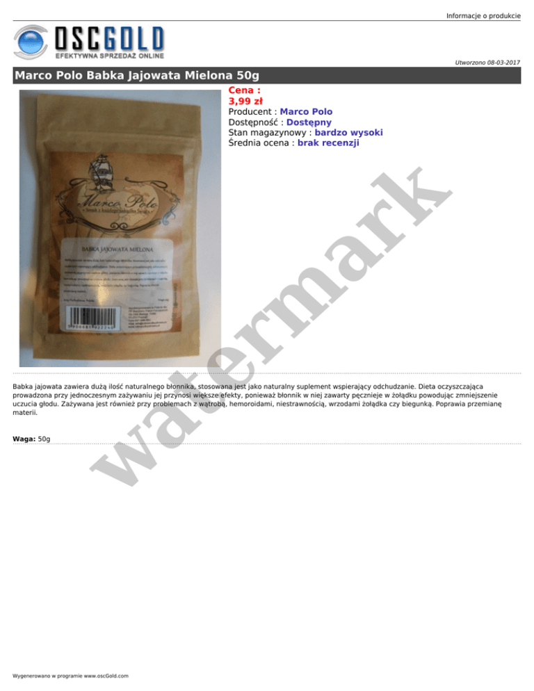 Informacje o produkcie Utworzono 08-03-2017 Marco Polo Babka Jajowata Mielona 50g Cena : 3,99 zł er m ar k Producent : Marco Polo Dostępność : Dostępny Stan magazynowy : bardzo wysoki Średnia ocena : brak recenzji w Waga: 50g at Babka jajowata zawiera dużą ilość naturalnego błonnika, stosowana jest jako naturalny suplement wspierający odchudzanie. Dieta oczyszczająca prowadzona przy jednoczesnym zażywaniu jej przynosi większe efekty, ponieważ błonnik w niej zawarty pęcznieje w żołądku powodując zmniejszenie uczucia głodu. Zażywana jest również przy problemach z wątrobą, hemoroidami, niestrawnością, wrzodami żołądka czy biegunką. Poprawia przemianę materii. Wygenerowano w programie www.oscGold.com