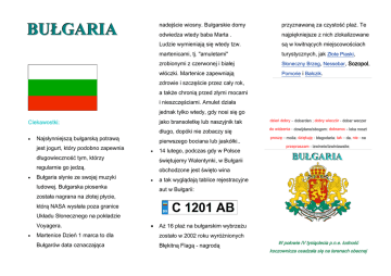 BUŁGARIA nadejście wiosny. Bułgarskie domy przyznawaną za czystość plaż. Te odwiedza wtedy baba Marta . najpiękniejsze z nich zlokalizowane Ludzie wymieniają się wtedy tzw. są w kwitnących miejscowościach martenicami, tj. "amuletami" turystycznych, jak Złote Piaski, zrobionymi z czerwonej i białej Słoneczny Brzeg, Nessebar, Sozopol, włóczki. Martenice zapewniają Pomorie i Bałczik. zdrowie i szczęście przez cały rok, a także chronią przed złymi mocami i nieszczęściami. Amulet działa jednak tylko wtedy, gdy nosi się go Ciekawostki: Najsłynniejszą bułgarską potrawą jest jogurt, który podobno zapewnia długo, dopóki nie zobaczy się do widzenia - dowijdane/sbogom; dobranoc - leka noszt 14 lutego, podczas gdy w Polsce świętujemy Walentynki, w Bułgarii regularnie go jedzą. Bułgaria słynie ze swojej muzyki dzień dobry – dobarden ; dobry wieczór - dobar weczer pierwszego bociana lub jaskółki.. długowieczność tym, którzy jako bransoletkę lub naszyjnik tak proszę – molia; dziękuję - błagodaria; tak – da, nie - ne przepraszam - izwinete/izwiniawaite; BUŁGARIA obchodzone jest święto wina ludowej. Bułgarska piosenka a tak wyglądają tablice rejestracyjne aut w Bułgarii: została nagrana na złotej płycie, którą NASA wysłała poza granice Układu Słonecznego na pokładzie Voyagera. Aż 16 plaż na bułgarskim wybrzeżu Martenice Dzień 1 marca to dla zostało w 2002 roku wyróżnionych Bułgarów data oznaczająca Błękitną Flagą - nagrodą W połowie IV tysiąclecia p.n.e. ludność koczownicza osadzała się na terenach obecnej Bułgarii z Azji Środkowej. W V wieku p.n.e. zostało utworzone państwo - Królestwo Odrysów. Tereny republika ilość mieszkańców: 7320 000 powierzchnia terytorium: 119 910 km2 język urzędowy: bułgarski plemiona słowiańskie, które zostały podbite w 680r. waluta: lew ( BGN ) przez Protobułgarów. Państwo powstało w 681 rok przystąpienia do Unii: 2007 roku założone przez Asparucha. Bułgaria była dominujące wyznania: prawosławie, te były własnością Rzymian, którzy utworzyli rzymską prowincję Mezję. W VI wieku na owe tereny zaczęły osiedlać potężnym państwem ze stolicą w Plisce (które trwało w okresie 681-1018). islam danie narodowe: tarator (chłodnik), znana potrawa: sałatka szopska Klimat jest umiarkowany ciepły, kontynentalny, suchy, nad morzem podzwrotnikowy, wilgotniejszy. Średnia temperatura powietrza (w styczniu) wynosi od -6°C), (w lipcu) odpowiednio od 18°C, 23°C i 25°C. sporty narodowe: piłka nożna, zapasy, podnoszenie ciężarów Warunki naturalne: 60% powierzchni to tereny wyżynne i górskie. Średnie wzniesienie wynosi ok. 470 m n.p.m. W środkowej części Bułgarii Bułgaria leży na Bałkanach nad Morzem Czarnym.Stolicą jest Sofia, 1,1 mln mieszkańców. Inne większe miasta to: Płowdiw, Warna, Burgas, Ruse, Stara Zagora . leży główny masyw górski nazywany Starą Płaniną (Bałkan). Najdłuższą z rzeką jest Dunaj, jego długość to 471 km w granicach Bułgarii. Rzeki te używane są głównie do nawadniania i produkcji energii elektrycznej. Jezior jest mało (występują głównie wzdłuż wybrzeża). W górach Pirin i Riła znajduje się 260 jezior pochodzenia polodowcowego. Największy wodospad w Bułgarii znajduje się Starej Płaninie Lasy pokrywają ok. 35% powierzchni całego kraju. Do wysokości 700-1000 m występują najczęściej lasy dębowe, do 1700-1800 m - lasy bukowe i bukowojodłowe, w najwyższych piętrach gór do 2000-2300 m - lasy świerkowe, kosodrzewina i hale górskie.