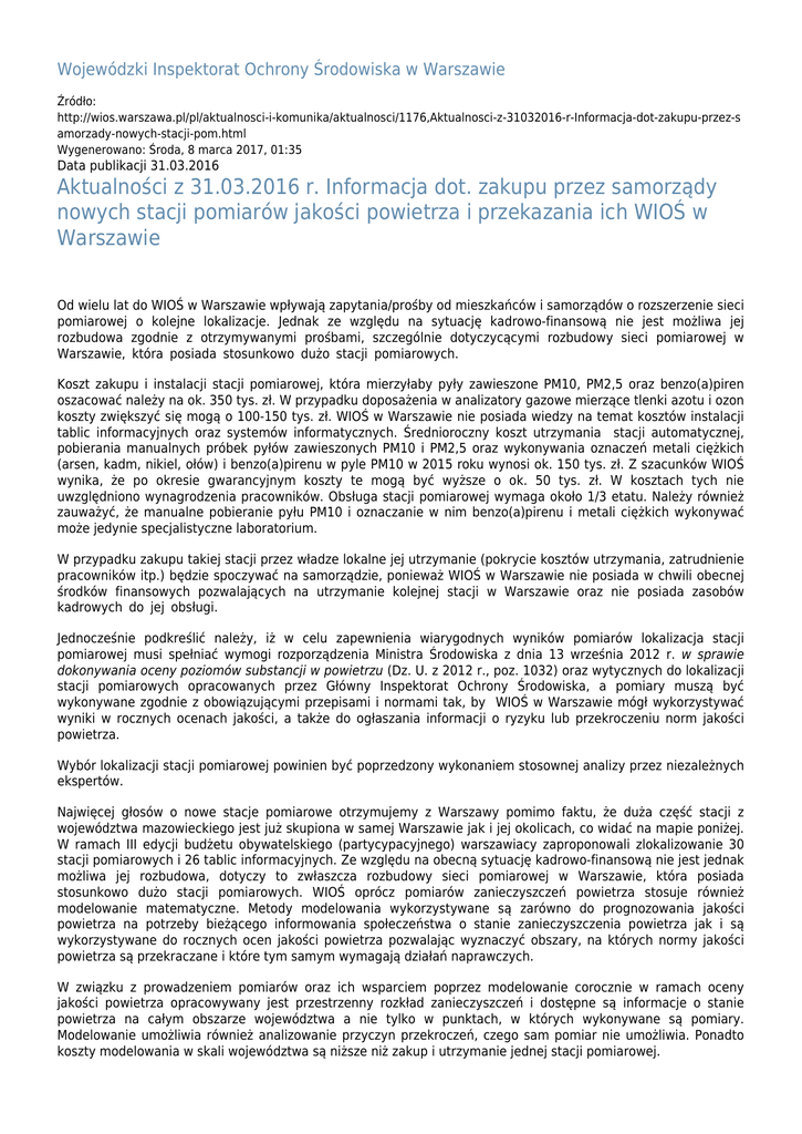 Wojewódzki Inspektorat Ochrony Środowiska w Warszawie Źródło: http://wios.warszawa.pl/pl/aktualnosci-i-komunika/aktualnosci/1176,Aktualnosci-z-31032016-r-Informacja-dot-zakupu-przez-s amorzady-nowych-stacji-pom.html Wygenerowano: Środa, 8 marca 2017, 01:35 Data publikacji 31.03.2016 Aktualności z 31.03.2016 r. Informacja dot. zakupu przez samorządy nowych stacji pomiarów jakości powietrza i przekazania ich WIOŚ w Warszawie Od wielu lat do WIOŚ w Warszawie wpływają zapytania/prośby od mieszkańców i samorządów o rozszerzenie sieci pomiarowej o kolejne lokalizacje. Jednak ze względu na sytuację kadrowo-finansową nie jest możliwa jej rozbudowa zgodnie z otrzymywanymi prośbami, szczególnie dotyczycącymi rozbudowy sieci pomiarowej w Warszawie, która posiada stosunkowo dużo stacji pomiarowych. Koszt zakupu i instalacji stacji pomiarowej, która mierzyłaby pyły zawieszone PM10, PM2,5 oraz benzo(a)piren oszacować należy na ok. 350 tys. zł. W przypadku doposażenia w analizatory gazowe mierzące tlenki azotu i ozon koszty zwiększyć się mogą o 100-150 tys. zł. WIOŚ w Warszawie nie posiada wiedzy na temat kosztów instalacji tablic informacyjnych oraz systemów informatycznych. Średnioroczny koszt utrzymania stacji automatycznej, pobierania manualnych próbek pyłów zawieszonych PM10 i PM2,5 oraz wykonywania oznaczeń metali ciężkich (arsen, kadm, nikiel, ołów) i benzo(a)pirenu w pyle PM10 w 2015 roku wynosi ok. 150 tys. zł. Z szacunków WIOŚ wynika, że po okresie gwarancyjnym koszty te mogą być wyższe o ok. 50 tys. zł. W kosztach tych nie uwzględniono wynagrodzenia pracowników. Obsługa stacji pomiarowej wymaga około 1/3 etatu. Należy również zauważyć, że manualne pobieranie pyłu PM10 i oznaczanie w nim benzo(a)pirenu i metali ciężkich wykonywać może jedynie specjalistyczne laboratorium. W przypadku zakupu takiej stacji przez władze lokalne jej utrzymanie (pokrycie kosztów utrzymania, zatrudnienie pracowników itp.) będzie spoczywać na samorządzie, ponieważ WIOŚ w Warszawie nie posiada w chwili obecnej środków finansowych pozwalających na utrzymanie kolejnej stacji w Warszawie oraz nie posiada zasobów kadrowych do jej obsługi. Jednocześnie podkreślić należy, iż w celu zapewnienia wiarygodnych wyników pomiarów lokalizacja stacji pomiarowej musi spełniać wymogi rozporządzenia Ministra Środowiska z dnia 13 września 2012 r. w sprawie dokonywania oceny poziomów substancji w powietrzu (Dz. U. z 2012 r., poz. 1032) oraz wytycznych do lokalizacji stacji pomiarowych opracowanych przez Główny Inspektorat Ochrony Środowiska, a pomiary muszą być wykonywane zgodnie z obowiązującymi przepisami i normami tak, by WIOŚ w Warszawie mógł wykorzystywać wyniki w rocznych ocenach jakości, a także do ogłaszania informacji o ryzyku lub przekroczeniu norm jakości powietrza. Wybór lokalizacji stacji pomiarowej powinien być poprzedzony wykonaniem stosownej analizy przez niezależnych ekspertów. Najwięcej głosów o nowe stacje pomiarowe otrzymujemy z Warszawy pomimo faktu, że duża część stacji z województwa mazowieckiego jest już skupiona w samej Warszawie jak i jej okolicach, co widać na mapie poniżej. W ramach III edycji budżetu obywatelskiego (partycypacyjnego) warszawiacy zaproponowali zlokalizowanie 30 stacji pomiarowych i 26 tablic informacyjnych. Ze względu na obecną sytuację kadrowo-finansową nie jest jednak możliwa jej rozbudowa, dotyczy to zwłaszcza rozbudowy sieci pomiarowej w Warszawie, która posiada stosunkowo dużo stacji pomiarowych. WIOŚ oprócz pomiarów zanieczyszczeń powietrza stosuje również modelowanie matematyczne. Metody modelowania wykorzystywane są zarówno do prognozowania jakości powietrza na potrzeby bieżącego informowania społeczeństwa o stanie zanieczyszczenia powietrza jak i są wykorzystywane do rocznych ocen jakości powietrza pozwalając wyznaczyć obszary, na których normy jakości powietrza są przekraczane i które tym samym wymagają działań naprawczych. W związku z prowadzeniem pomiarów oraz ich wsparciem poprzez modelowanie corocznie w ramach oceny jakości powietrza opracowywany jest przestrzenny rozkład zanieczyszczeń i dostępne są informacje o stanie powietrza na całym obszarze województwa a nie tylko w punktach, w których wykonywane są pomiary. Modelowanie umożliwia również analizowanie przyczyn przekroczeń, czego sam pomiar nie umożliwia. Ponadto koszty modelowania w skali województwa są niższe niż zakup i utrzymanie jednej stacji pomiarowej. Jednocześnie należy również zauważyć, że na Mazowszu spełniona jest wymagana prawem ilość stacji pomiarowych. W tabelach poniżej zestawiono wymaganą liczbę stacji z rzeczywistą w 2016 r. dla zanieczyszczeń, które przekraczają ustalone normy, a co za tym idzie ich pomiar jest obowiązkowy. W przypadku wykonywania modelowania minimalna ilość stacji może zostać obniżona. W chwili obecnej funkcjonują na Mazowszu 22 stacje pomiarowe (w tym 19 należących do WIOŚ), przy czym 7 (32%) (w tym 6 należących do WIOŚ) zlokalizowanych jest w Warszawie. Rys.1. Lokalizacja stacji pomiarowych w 2015 r. z uwzględnieniem kategorii instytucji będącej właścicielem stacji [źródło GIOŚ] Rys.2. Lokalizacja stacji pomiarowych w 2016 r. w woj. mazowieckim [źródło WIOŚ] Tabela 1. Zestawienie liczby stanowisk pomiarowych dwutlenku azotu (cel ochrona zdrowia) Nazwa strefy Wymagana Wymagana liczba liczba Liczba stanowisk stanowisk stanowisk Różnica* pomiarowych pomiarowych istniejących (pomiar i (tylko pomiar) modelowanie) Aglomeracja Warszawska 5 3 4 1 miasto Płock 0 0 2 2 miasto Radom 1 0 1 1 strefa mazowiecka 3 2 7 5 * Różnica pomiędzy „Liczbą stanowisk istniejących” i „Wymaganą liczba stanowisk pomiarowych (pomiar i modelowanie)” Tabela 2. Zestawienie liczby stanowisk pomiarowych ozonu (cel ochrona zdrowia) Nazwa strefy Wymagana liczba stanowisk pomiarow