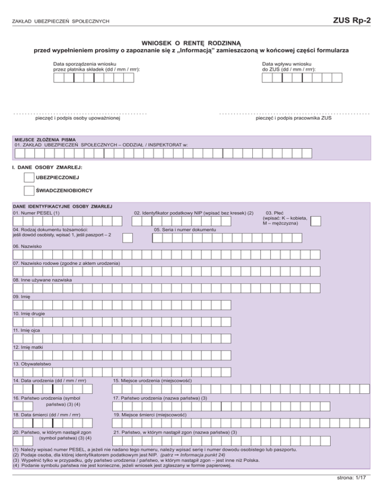 ZUS Rp-2 ZAKŁAD UBEZPIECZEŃ SPOŁECZNYCH WNIOSEK O RENTĘ RODZINNĄ przed wypełnieniem prosimy o zapoznanie się z „Informacją” zamieszczoną w końcowej części formularza Data sporządzenia wniosku przez płatnika składek (dd / mm / rrrr): Data wpływu wniosku do ZUS (dd / mm / rrrr): ............................................... pieczęć i podpis osoby upoważnionej ..................................................... pieczęć i podpis pracownika ZUS MIEJSCE ZŁOŻENIA PISMA 01. ZAKŁAD UBEZPIECZEŃ SPOŁECZNYCH – ODDZIAŁ / INSPEKTORAT w: I. DANE OSOBY ZMARŁEJ: UBEZPIECZONEJ ŚWIADCZENIOBIORCY DANE IDENTYFIKACYJNE OSOBY ZMARŁEJ 01. Numer PESEL (1) 02. Identyfikator podatkowy NIP (wpisać bez kresek) (2) 04. Rodzaj dokumentu tożsamości: jeśli dowód osobisty, wpisać 1, jeśli paszport – 2 03. Płeć (wpisać: K – kobieta, M – mężczyzna) 05. Seria i numer dokumentu 06. Nazwisko 07. Nazwisko rodowe (zgodne z aktem urodzenia) 08. Inne używane nazwiska 09. Imię 10. Imię drugie 11. Imię ojca 12. Imię matki 13. Obywatelstwo 14. Data urodzenia (dd / mm / rrrr) 15. Miejsce urodzenia (miejscowość) 16. Państwo urodzenia (symbol państwa) (3) (4) 17. Państwo urodzenia (nazwa państwa) (3) 18. Data śmierci (dd / mm / rrrr) 19. Miejsce śmierci (miejscowość) 20. Państwo, w którym nastąpił zgon (symbol państwa) (3) (4) 21. Państwo, w którym nastąpił zgon (nazwa państwa) (3) (1) (2) (3) (4) Należy wpisać numer PESEL, a jeżeli nie nadano tego numeru, należy wpisać serię i numer dowodu osobistego lub paszportu. Podaje osoba, dla której identyfikatorem podatkowym jest NIP. (patrz Informacja punkt 24) Wypełnić tylko w przypadku, gdy państwo urodzenia / państwo, w którym nastąpił zgon – jest inne niż Polska. Podanie symbolu państwa nie jest konieczne, jeżeli wniosek jest zgłaszany w formie papierowej. strona: 1/17 ZUS Rp-2 ZAKŁAD UBEZPIECZEŃ SPOŁECZNYCH II. DODATKOWE DANE DOTYCZĄCE OSOBY ZMARŁEJ: 1. Zawód: ..................................................................................................................................... Kod zawodu: — Jeżeli wniosek sporządza pracodawca, to wpisuje nazwę i kod zawodu zgodnie z „Klasyfikacją Zawodów i Specjalności” wprowadzoną rozporządzeniem Ministra Pracy i Polityki Społecznej z dnia 27 kwietnia 2010 r. (Dz.U. Nr 82, poz. 537 ze zm.). Przy określaniu zawodu należy uwzględnić zakres i charakter czynności wykonywanych przez pracownika. — Jeżeli wniosek zgłaszany w formie papierowej wypełnia osoba zainteresowana bez udziału pracodawcy, to podaje tylko nazwę wykonywanego przez osobę zmarłą zawodu. Kod zawodu uzupełni ZUS. 2. Czy osoba zmarła zgłaszała wniosek o ustalenie kapitału początkowego: TAK (należy zaznaczyć właściwy kwadrat) NIE Jeśli TAK, należy podać Oddział / Inspektorat ZUS oraz numer sprawy: Jeżeli NIE patrz Informacja punkt 13 ............................................................................................................................. ............................................................................................................................. 3. Czy osoba zmarła miała ustalone prawo do: TAK NIE (należy zaznaczyć właściwy kwadrat) emerytury renty emerytury pomostowej uposażenia świadczenia przedemerytalnego zasiłku przedemerytalnego nauczycielskiego świadczenia kompensacyjnego Jeśli TAK, należy podać nazwę i adres organu rentowego, który wydał decyzję (ZUS, KRUS, Zakład Emerytalno-Rentowy MSW, Wojskowe Biuro Emerytalne, Biuro Emerytalne Służby Więziennej, właściwa jednostka organizacyjna wymiaru sprawiedliwości) oraz numer świadczenia: Jeżeli NIE – patrz Informacja punkt 9 ............................................................................................................................ ............................................................................................................................ 4. Czy osoba zmarła zgłaszała wniosek o świadczenie, do którego nie zostało ustalone prawo: TAK (należy zaznaczyć właściwy kwadrat) NIE Jeśli TAK, należy podać rodzaj świadczenia, nazwę i adres organu rentowego, który wydał decyzję odmowną (ZUS, KRUS, Zakład Emerytalno-Rentowy MSW, Wojskowe Biuro Emerytalne, Biuro Emerytalne Służby Więziennej, właściwa jednostka organizacyjna wymiaru sprawiedliwości) oraz numer sprawy: .............................................................................................................................. .............................................................................................................................. 5. Czy śmierć osoby, po której ma być przyznana renta, była następstwem wypadku przy pracy: TAK (należy zaznaczyć właściwy kwadrat) NIE Jeśli TAK, należy w organie rentowym przedłożyć protokół powypadkowy lub kartę wypadku (1) 6. Czy śmierć osoby, po której ma być przyznana renta, była następstwem wypadku w drodze do pracy lub z pracy, który miał miejsce przed dniem 1 stycznia 2003 r. (należy zaznaczyć właściwy kwadrat) TAK NIE Jeśli TAK, należy w organie rentowym przedłożyć kartę wypadku w drodze do pracy lub z pracy (1) 7. Czy w sprawie wypadku było prowadzone dochodzenie: TAK (należy zaznaczyć właściwy kwadrat) NIE Jeśli TAK, należy podać organ prowadzący dochodzenie (np. prokuratura, policja) i sygnaturę akt: ............................................................................................................................. ............................................................................................................................. 8. Czy śmierć osoby, po której ma być przyznana renta, była następstwem choroby zawodowej: TAK (należy zaznaczyć właściwy kwadrat) NIE Jeśli TAK, należy w organie rentowym przedłożyć ostateczną decyzję właściwych organów inspekcji sanitarne