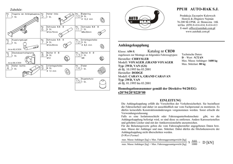 Anhängekupplung Katalog nr CH30 = D [kN] PPUH AUTO