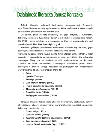 Talent literacki poświęcił twórczości pedagogicznej. Stworzył, wypróbował i opisał metody wychowawcze, które realizował w stworzonych przez siebie placówkach wychowawczych. Od 1896r. (miał 18 lat) ukazywały się jego artykuły i humoreski, felietony i szkice w tygodniku "Kolce", a od 1898r. w czasopiśmie "Głos". Od 1901r. pisze artykuły o wychowaniu, w których wypowiada się pod pseudonimami: Hen, Ryk, Hen-Ryk, h.g, G. Wkrótce głównym problemem twórczości stawało się dziecko, jego pozycja w społeczeństwie, warunki, potrzeby oraz szkoła. Pierwsza książka, którą wydał nosiła tytuł Dzieci ulicy (1901r.). Pisał powieści i opowiadania przeznaczone przede wszystkim dla człowieka dorosłego. Miały one za zadanie uczulić społeczeństwo na krzywdę dziecka, na brak zrozumienia dziecięcych problemów przez świat dorosłych i zwrócić uwagę rodziców na przyczyny ich niepowodzeń w wychowaniu dzieci. Najbardziej znane to: Bobo Spowiedź motyla Feralny tydzień Jak kochać dziecko (1920) Prawo dziecka do szacunku (1929) Momenty wychowawcze (1919) Prawidła życia (1930) Pedagogika żartobliwa (1939) Korczak stworzył także wiele utworów literackich, poetyckich, satyry obyczajowe, utwory dramatyczne, naturalistyczne powieści społeczne, felietony i pamiętniki, tj.: Dzieci ulicy (1901) Dziecko salonu (1906) Koszałki opałki (satyra obyczajowa) (1905) Sam na sam z Bogiem (1922) dramat Senat szaleńców (wyst. 1931) 1 W najbardziej twórczym, dojrzałym okresie życia napisał utwory przeznaczone wyłącznie dla dzieci i młodzieży. Są to: Jośki, Mośki i Srule (1909) Józki, Jaśki i Franki (1910) Sława Kiedy znów będę mały (1925) Bankructwo małego Dżeka (1924) Kajtuś czarodziej Uparty chłopiec Król Maciuś Pierwszy (1922) Król Maciuś na wyspie bezludnej (1923) Ludzie są dobrzy Niektóre z nich już od momentu powstania zostały entuzjastycznie przyjęte przez dziecięcego czytelnika w Polsce. To właśnie pod wpływem dzieci Korczak napisał dalsze dzieje Króla Maciusia. Same dzieci przysyłały listy do autora, w których proponowały całe sceny mającej powstać książki. To zainteresowanie dzieci książkami i ich bohaterami było najpiękniejszą nagrodą dla Korczaka za jego zasługi w literaturze dziecięcej. Zawsze twierdził, że najlepszymi krytykami są dzieci i należy ich oceny brać całkiem poważnie. Janusz Korczak pozostał na zawsze w pamięci ludzkiej człowiekiem wielkiego umysłu i dobroci. Był znakomitym pedagogiem, praktykiem i teoretykiem wychowania, autorem książek dla dzieci, lekarzem, dramaturgiem i społecznikiem. 2