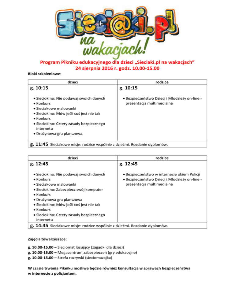 Program Pikniku edukacyjnego dla dzieci „Sieciaki.pl na wakacjach” 24 sierpnia 2016 r. godz. 10.00-15.00 Bloki szkoleniowe: dzieci g. 10:15 g. 10:15 Sieciokino: Nie podawaj swoich danych Konkurs Sieciakowe malowanki Sieciokino: Mów jeśli coś jest nie tak Konkurs Sieciokino: Cztery zasady bezpiecznego internetu Drużynowa gra planszowa. g. 11:45 rodzice Bezpieczeństwo Dzieci i Młodzieży on-line prezentacja multimedialna Sieciakowe misje: rodzice wspólnie z dziećmi. Rozdanie dyplomów. dzieci g. 12:45 g. 12:45 Sieciokino: Nie podawaj swoich danych Konkurs Sieciakowe malowanki Sieciokino: Zabezpiecz swój komputer Konkurs Drużynowa gra planszowa Sieciokino: Mów jeśli coś jest nie tak Konkurs Sieciokino: Cztery zasady bezpiecznego internetu g. 14:45 rodzice Bezpieczeństwo w internecie okiem Policji Bezpieczeństwo Dzieci i Młodzieży on-line prezentacja multimedialna Sieciakowe misje: rodzice wspólnie z dziećmi. Rozdanie dyplomów. Zajęcia towarzyszące: g. 10.00-15.00 – Sieciomat losujący (zagadki dla dzieci) g. 10.00-15.00 – Megacentrum zabezpieczeń (gry edukacyjne) g. 10.00-15.00 – Strefa rozrywki (sieciomazajka) W czasie trwania Pikniku możliwa będzie również konsultacja w sprawach bezpieczeństwa w internecie z policjantem.