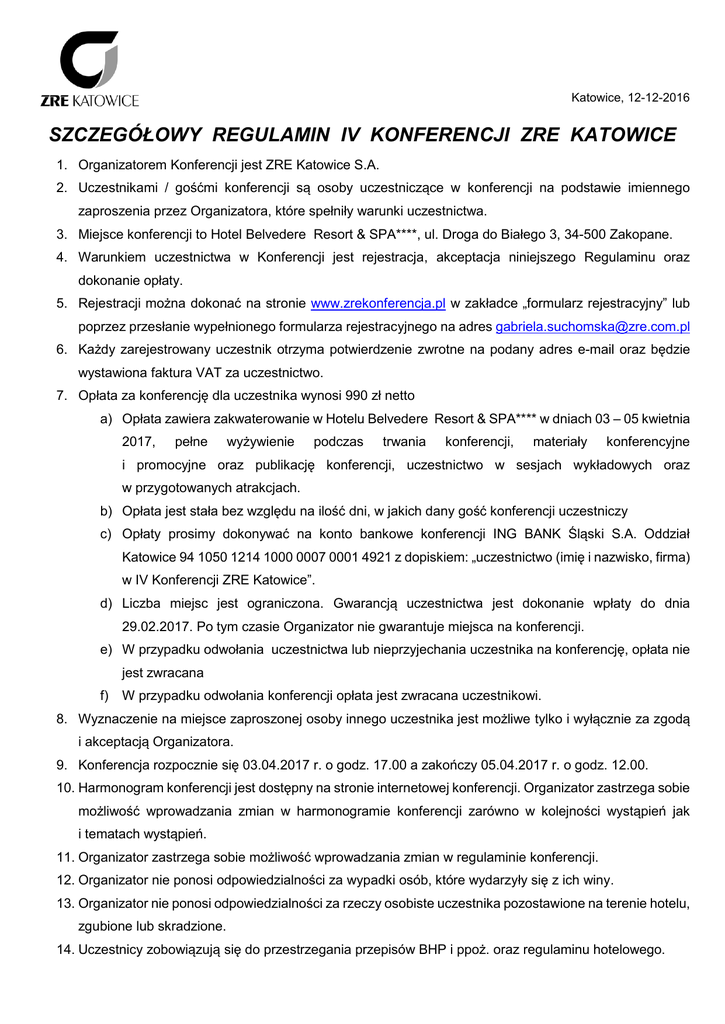 Katowice, 12-12-2016 SZCZEGÓŁOWY REGULAMIN IV KONFERENCJI ZRE KATOWICE 1. Organizatorem Konferencji jest ZRE Katowice S.A. 2. Uczestnikami / gośćmi konferencji są osoby uczestniczące w konferencji na podstawie imiennego zaproszenia przez Organizatora, które spełniły warunki uczestnictwa. 3. Miejsce konferencji to Hotel Belvedere Resort & SPA****, ul. Droga do Białego 3, 34-500 Zakopane. 4. Warunkiem uczestnictwa w Konferencji jest rejestracja, akceptacja niniejszego Regulaminu oraz dokonanie opłaty. 5. Rejestracji można dokonać na stronie www.zrekonferencja.pl w zakładce „formularz rejestracyjny” lub poprzez przesłanie wypełnionego formularza rejestracyjnego na adres [email protected] 6. Każdy zarejestrowany uczestnik otrzyma potwierdzenie zwrotne na podany adres e-mail oraz będzie wystawiona faktura VAT za uczestnictwo. 7. Opłata za konferencję dla uczestnika wynosi 990 zł netto a) Opłata zawiera zakwaterowanie w Hotelu Belvedere Resort & SPA**** w dniach 03 – 05 kwietnia 2017, pełne wyżywienie podczas trwania konferencji, materiały konferencyjne i promocyjne oraz publikację konferencji, uczestnictwo w sesjach wykładowych oraz w przygotowanych atrakcjach. b) Opłata jest stała bez względu na ilość dni, w jakich dany gość konferencji uczestniczy c) Opłaty prosimy dokonywać na konto bankowe konferencji ING BANK Śląski S.A. Oddział Katowice 94 1050 1214 1000 0007 0001 4921 z dopiskiem: „uczestnictwo (imię i nazwisko, firma) w IV Konferencji ZRE Katowice”. d) Liczba miejsc jest ograniczona. Gwarancją uczestnictwa jest dokonanie wpłaty do dnia 29.02.2017. Po tym czasie Organizator nie gwarantuje miejsca na konferencji. e) W przypadku odwołania uczestnictwa lub nieprzyjechania uczestnika na konferencję, opłata nie jest zwracana f) W przypadku odwołania konferencji opłata jest zwracana uczestnikowi. 8. Wyznaczenie na miejsce zaproszonej osoby innego uczestnika jest możliwe tylko i wyłącznie za zgodą i akceptacją Organizatora. 9. Konferencja rozpocznie się 03.04.2017 r. o godz. 17.00 a zakończy 05.04.2017 r. o godz. 12.00. 10. Harmonogram konferencji jest dostępny na stronie internetowej konferencji. Organizator zastrzega sobie możliwość wprowadzania zmian w harmonogramie konferencji zarówno w kolejności wystąpień jak i tematach wystąpień. 11. Organizator zastrzega sobie możliwość wprowadzania zmian w regulaminie konferencji. 12. Organizator nie ponosi odpowiedzialności za wypadki osób, które wydarzyły się z ich winy. 13. Organizator nie ponosi odpowiedzialności za rzeczy osobiste uczestnika pozostawione na terenie hotelu, zgubione lub skradzione. 14. Uczestnicy zobowiązują się do przestrzegania przepisów BHP i ppoż. oraz regulaminu hotelowego. 15. Koszty indywidualnych zamówień i usług, korzystanie z telefonu w pokojach, SPA, itp., goście pokrywają osobiście kartą kredytową lub gotówką w recepcji Hotelu. 16. Uczestnik wyraża zgodę na przetwarzanie danych osobowych celem organizacji Konferencji zgodnie z Ustawą z dnia 29 sierpnia 1997 r. o ochronie danych osobowych Dz. U. z 1997 r. Nr 133, poz. 883 z późn. zm. 17. Uczestnik wyraża zgodę na nieodpłatne rozpowszechnianie jego wizerunku w rozumieniu art. 81 ust 1 ustawy o prawie autorskim i prawach pokrewnych z dnia 4 lutego 199 4 r. (Dz. U. Nr 24, poz. 83) poprzez publikację wykonanych na konferencji zdjęć przez Organizatora w zakresie udostępniania ich w celach informacyjnych w galeriach fotograficznych na stronie internetowej przedmiotowej konferencji. Zakłady Remontowe Energetyki Katowice Spółka Akcyjna www.zre.com.pl Opracowała: [email protected]