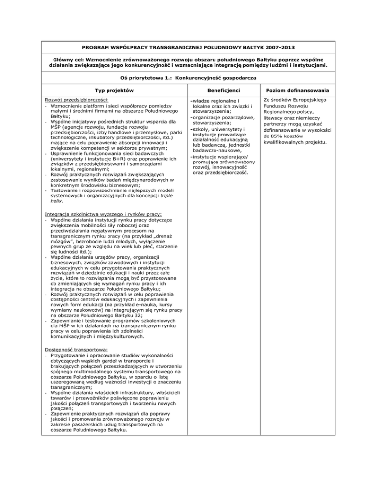 PROGRAM WSPÓŁPRACY TRANSGRANICZNEJ POŁUDNIOWY BAŁTYK 2007-2013 Główny cel: Wzmocnienie zrównoważonego rozwoju obszaru południowego Bałtyku poprzez wspólne działania zwiększające jego konkurencyjność i wzmacniające integrację pomiędzy ludźmi i instytucjami. Oś priorytetowa 1.: Konkurencyjność gospodarcza Typ projektów Rozwój przedsiębiorczości: - Wzmocnienie platform i sieci współpracy pomiędzy małymi i średnimi firmami na obszarze Południowego Bałtyku; - Wspólne inicjatywy pośrednich struktur wsparcia dla MŚP (agencje rozwoju, fundacje rozwoju przedsiębiorczości, izby handlowe i przemysłowe, parki technologiczne, inkubatory przedsiębiorczości, itd.) mające na celu poprawienie absorpcji innowacji i zwiększenie kompetencji w sektorze prywatnym; - Usprawnienie funkcjonowania sieci badawczych (uniwersytety i instytucje B+R) oraz poprawienie ich związków z przedsiębiorstwami i samorządami lokalnymi, regionalnymi; - Rozwój praktycznych rozwiązań zwiększających zastosowanie wyników badań międzynarodowych w konkretnym środowisku biznesowym; - Testowanie i rozpowszechnianie najlepszych modeli systemowych i organizacyjnych dla koncepcji triple helix. Integracja szkolnictwa wyższego i rynków pracy: - Wspólne działania instytucji rynku pracy dotyczące zwiększenia mobilności siły roboczej oraz przeciwdziałania negatywnym procesom na transgranicznym rynku pracy (na przykład „drenaż mózgów”, bezrobocie ludzi młodych, wyłączenie pewnych grup ze względu na wiek lub płeć, starzenie się ludności itd.); - Wspólne działania urzędów pracy, organizacji biznesowych, związków zawodowych i instytucji edukacyjnych w celu przygotowania praktycznych rozwiązań w dziedzinie edukacji i nauki przez całe życie, które to rozwiązania mogą być przystosowane do zmieniających się wymagań rynku pracy i ich integracja na obszarze Południowego Bałtyku; - Rozwój praktycznych rozwiązań w celu poprawienia dostępności centrów edukacyjnych i zapewnienia nowych form edukacji (na przykład e-nauka, kursy wymiany naukowców) na integrującym się rynku pracy na obszarze Południowego Bałtyku 32; - Zapewnianie i testowanie programów szkoleniowych dla MŚP w ich działaniach na transgranicznym rynku pracy w celu poprawienia ich zdolności komunikacyjnych i międzykulturowych. Dostępność transportowa: - Przygotowanie i opracowanie studiów wykonalności dotyczących wąskich gardeł w transporcie i brakujących połączeń przeszkadzających w utworzeniu spójnego multimodalnego systemu transportowego na obszarze Południowego Bałtyku, w oparciu o listę uszeregowaną według ważności inwestycji o znaczeniu transgranicznym; - Wspólne działania właścicieli infrastruktury, właścicieli towarów i przewoźników poświęcone poprawieniu jakości połączeń transportowych i tworzeniu nowych połączeń; - Zapewnienie praktycznych rozwiązań dla poprawy jakości i promowania zrównoważonego rozwoju w zakresie pasażerskich usług transportowych na obszarze Południowego Bałtyku. Beneficjenci - władze regionalne i lokalne oraz ich związki i stowarzyszenia; - organizacje pozarządowe, stowarzyszenia; - szkoły, uniwersytety i instytucje prowadzące działalność edukacyjną lub badawczą, jednostki badawczo-naukowe, - instytucje wspierające/ promujące zrównoważony rozwój, innowacyjność oraz przedsiębiorczość. Poziom dofinansowania Ze środków Europejskiego Funduszu Rozwoju Regionalnego polscy, litewscy oraz niemieccy partnerzy mogą uzyskać dofinansowanie w wysokości do 85% kosztów kwalifikowalnych projektu.
