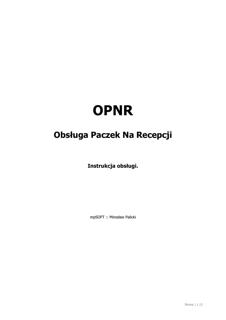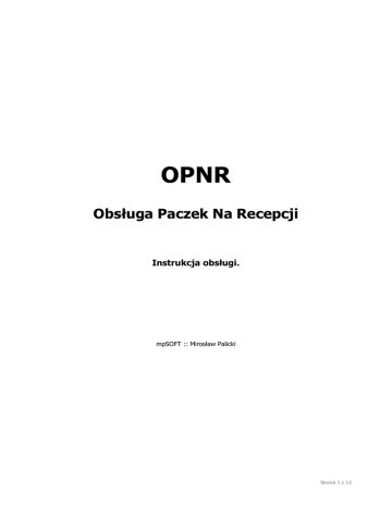OPNR Obsługa Paczek Na Recepcji Instrukcja obsługi. mpSOFT :: Mirosław Palicki Strona 1 z 13 Spis treści: 1. Informacje wstępne. ........................................................................................... 3 1.1. Przeznaczenie. ................................................................................................ 3 1.2. Licencja.......................................................................................................... 3 1.3. Instalacja. ...................................................................................................... 3 1.4. Deinstalacja.................................................................................................... 3 2. Pierwsze uruchomienie aplikacji. .......................................................................... 4 3. Ustawienia......................................................................................................... 5 3.1. Opcje............................................................................................................. 5 3.1.1. Konfiguracja skanera kodów kreskowych....................................................... 5 3.1.2. Konfiguracja wysyłania powiadomień e-mail. ................................................. 5 3.1.3. Konfiguracja parametrów SMTP.................................................................... 6 3.2. Baza danych. .................................................................................................. 6 3.3. Logowanie. ..................................................................................................... 7 3.4. Zmiana hasła. ................................................................................................. 7 4. Tabele............................................................................................................... 8 4.1. Tabela ‘Osoby’. ............................................................................................... 8 4.1.1. Dodanie i edycja osoby. .............................................................................. 8 4.1.2. Import listy osób z pliku CSV. ...................................................................... 9 4.2. Tabela ‘Paczki’. ............................................................................................... 9 4.2.1. Filtrowanie informacji o paczkach. ................................................................ 9 4.2.2. Widok i układ kolumn. .............................................................................. 10 4.2.3. Dostępne funkcje. .................................................................................... 10 5. Operacje. ........................................................................................................ 11 5.1. Dostawa....................................................................................................... 11 5.2. Edycja paczki. ............................................................................................... 12 5.3. Szukanie paczki............................................................................................. 12 5.4. Wydanie....................................................................................................... 13 Strona 2 z 13 1. Informacje wstępne. 1.1. Przeznaczenie. Program OPNR (Obsługa Paczek Na Recepcji) przeznaczony jest do rejestrowania odbioru przesyłek dostarczanych na recepcję firmy, wysyłania powiadomień do adresatów o przesyłce oczekującej na odbiór oraz do ewidencjonowania odbioru przesyłki. Program współpracuje z bazą danych MS SQL, czytnikami kodów kreskowych podłączonych do portów COMM (lub symulujących takie połączenie) oraz z czytnikami kart RUD-3. 1.2. Licencja. Pojedyncza licencja uprawnia do użytkowania jednej bazy danych i dowolnej ilości współpracujących z nią kopii programów zainstalowanych na komputerach znajdujących się we wspólnej lokalizacji (jeden adres pocztowy). 1.3. Instalacja. UWAGA - Przed pierwszą instalacją należy w instancji serwera MS SQL utworzyć bazę danych na podstawie dołączonego do programu skryptu OPNR.sql oraz ustanowić dla niej odpowiednie prawa dostępu. W celu zainstalowania aplikacji OPNR należy uruchomić plik instalatora OPNR_Setup.exe a następnie wykonywać kolejne kroki instalacji. Do poprawnej instalacji konieczne jest zaakceptowanie dołączonej licencji oraz wpisanie klucza (hasła) instalacyjnego. Proces instalacji przebiega standardowo i nie wymaga dokładniejszego opisu. 1.4. Deinstalacja. W celu usunięcia (deinstalacji) programu należy w systemowym Menu Start w grupie OPNR kliknąć ikonę Deinstalacja programu OPNR. a następnie potwierdzić chęć odinstalowania aplikacji. Strona 3 z 13 2. Pierwsze uruchomienie aplikacji. Przy pierwszym uruchomieniu aplikacji pojawi się komunikat informujący o błędzie połączenia z bazą danych. Wynika to z braku określenia w konfiguracji parametrów połączenia z bazą danych (adres hosta, login i hasło użytkownika, itp). Komunikat o błędzie połączenia z bazą danych. Należy zatwierdzić ten komunikat a następnie skonfigurować poprawne połączenie zgodnie z opisem znajdującym się w dalszej części tej instrukcji. Po zatwierdzeniu nastąpi ponowna próba połączenia się z bazą danych. Jeśli aplikacja poprawnie połączy się z bazą danych to pojawi się okno logowania operatora OPNR: Okno logowania operatora OPNR. Domyślnie skonfigurowany jest operator (Administrator) o nazwie admin i haśle admin. Po pierwszym zalogowaniu zalecane jest zmienić domyślne hasło tego operatora korzystając z pozycji menu głównego: Ustawienia » Zmiana hasła. Strona 4 z 13 3. Ustawienia. 3.1. Opcje. Konfigurację opcji programu wykonuje się w oknie Opcje dostępnym z menu głównego za pomocą polecenia Ustawienia » Opcje. 3.1.1. Konfiguracja skanera kodów kreskowych. Konfiguracja skanera kodów kreskowych sprowadza się do wybrania portu COMM, 