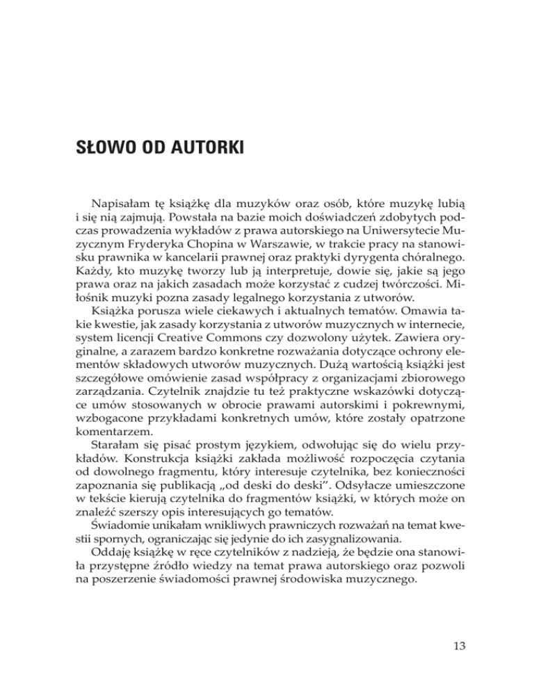 SŁOWO OD AUTORKI Napisałam tę książkę dla muzyków oraz osób, które muzykę lubią i się nią zajmują. Powstała na bazie moich doświadczeń zdobytych podczas prowadzenia wykładów z prawa autorskiego na Uniwersytecie Muzycznym Fryderyka Chopina w Warszawie, w trakcie pracy na stanowisku prawnika w kancelarii prawnej oraz praktyki dyrygenta chóralnego. Każdy, kto muzykę tworzy lub ją interpretuje, dowie się, jakie są jego prawa oraz na jakich zasadach może korzystać z cudzej twórczości. Miłośnik muzyki pozna zasady legalnego korzystania z utworów. Książka porusza wiele ciekawych i aktualnych tematów. Omawia takie kwestie, jak zasady korzystania z utworów muzycznych w internecie, system licencji Creative Commons czy dozwolony użytek. Zawiera oryginalne, a zarazem bardzo konkretne rozważania dotyczące ochrony elementów składowych utworów muzycznych. Dużą wartością książki jest szczegółowe omówienie zasad współpracy z organizacjami zbiorowego zarządzania. Czytelnik znajdzie tu też praktyczne wskazówki dotyczące umów stosowanych w obrocie prawami autorskimi i pokrewnymi, wzbogacone przykładami konkretnych umów, które zostały opatrzone komentarzem. Starałam się pisać prostym językiem, odwołując się do wielu przykładów. Konstrukcja książki zakłada możliwość rozpoczęcia czytania od dowolnego fragmentu, który interesuje czytelnika, bez konieczności zapoznania się publikacją „od deski do deski”. Odsyłacze umieszczone w tekście kierują czytelnika do fragmentów książki, w których może on znaleźć szerszy opis interesujących go tematów. Świadomie unikałam wnikliwych prawniczych rozważań na temat kwestii spornych, ograniczając się jedynie do ich zasygnalizowania. Oddaję książkę w ręce czytelników z nadzieją, że będzie ona stanowiła przystępne źródło wiedzy na temat prawa autorskiego oraz pozwoli na poszerzenie świadomości prawnej środowiska muzycznego. 13