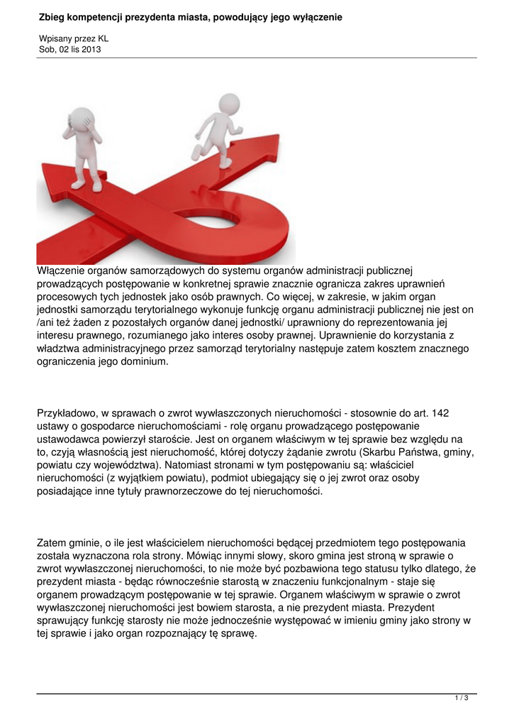 Zbieg kompetencji prezydenta miasta, powodujący jego wyłączenie Wpisany przez KL Sob, 02 lis 2013 Włączenie organów samorządowych do systemu organów administracji publicznej prowadzących postępowanie w konkretnej sprawie znacznie ogranicza zakres uprawnień procesowych tych jednostek jako osób prawnych. Co więcej, w zakresie, w jakim organ jednostki samorządu terytorialnego wykonuje funkcję organu administracji publicznej nie jest on /ani też żaden z pozostałych organów danej jednostki/ uprawniony do reprezentowania jej interesu prawnego, rozumianego jako interes osoby prawnej. Uprawnienie do korzystania z władztwa administracyjnego przez samorząd terytorialny następuje zatem kosztem znacznego ograniczenia jego dominium. Przykładowo, w sprawach o zwrot wywłaszczonych nieruchomości - stosownie do art. 142 ustawy o gospodarce nieruchomościami - rolę organu prowadzącego postępowanie ustawodawca powierzył staroście. Jest on organem właściwym w tej sprawie bez względu na to, czyją własnością jest nieruchomość, której dotyczy żądanie zwrotu (Skarbu Państwa, gminy, powiatu czy województwa). Natomiast stronami w tym postępowaniu są: właściciel nieruchomości (z wyjątkiem powiatu), podmiot ubiegający się o jej zwrot oraz osoby posiadające inne tytuły prawnorzeczowe do tej nieruchomości. Zatem gminie, o ile jest właścicielem nieruchomości będącej przedmiotem tego postępowania została wyznaczona rola strony. Mówiąc innymi słowy, skoro gmina jest stroną w sprawie o zwrot wywłaszczonej nieruchomości, to nie może być pozbawiona tego statusu tylko dlatego, że prezydent miasta - będąc równocześnie starostą w znaczeniu funkcjonalnym - staje się organem prowadzącym postępowanie w tej sprawie. Organem właściwym w sprawie o zwrot wywłaszczonej nieruchomości jest bowiem starosta, a nie prezydent miasta. Prezydent sprawujący funkcję starosty nie może jednocześnie występować w imieniu gminy jako strony w tej sprawie i jako organ rozpoznający tę sprawę. 1/3 Zbieg kompetencji prezydenta miasta, powodujący jego wyłączenie Wpisany przez KL Sob, 02 lis 2013 Po pierwsze zachodzi w tym przypadku określona w art. 24 par. 1 pkt 1 Kpa przyczyna wyłączenia prezydenta miasta od udziału w postępowaniu w sprawie. Pozostawanie z gminą w stosunku zatrudnienia, a ponadto sprawowanie funkcji organu wykonawczego miasta i pełnienie funkcji jego ustawowego przedstawiciela można uznać za pozostawanie ze stroną w takim stosunku prawnym, że wynik sprawy może mieć chociażby pośredni wpływ na prawa lub obowiązki prezydenta miasta. Po drugie zgodnie z art. 31 ustawy o samorządzie gminnym prezydent miasta kieruje bieżącymi sprawami gminy oraz reprezentuje ją na zewnątrz. Z unormowania tego wynika jednoznacznie, że w omawianej sprawie prezydent miasta jest także ustawowym przedstawicielem strony. Oznacza to, że w omawianej sprawie zachodzi również określona w art. 24 par. 1 pkt 4 Kpa przyczyna wyłączenia prezydenta miasta od udziału w postępowaniu w sprawie zwrotu nieruchomości, której właścicielem jest gmina. W konsekwencji uznać należy, że bezprzedmiotowy jest problem wyłączenia innych pracowników urzędu miasta. Zastępcy prezydenta oraz pozostali pracownicy urzędu miasta nie mogą wydać decyzji w tej sprawie, ponieważ nie są władni do podejmowania jakichkolwiek czynności w sprawie z upoważnienia prezydenta miasta, który z mocy prawa podlega wyłączeniu od udziału w postępowaniu w tej sprawie. Wyłączenie od udziału w postępowaniu w sprawie oznacza bowiem odsunięcie od wszystkich czynności, jakie mogą być podjęte w sprawie, a więc również niemożność udzielenia upoważnienia do wydania decyzji jakiemukolwiek pracownikowi urzędu miasta. Skoro prezydent sprawujący funkcję starosty podlega wyłączeniu od rozpoznania takiej sprawy, to jako organ nie może w niej podejmować żadnych czynności, np. nie może dać upoważnienia do jej załatwienia jakiemukolwiek z podległych sobie pracowników. Bowiem jeżeli nie ma organu właściwego (vacat) do wydania decyzji administracyjnej żaden pracownik urzędu gminy nie może być upoważniony przez nie istniejący organ do działania w jego imieniu (Wyrok NSA z dnia 11 września 1992 r., IV SA 404/92). Powyższe rozważania prowadzą do konkluzji, że wyłączenie osoby prezydenta miasta od udziału w postępowaniu czyni organ wykonawczy gminy niewładnym do działania. Jako organ administracji publicznej staje się on niezdolny do załatwienia sprawy /art. 26 par. 3 Kpa/. W omawianej sytuacji będzie więc miał odpowiednie zastosowanie art. 26 par. 2 Kpa. Sprawa będzie podlegała załatwieniu przez organ wyższego stopnia nad prezydentem miasta (w tym przypadku przez wojewodę), z tym że organ ten będzie mógł wyznaczyć do załatwienia sprawy 2/3 Zbieg kompetencji prezydenta miasta, powodujący jego wyłączenie Wpisany przez KL Sob, 02 lis 2013 inny podległy sobie organ. Źródło: CBOSA 3/3