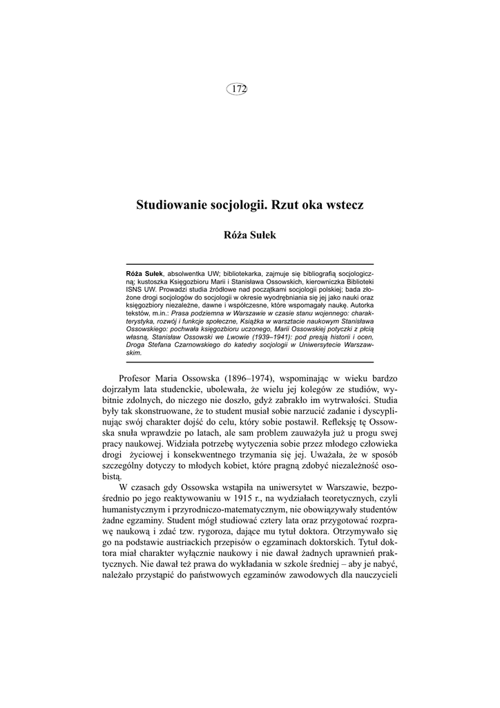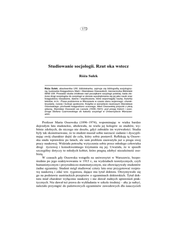 172 Studiowanie socjologii. Rzut oka wstecz Róża Sułek Róża Sułek, absolwentka UW; bibliotekarka, zajmuje się bibliografią socjologiczną; kustoszka Księgozbioru Marii i Stanisława Ossowskich, kierowniczka Biblioteki ISNS UW. Prowadzi studia źródłowe nad początkami socjologii polskiej; bada złożone drogi socjologów do socjologii w okresie wyodrębniania się jej jako nauki oraz księgozbiory niezależne, dawne i współczesne, które wspomagały naukę. Autorka tekstów, m.in.: Prasa podziemna w Warszawie w czasie stanu wojennego: charakterystyka, rozwój i funkcje społeczne, Książka w warsztacie naukowym Stanisława Ossowskiego: pochwała księgozbioru uczonego, Marii Ossowskiej potyczki z płcią własną, Stanisław Ossowski we Lwowie (1939–1941): pod presją historii i ocen, Droga Stefana Czarnowskiego do katedry socjologii w Uniwersytecie Warszawskim. Profesor Maria Ossowska (1896–1974), wspominając w wieku bardzo dojrzałym lata studenckie, ubolewała, że wielu jej kolegów ze studiów, wybitnie zdolnych, do niczego nie doszło, gdyż zabrakło im wytrwałości. Studia były tak skonstruowane, że to student musiał sobie narzucić zadanie i dyscyplinując swój charakter dojść do celu, który sobie postawił. Refleksję tę Ossowska snuła wprawdzie po latach, ale sam problem zauważyła już u progu swej pracy naukowej. Widziała potrzebę wytyczenia sobie przez młodego człowieka drogi życiowej i konsekwentnego trzymania się jej. Uważała, że w sposób szczególny dotyczy to młodych kobiet, które pragną zdobyć niezależność osobistą. W czasach gdy Ossowska wstąpiła na uniwersytet w Warszawie, bezpośrednio po jego reaktywowaniu w 1915 r., na wydziałach teoretycznych, czyli humanistycznym i przyrodniczo-matematycznym, nie obowiązywały studentów żadne egzaminy. Student mógł studiować cztery lata oraz przygotować rozprawę naukową i zdać tzw. rygoroza, dające mu tytuł doktora. Otrzymywało się go na podstawie austriackich przepisów o egzaminach doktorskich. Tytuł doktora miał charakter wyłącznie naukowy i nie dawał żadnych uprawnień praktycznych. Nie dawał też prawa do wykładania w szkole średniej – aby je nabyć, należało przystąpić do państwowych egzaminów zawodowych dla nauczycieli Studiowanie socjologii. Rzut oka wstecz 173 szkół średnich, przeprowadzanych poza uniwersytetem, i uzyskać zawodowy dyplom nauczycielski. Za „ukończonych” studentów uważano wówczas osoby, które spełniły wymogi dopuszczenia ich do egzaminu nauczycielskiego lub do tzw. egzaminów ścisłych, czyli doktorskich przed Radą Wydziału. Jeśli kogoś nie interesowała praca naukowa lub nauczycielska, to mógł chodzić na zajęcia przez wiele lat, realizując czteroletnie limity zajęć, i wypisać się z uniwersytetu bez żadnych poświadczeń swojej wiedzy. Dopiero w roku 1926/27 na uniwersytetach weszło w życie zarządzenie o niższym stopniu naukowym, czyli magisterium. Na Uniwersytecie Warszawskim po wprowadzeniu reformy studiów koła naukowe studentów Wydziału Humanistycznego (dawniej Wydziału Filozoficznego) – filozofów, historyków, klasyków i polonistów – zainicjowały cykl wykładów, które mogłyby pomóc studentom w tym przełomowym okresie. Ukazały się one drukiem w roku 1927, zatytułowane Jak studiować na Wydziale Humanistycznym: cztery odczyty, a wśród nich wykład Marii Ossowskiej Jak studiować nauki filozoficzne. Rady jej były skierowane do studiujących filozofię jako przedmiot główny, jako przedmiot poboczny oraz do tych, którzy studiowali filozofię „w zakresie pedagogiki”. W tym czasie nie istniały jeszcze wymogi programowe dla studiowania filozofii w zakresie socjologii. Te weszły w życie dopiero w 1930 r., później nawet niż wymogi dla etnografii z etnologią, ale porady Marii Ossowskiej oraz innych wielkich autorów: Tadeusza Manteuffla, Jerzego Manteuffla i Zofii Szmydtowej, o studiowaniu historii, filologii klasycznej i filologii nowożytnej na przykładzie polonistyki, są bardzo interesujące i do dnia dzisiejszego mogą być drogowskazem, jak studiować pożytecznie. Ale okres studiów to nie tylko nauka. Zauważył to profesor Wojciech Sitek, zmarły niedawno socjolog z Uniwersytetu Wrocławskiego. Mówił studentom, że „studia to pięć najważniejszych lat w życiu, na które składa się zabawa, przyjaźń, miłość oraz nauka”. Na starych uniwersytetach, w Krakowie i Lwowie, socjologia dyscypliną uniwersytecką stawała się powoli. Uczelnie młodsze, Poznań i Warszawa, były bardziej otwarte i włączały do programu wykłady z nauk społecznych, w tym z socjologii. Rolę wspierającą odegrali także studenci, którzy domagali się zmian w programach studiów. Pierwsze wykłady z zakresu socjologii rozpoczęły się jeszcze zanim można było studiować socjologię jako odrębny kierunek, i były prowadzone dla prawników, literaturoznawców, pedagogów, historyków i etnografów. Studiujących tylko socjologię początkowo było bardzo niewielu. Najczęściej łączono studia socjologiczne z innymi. W pewnych okresach nawet było to zasadą regulaminową – zarówno przed wojną, jak i po wojnie. Ostatecznie przed drugą wojną światową w Warszawie niewiele osób zdążyło uzyskać magisteria i doktoraty z socjologii, więcej ich było w Poznaniu, gdzie działał Florian Znaniecki. 174 Róża Sułek W okresie międzywojennym zatem socjologia powoli zyskiwała regularnych studentów i powoli przebijała się do świadomości społeczeństwa i elit edukacyjnych. Jednak usamodzielnienie się socjologii na uniwersytetach, dynamizm osób zainteresowanych problematyką społeczną, powstawanie instytucji zajmujących się zagadnieniami społecznymi oraz inicjatywy wydawnicze podejmowane w celu upowszechnienia tej problematyki sprawiły, że socjologia weszła w fazę promieniowania. Świadectwem tego wpływu były indywidualne decyzje o pogł
