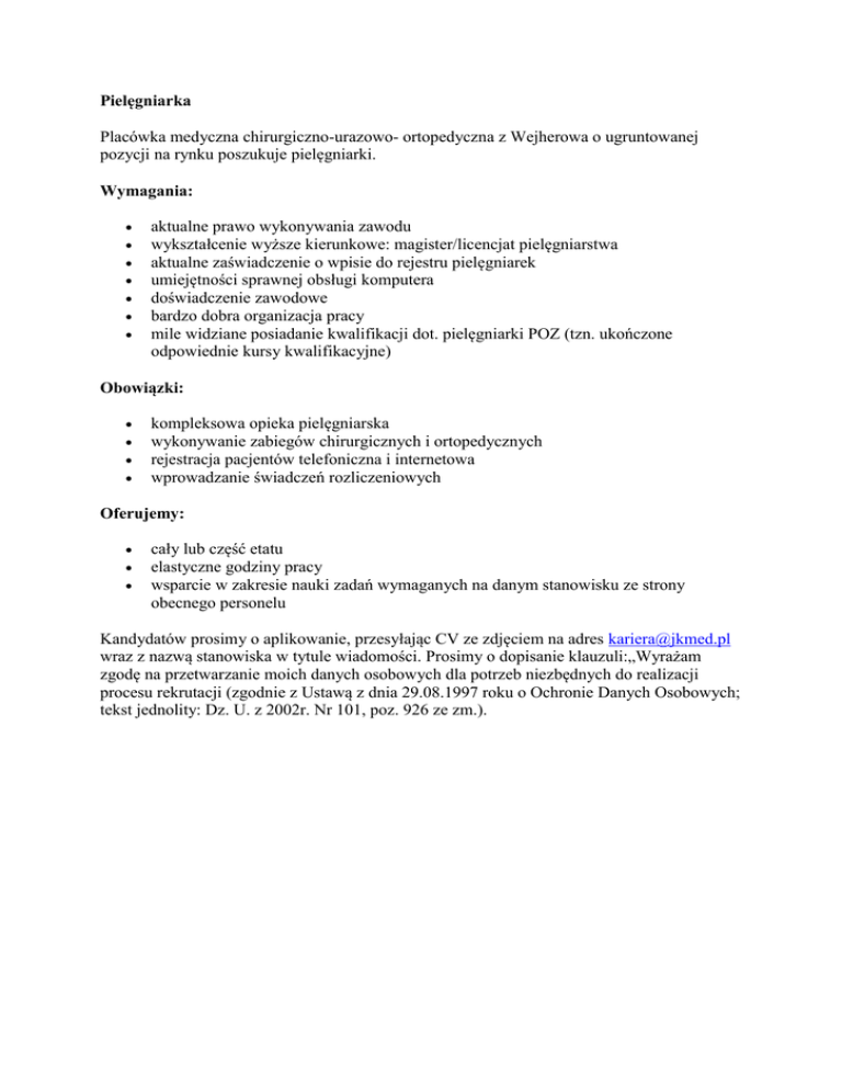 Pielęgniarka Placówka medyczna chirurgiczno-urazowo- ortopedyczna z Wejherowa o ugruntowanej pozycji na rynku poszukuje pielęgniarki. Wymagania: aktualne prawo wykonywania zawodu wykształcenie wyższe kierunkowe: magister/licencjat pielęgniarstwa aktualne zaświadczenie o wpisie do rejestru pielęgniarek umiejętności sprawnej obsługi komputera doświadczenie zawodowe bardzo dobra organizacja pracy mile widziane posiadanie kwalifikacji dot. pielęgniarki POZ (tzn. ukończone odpowiednie kursy kwalifikacyjne) Obowiązki: kompleksowa opieka pielęgniarska wykonywanie zabiegów chirurgicznych i ortopedycznych rejestracja pacjentów telefoniczna i internetowa wprowadzanie świadczeń rozliczeniowych Oferujemy: cały lub część etatu elastyczne godziny pracy wsparcie w zakresie nauki zadań wymaganych na danym stanowisku ze strony obecnego personelu Kandydatów prosimy o aplikowanie, przesyłając CV ze zdjęciem na adres [email protected] wraz z nazwą stanowiska w tytule wiadomości. Prosimy o dopisanie klauzuli:„Wyrażam zgodę na przetwarzanie moich danych osobowych dla potrzeb niezbędnych do realizacji procesu rekrutacji (zgodnie z Ustawą z dnia 29.08.1997 roku o Ochronie Danych Osobowych; tekst jednolity: Dz. U. z 2002r. Nr 101, poz. 926 ze zm.).