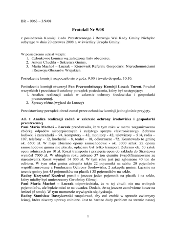 BR – 0063 – 3/9/08 Protokół Nr 9/08 z posiedzenia Komisji Ładu Przestrzennego i Rozwoju Wsi Rady Gminy Niebylec odbytego w dniu 20 czerwca 2008 r. w świetlicy Urzędu Gminy. W posiedzeniu udział wzięli: 1. Członkowie komisji wg załączonej listy obecności. 2. Antoni Chuchla – Sekretarz Gminy. 3. Maria Machoś – Łuczak – Kierownik Referatu Gospodarki Nieruchomościami i Rozwoju Obszarów Wiejskich. Posiedzenie komisji rozpoczęło się o godz. 9.00 i trwało do godz. 10.10. Posiedzenie komisji otworzył Pan Przewodniczący Komisji Leszek Turoń. Powitał wszystkich i przedstawił ustalony porządek posiedzenia, który był następujący: 1. Analiza realizacji zadań w zakresie ochrony środowiska i gospodarki przestrzennej. 2. Sprawy róŜne.(wyjazd do Lutczy) Przedstawiony porządek obrad został przez członków komisji jednogłośnie przyjęty. Ad. 1 Analiza realizacji zadań w zakresie ochrony środowiska i gospodarki przestrzennej. Pani Maria Machoś – Łuczak przedstawiła, iŜ w tym roku w marcu zorganizowano zbiórkę odpadów niebezpiecznych i zuŜytego sprzętu elektronicznego. Zebrano lodówki i zamraŜarki – 94, komputery – 42, monitory - 42, telewizory – 514, radia – 107, telefony – 12, kuchenki – 8, toalet – 18, odkurzacze –72. Kosztowało to gminę ok. 6500 zł. W maju zbierano opony samochodowe - ok. 3000 sztuk. Za opony samochodowe gmina nie płaciła, opłacany był tylko transport. Zebrano ok. 50 sztuk opon rolniczych po 10 zł. Koszt transportu i przyjęcia opon do zakładu do StrzyŜowa wyniósł 7000 zł. W ubiegłym roku zebrano 37 ton eternitu (współfinansowane ze starostwem). Koszt wyniósł 14 000 zł. W tym roku jest juŜ zgłoszone 40 ton do odbioru. W tym roku gmina zakupiła takŜe 22 pojemniki na szkło. 20 pojeników współfinansowane z Funduszem Ochrony Środowiska, 2 zakupiła gmina. Łącznie na terenie gminy jest 45 pojemników na plastik i 38 pojemników na szkło. Radny Krzysztof Kozdraś prosił o jeszcze jeden pojemnik na plastik i na szkło, który miałby być umieszczony Gwoźnicy Górnej. Pani Maria Machoś – Łuczak odpowiedziała, Ŝe w tej chwili nie ma wolnych pojemników, ale będzie mieć to na uwadze. Dodała, Ŝe są jeszcze zamówione kosze na śmieci (5 sztuk). W tym momencie wywiązała się dyskusja. Radny Stanisław Daszykowski zaapelował, aby coś zrobić w sprawie zwierzyny leśnej, która niszczy uprawy rolnicze. Jest to bardzo duŜy problem na terenie naszej 1 gminy. Rolnicy są w tej sprawie bezradni. Uprawy są cały czas niszczone przez dziki. Panowie z kół łowieckich nie reagują na prośby rolników. Pani Maria Machoś – Łuczak powiedział, Ŝe w ubiegłym tygodniu na polecenie Pana Wójta przesyłała pismo w tej sprawie do Panów Prezesów wszystkich kół łowieckich obejmujących teren naszej gminy a takŜe do wojewody (przekazano Marszałkowi Województwa). Dzwoniła do Urzędu wojewódzkiego z zapytaniem, czy jest moŜliwość odstrzału dzików – loch. Okazało się, Ŝe nie moŜna uzyskać takiego pozwolenia z ministerstwa. Zakaz obowiązuje do 15 sierpnia. Dodała, Ŝe praktycznie codziennie przyjmowane są zgłoszenia w gminie o szkodach przez zwierzynę. W tym momencie wywiązała się dyskusja. Pan Antoni Chuchla powiedział, Ŝe szkody zgłasza się nadleśnictwu, a ono je szacuje. Nie ma innego sposobu. Gmina nie moŜe w inny sposób pomóc. Rolnictwo nie naleŜy do zadań gminy. MoŜe jedynie apelować o zmianę przepisów, o zmianę prawa. Radny Stanisław Daszykowski stwierdził, Ŝe naleŜy podjąć drastyczne środki i moŜe wtedy coś to da. Powiedział, Ŝe naleŜałoby zablokować drogę krajową. Pan Antoni Chuchla powiedział, Ŝe gmina i rolnicy prezentują takie samo stanowisko i nie naleŜy stawać przeciwko sobie. Pani Maria Machoś - Łuczak dodała, Ŝe z urzędu wojewódzkiego otrzymała taką odpowiedź, iŜ koła łowieckie powinny prowadzić taką politykę, aby nie doprowadzić do nadmiernej populacji. A koła łowieckie Ŝyją z odstrzałów. Pan Antoni Chuchla stwierdził, Ŝe do kół łowieckich naleŜą róŜni ludzie z róŜnych sfer. Oni mają wpływy i nie jest to w ich interesie, aby to prawo zmieniać. Pani Maria Machoś – Łuczak mówiła o problemie z lisami w Lutczy. Lisy teraz teŜ są pod ochrona i nie moŜna z nimi nic robić. Pan z koła łowieckiego kazał sobie we własnym zakresie z nim poradzić. A przecieŜ nie powie się ludziom Ŝeby sami zabili zwierzę. W tym momencie wywiązała się dyskusja. Dodała, Ŝe zwierzyna łowna stanowi własność Skarbu Państwa. W tym momencie wywiązała się dyskusja. 2. Sprawy róŜne- wyjazd do Lutczy Buczyny – zamiana pól. Pan Przewodniczący komisji wyjaśnił, Ŝe właściciel nieruchomości połoŜonej na „Buczynach” chciałyby zamienić swoje pole z polem, które jest własnością gminy, tak aby powstał dla niego cały kompleks. Planuje w tym miejscu wybudować osiedle rekreacyjne. Pan Wójt nie chce sam decydować o tej zamienianie, dlatego prosi o opinię rady. Działki mają prawie taki sam areał. Ten pan zadeklarował, Ŝe na swój koszt zrobiłby podział tych działek i wyznaczy ze swego pola 4 metry na drogę. Wyznaczenie drogi. Pan Przewodniczący wyjaśnił tą sprawę. Obecnie droga ta prowadzi przez pola rolników. Jest on utwardzana, pobrane są rowy. Teraz oni zapowiedzieli, Ŝe zorają tą drogę. Stara droga nie jest uŜywana. Rolnicy są skłonni podarować na rzecz gminy część tych działek, tak aby powstała legalna droga. Pani Maria Machos – Łuczak powiedziała, Ŝe wszystkie drogi są z parceli prywatnej. Oprócz tych dróg, które są skomunalizowane. W kaŜdej wsi są takie przypadki. 2 Pan Antoni Chuchla wyjaśnił, Ŝe nie moŜe być drogi gminnej na gruncie nie państwowym. Aby takie drogi stały się drogami gminnymi, naleŜałoby przejąć działki kontraktem a następnie wydzielić geodezyjnie drogi. Pani Maria Machoś – Łuc