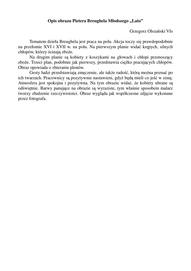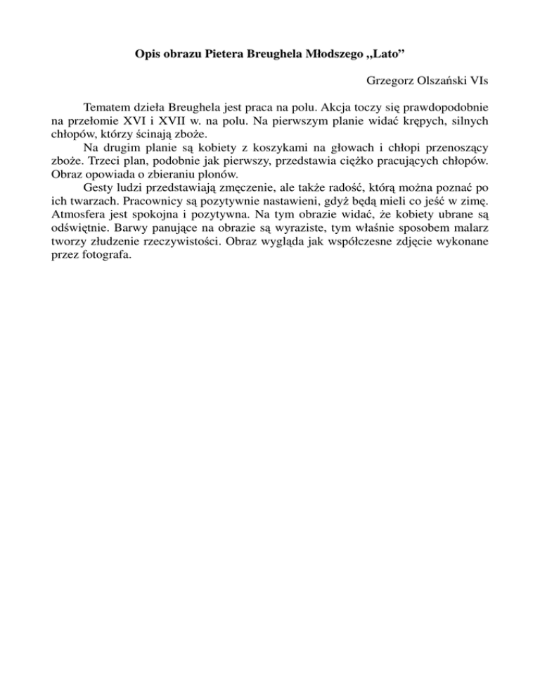 Opis obrazu Pietera Breughela Młodszego „Lato” Grzegorz Olszański VIs Tematem dzieła Breughela jest praca na polu. Akcja toczy się prawdopodobnie na przełomie XVI i XVII w. na polu. Na pierwszym planie widać krępych, silnych chłopów, którzy ścinają zboże. Na drugim planie są kobiety z koszykami na głowach i chłopi przenoszący zboże. Trzeci plan, podobnie jak pierwszy, przedstawia ciężko pracujących chłopów. Obraz opowiada o zbieraniu plonów. Gesty ludzi przedstawiają zmęczenie, ale także radość, którą można poznać po ich twarzach. Pracownicy są pozytywnie nastawieni, gdyż będą mieli co jeść w zimę. Atmosfera jest spokojna i pozytywna. Na tym obrazie widać, że kobiety ubrane są odświętnie. Barwy panujące na obrazie są wyraziste, tym właśnie sposobem malarz tworzy złudzenie rzeczywistości. Obraz wygląda jak współczesne zdjęcie wykonane przez fotografa.