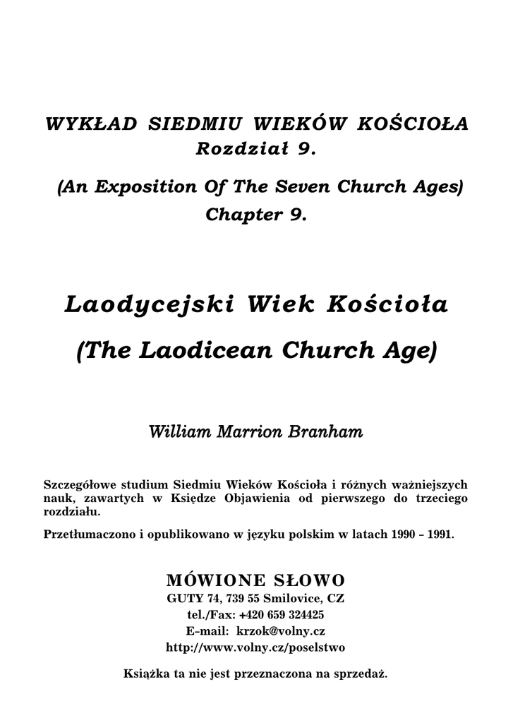 WYKŁAD SIEDMIU WIEKÓW KOŚCIOŁA Rozdział 9. (An Exposition Of The Seven Church Ages) Chapter 9. Laodycejski Wiek Kościoła (The Laodicean Church Age) William Marrion Branham Szczegóowe studium Siedmiu Wieków Ko™cioa i róŒnych waŒniejszych nauk, zawartych w KsiŸdze Objawienia od pierwszego do trzeciego rozdziau. Przetumaczono i opublikowano w jŸzyku polskim w latach 1990 - 1991. MÓWIONE S~OWO GUTY 74, 739 55 Smilovice, CZ tel./Fax: +420 659 324425 E-mail: [email protected] http://www.volny.cz/poselstwo KsiAŒka ta nie jest przeznaczona na sprzedaŒ. 2 ROZDZIA~ DZIEWIETY LAODYCEJSKI WIEK KOšCIO~A Objawienie 3, 14-22: A do anioa zboru w Laodycei napisz: To mówi Ten, który jest Amen, ™wiadek wierny i prawdziwy, pocz$tek stworzenia BoŒego. Znam uczynki twoje, Œe™ ani zimny, ani gor$cy. Oby™ by zimny albo gor$cy! A tak, Œe™ letni, a nie gor$cy ani zimny, wyplujŸ ciŸ z ust moich. PoniewaŒ mówisz: Bogaty jestem i wzbogaciem siŸ, i niczego nie potrzebujŸ, a nie wiesz, Œe™ poŒaowania godzien nŸdzarz i biedak, ™lepy i goy. RadzŸ ci, aby™ naby u mnie zota w ogniu wypróbowanego, aby™ siŸ wzbogaci i aby™ przyodzia szaty biae, aby nie wyst$pia na jaw haniebna nago™ø twoja, oraz ma™ci, by ni$ nama™ciø oczy twoje, aby™ przejrza. Wszystkich, których miujŸ, karcŸ i smagam; b$d› tedy gorliwy i upamiŸtaj siŸ. Oto stojŸ u drzwi i koaczŸ; je™li kto™ usyszy gos mój i otworzy drzwi, wst$piŸ do niego i bŸdŸ z nim wieczerza, a on ze mn$. ZwyciŸzcy pozwolŸ zasi$™ø ze mn$ na moim tronie, jak i Ja zwyciŸŒyem i zasiadem wraz z Ojcem moim na jego tronie. Kto ma uszy, niechaj sucha, co Duch mówi do zborów”. MIASTO LAODYCJA ImiŸ Laodycja, które oznacza ludzkie prawa”, byo bardzo rozpowszechnione i byo nadane kilku miastom, ku uczczeniu dam królewskich, które siŸ tak nazyway. To miasto byo jednym z najwaŒniejszych politycznie i kwitn$cym gospodarczo miastem w Azji Mniejszej. Ogromna ilo™ø posiado™ci zostaa zapisana w spu™ci›nie temu miastu przez wybitnych obywateli. Byo ono siedzib$ synnej szkoy medycznej. Jego obywatele odznaczali siŸ w sztuce i w nauce. CzŸsto byo nazywane metropoli$”, poniewaŒ byo siedzib$ administracji dla innych dwudziestu piŸciu miast. Poga§skim bogiem, któremu tam oddawano cze™ø, by Zeus. W rzeczywisto™ci miasto to byo kiedy™ nazywane Diopolis (miasto Zeusa) na cze™ø ich boga. W czwartym wieku odby siŸ tam waŒny sobór ko™cioa. CzŸste trzŸsienia ziemi spowodoway w ko§cu, Œe zostao cakowicie opuszczone. Jak trafnie charakteryzuj$ cechy tego ostatniego wieku ten wiek, w LAODYCEJSKI WIEK KOšCIO~A 3 którym Œyjemy obecnie. Oni, na przykad, oddawali cze™ø jednemu bogu, Zeusowi, który by najwyŒszym z bogów, ich ojcem. Byo to religijn$ przesank$ idei dwudziestego wieku jednego Boga, ojca nas wszystkich”, która gosi braterstwo miŸdzy lud›mi, i obecnie zgromadza razem protestantów, katolików, ?ydów, hindusów, itd. z t$ intencj$, Œe wzajemna forma oddawania czci powiŸkszy nasz$ mio™ø, zrozumienie i troskŸ jeden o drugiego. Katolicy i protestanci usiuj$ obecnie o to, i w rzeczywisto™ci odnosz$ w tym sukcesy, z tym zamiarem, Œe bŸd$ ich na™ladowaø wszyscy pozostali. To samo nastawienie widzimy w Organizacji Narodów Zjednoczonych, kiedy ci ™wieccy przywódcy odmówili uznaø jak$kolwiek indywidualn$ koncepcjŸ duchowego oddawania czci, ale polecili usun$ø na bok wszystkie odrŸbne koncepcje w nadziei, Œe wszystkie religie zrównaj$ siŸ z t$ jedn$, bowiem wszystkie pragn$ osi$gn$ø te same cele, wszystkie maj$ te same zamiary i wszystkie maj$ w gruncie rzeczy prawdŸ. Zwróøcie uwagŸ na t$ nazwŸ _ Laodycja _ ludzkie prawa”, albo sprawiedliwo™ø ludzka.” Czy by kiedy taki wiek, jak wiek ko™cioa dwudziestego wieku, w którym ogl$damy, Œe WSZYSTKIE narody powstaj$ i domagaj$ siŸ równouprawnienia, socjalnego i finansowego? To jest wiek komunistów, w którym wszyscy ludzie s$ sobie na pozór równi, lecz tak jest tylko w teorii. To jest wiek partii politycznych, które siŸ nazywaj$ Chrze™cija§scy Demokraci, Chrze™cija§scy Socjali™ci, Chrze™cija§ska Demokratyczna Federacja, itd. Wedug naszych liberalnych teologów Jezus by socjalist$, a wczesny ko™ció pod przewodnictwem Ducha praktykowa socjalizm, i dlatego powinni™my tak dzisiaj czyniø. Kiedy ci przodkowie nazwali LaodycjŸ metropoli$, oni d$Œyli do jednej wadzy nad caym ™wiatem, któr$ wa™nie obecnie zaprowadzamy. JeŒeli my™limy o tym mie™cie, jako o siedzibie wielkiego soboru ko™cioa, widzimy przedcie§ ekumenicznego ruchu, zajmuj$cego dzisiaj swoje miejsce, w wyniku czego wkrótce zobaczymy wszystkich tak zwanych” chrze™cijan, zgromadzaj$cych siŸ razem. W rzeczywisto™ci ko™ció i pa§stwo, religia i polityka zgromadzaj$ siŸ razem. K$kol zostaje zwi$zany. Pszenica bŸdzie wkrótce gotowa do zbiorów do gumien. Byo to miasto trzŸsie§ ziemi i to takich trzŸsie§ ziemi, Œe je w ko§cu zniszczyy. Ten wiek zako§czy siŸ na tym, Œe Bóg zatrzŸsie caym ™wiatem, który uda siŸ do popeniania cudzoóstwa z t$ star$ wszetecznic$. Nie tylko, Œe zaamie siŸ ten stary ™wiecki system, lecz caa ziemia zostanie wstrz$™niŸta i nastŸpnie odnowiona dla tysi$cletniego królestwa Chrystusa. Owo miasto byo bogate, wspierane finansowo przez zamoŒnych. Kwita w nim kultura i wiedza. Podobnie jak dzisiaj. Ko™cioy s$ 4 SIEDEM WIEKÓW KOšCIO~A bogate. Oddawanie czci jest przepiŸkne i przepisowe, lecz chodne i martwe. Kultura i wyksztacenie zajŸy miejsce darowanego przez Ducha Sowa, a wiara zostaa zast$piona przez naukŸ, tak, Œe czowiek sta siŸ ofiar$ materializmu. W Laodycejskim Okresie dwudziestego wieku znajdujemy odrodzenie wszystkich charakterystycznych cech staroŒytnej Laodycji. Przez miosierdzie BoŒe, niechaj ci, którzy maj$ ucho do suchania, wyjd$ z niej, aby nie byli uczestnikami jej grzechów, a w konsekwencji s$du. LAODYCEJSKI WIEK Lao