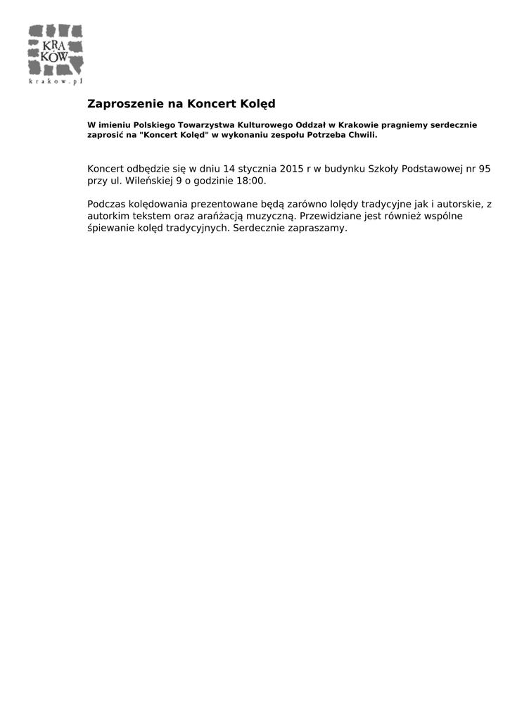 Zaproszenie na Koncert Kolęd W imieniu Polskiego Towarzystwa Kulturowego Oddzał w Krakowie pragniemy serdecznie zaprosić na "Koncert Kolęd" w wykonaniu zespołu Potrzeba Chwili. Koncert odbędzie się w dniu 14 stycznia 2015 r w budynku Szkoły Podstawowej nr 95 przy ul. Wileńskiej 9 o godzinie 18:00. Podczas kolędowania prezentowane będą zarówno lolędy tradycyjne jak i autorskie, z autorkim tekstem oraz arańżacją muzyczną. Przewidziane jest również wspólne śpiewanie kolęd tradycyjnych. Serdecznie zapraszamy. Powered by TCPDF (www.tcpdf.org)