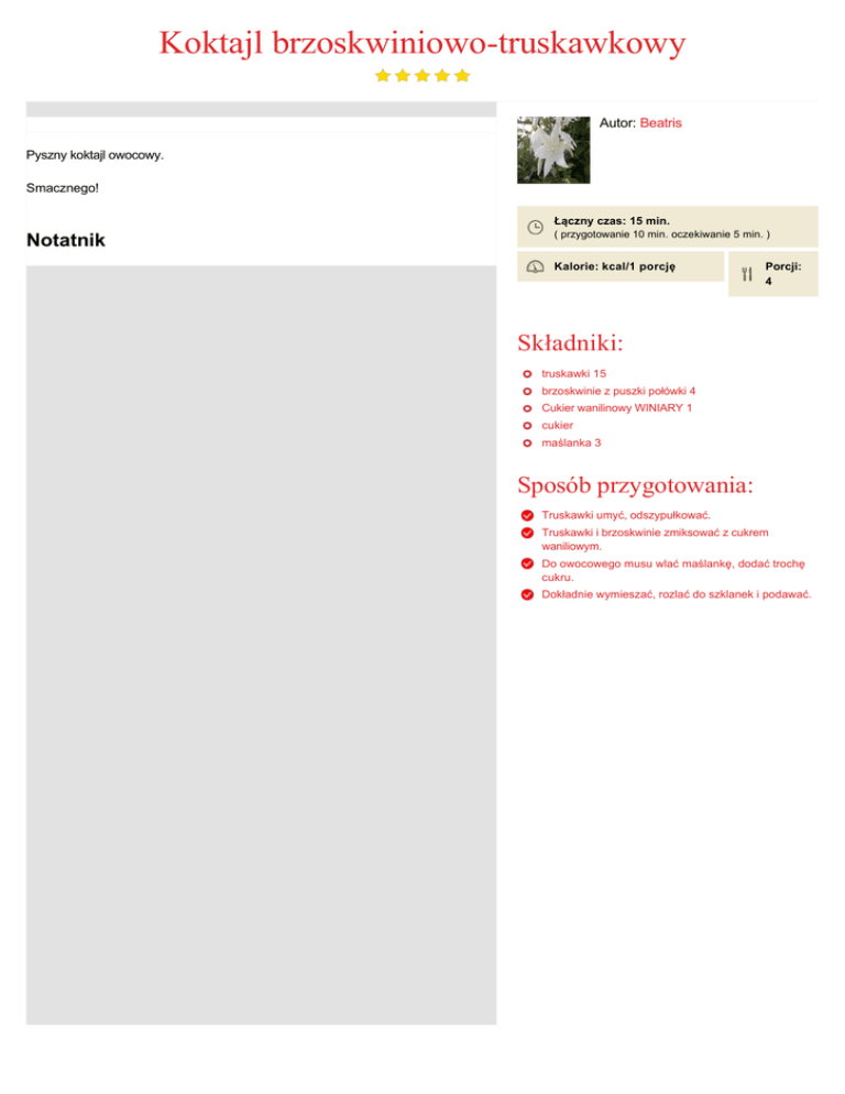 Koktajl brzoskwiniowotruskawkowy Autor: Beatris Pyszny koktajl owocowy. Smacznego! Łączny czas: 15 min. Notatnik ( przygotowanie 10 min. oczekiwanie 5 min. ) Kalorie: kcal/1 porcję Porcji: 4 Składniki: truskawki 15 brzoskwinie z puszki połówki 4 Cukier wanilinowy WINIARY 1 cukier maślanka 3 Sposób przygotowania: Truskawki umyć, odszypułkować. Truskawki i brzoskwinie zmiksować z cukrem waniliowym. Do owocowego musu wlać maślankę, dodać trochę cukru. Dokładnie wymieszać, rozlać do szklanek i podawać.