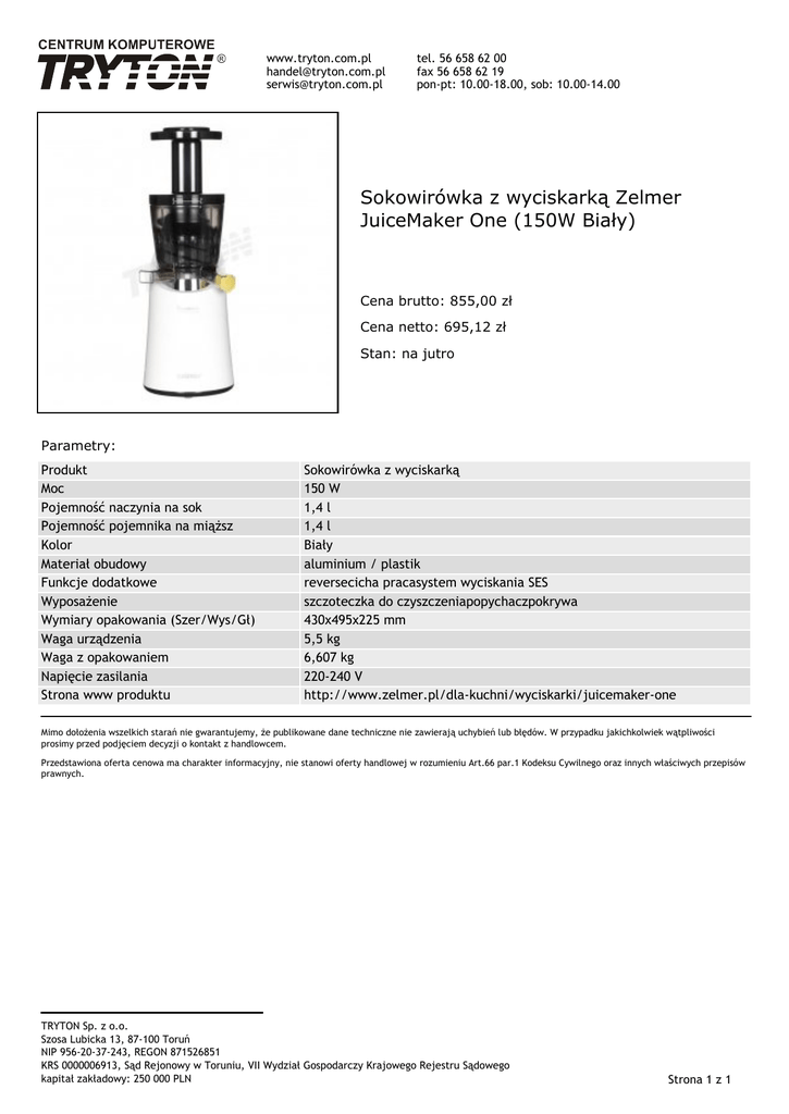 www.tryton.com.pl [email protected] [email protected] tel. 56 658 62 00 fax 56 658 62 19 pon-pt: 10.00-18.00, sob: 10.00-14.00 Sokowirówka z wyciskarką Zelmer JuiceMaker One (150W Biały) Cena brutto: 855,00 zł Cena netto: 695,12 zł Stan: na jutro Parametry: Produkt Moc Pojemność naczynia na sok Pojemność pojemnika na miąższ Kolor Materiał obudowy Funkcje dodatkowe Wyposażenie Wymiary opakowania (Szer/Wys/Gł) Waga urządzenia Waga z opakowaniem Napięcie zasilania Strona www produktu Sokowirówka z wyciskarką 150 W 1,4 l 1,4 l Biały aluminium / plastik reversecicha pracasystem wyciskania SES szczoteczka do czyszczeniapopychaczpokrywa 430x495x225 mm 5,5 kg 6,607 kg 220-240 V http://www.zelmer.pl/dla-kuchni/wyciskarki/juicemaker-one Mimo dołożenia wszelkich starań nie gwarantujemy, że publikowane dane techniczne nie zawierają uchybień lub błędów. W przypadku jakichkolwiek wątpliwości prosimy przed podjęciem decyzji o kontakt z handlowcem. Przedstawiona oferta cenowa ma charakter informacyjny, nie stanowi oferty handlowej w rozumieniu Art.66 par.1 Kodeksu Cywilnego oraz innych właściwych przepisów prawnych. TRYTON Sp. z o.o. Szosa Lubicka 13, 87-100 Toruń NIP 956-20-37-243, REGON 871526851 KRS 0000006913, Sąd Rejonowy w Toruniu, VII Wydział Gospodarczy Krajowego Rejestru Sądowego kapitał zakładowy: 250 000 PLN Strona 1 z 1