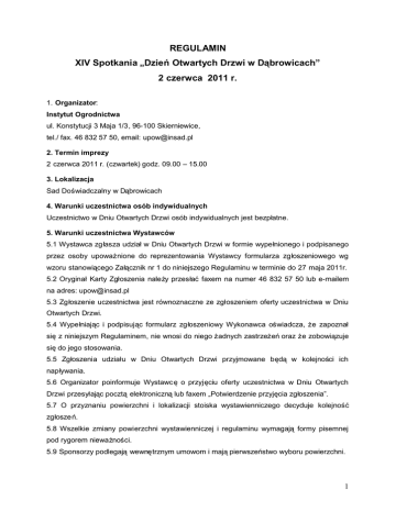 REGULAMIN XIV Spotkania „DzieńOtwartych Drzwi w Dąbrowicach” 2 czerwca 2011 r. 1. Organizator: Instytut Ogrodnictwa ul. Konstytucji 3 Maja 1/3, 96-100 Skierniewice, tel./ fax. 46 832 57 50, email: [email protected] 2. Termin imprezy 2 czerwca 2011 r. (czwartek) godz. 09.00 – 15.00 3. Lokalizacja Sad Doświadczalny w Dąbrowicach 4. Warunki uczestnictwa osób indywidualnych Uczestnictwo w Dniu Otwartych Drzwi osób indywidualnych jest bezpł atne. 5. Warunki uczestnictwa Wystawców 5.1 Wystawca zgł asza udziałw Dniu Otwartych Drzwi w formie wypeł nionego i podpisanego przez osoby upoważnione do reprezentowania Wystawcy formularza zgł oszeniowego wg wzoru stanowiącego Zał ącznik nr 1 do niniejszego Regulaminu w terminie do 27 maja 2011r. 5.2 OryginałKarty Zgł oszenia należ y przesł aćfaxem na numer 46 832 57 50 lub e-mailem na adres: [email protected] 5.3 Zgł oszenie uczestnictwa jest równoznaczne ze zgł oszeniem oferty uczestnictwa w Dniu Otwartych Drzwi. 5.4 Wypeł niając i podpisując formularz zgł oszeniowy Wykonawca oświadcza, że zapoznał sięz niniejszym Regulaminem, nie wnosi do niego żadnych zastrzeżeńoraz że zobowiązuje siędo jego stosowania. 5.5 Zgł oszenia udział u w Dniu Otwartych Drzwi przyjmowane będą w kolejnoś ci ich napł ywania. 5.6 Organizator poinformuje Wystawcęo przyjęciu oferty uczestnictwa w Dniu Otwartych Drzwi przesył ając pocztąelektronicznąlub faxem „Potwierdzenie przyjęcia zgł oszenia”. 5.7 O przyznaniu powierzchni i lokalizacji stoiska wystawienniczego decyduje kolejność zgł oszeń. 5.8 Wszelkie zmiany powierzchni wystawienniczej i regulaminu wymagająformy pisemnej pod rygorem nieważ ności. 5.9 Sponsorzy podlegająwewnętrznym umowom i mająpierwszeństwo wyboru powierzchni. 1 6. Warunki pł atności 6.1 Opł atęza wynajętąpowierzchnię oraz dodatkowe opł aty wynikające ze zgł oszenia Wystawcy dokonywać będą przelewem na konto Organizatora w banku PEKAO S.A. O/Skierniewice 42 1240 3321 1111 0000 2853 6660 z adnotacją„DzieńOtwartych Drzwi”. Organizator wystawi, prześle lub doręczy Wystawcy fakturęVAT z ostatecznym rozliczeniem kosztów za udziałw Spotkaniu w terminie 10 dni roboczych od daty jej zakończenia. 6.2 Opł ata za wynajem powierzchni wystawienniczej obejmuje ogólne sprzątanie stoisk, wywóz ś mieci, oznakowanie stoisk, reklamę, promocjęoraz koszty związane z organizacją imprezy. 7. Odwoł anie uczestnictwa 7.1 Odwoł anie oferty uczestnictwa wymaga formy pisemnej pod rygorem nieważ ności. 7.2 Wystawcom, którzy odwoł ali ofertęuczestnictwa w Dniach Otwartych Drzwi w terminie do 7 dni przed jej rozpoczęciem zostanie zwrócona opł ata za wynajętąpowierzchnię. 7.3 W przypadku odwoł ania oferty uczestnictwa w terminie krótszym niż 7 dni przed rozpoczęciem Dni Otwartych Drzwi, opł ata za wynajem powierzchni wystawienniczej nie podlega zwrotowi Wystawcy. 7.4 Podmiotom, które odwoł ał y ofertęuczestnictwa nie przysł ugująświadczenia objęte opł atą okreś lonąw pkt 6 Regulaminu. 8. Forma udział u 8.1 Wystawca bierze udziałw Konferencji we wł asnym imieniu i na wł asnąrzecz. 8.2 Wystawca nie może bez pisemnej zgody Organizatora podnajmowaćlub oddawaćdo bezpł atnego uż ytku części wynajętej powierzchni. Zgł oszenie podwykonawcy wymaga formy pisemnej. 9. Powierzchnia wystawiennicza i stoisko 9.1 O lokalizacji i kształ cie stoiska decyduje Organizator na podstawie kolejnoś ci zgł oszeń. Życzenia i sugestie Wystawcy dotyczące stoiska Organizator będzie realizowałw miarę moż liwoś ci technicznych i organizacyjnych. 9.2 Organizator dostarczy Wystawcy program Drzwi Otwartych w Dąbrowicach oraz lokalizacjęstoiska najpóźniej na tydzieńprzed jej rozpoczęciem. 9.3 Organizator zastrzega sobie prawo do zmiany wielkości zamówionej powierzchni lub lokalizacji stoiska po terminie określonym w pkt. 9.2, jeż eli zaistnieje taka konieczność wynikająca z warunków techniczno – organizacyjnych. O dokonanej zmianie Organizator powiadomi niezwł ocznie Wystawcę. 10. Cennik za wynajmowanąpowierzchnię(Koszt netto): 10.1 Wystawca może wynająć: 2 a) Stoisko reklamowe mał e (1 stolik z krzesł ami) – koszt 350,00 zł b) Stoisko reklamowe duż e (2 stoliki z krzesł ami) – koszt 550,00 zł 2 c) Ekspozycja maszyn i sprzętu (powierzchnia > 20 m ) – koszt 650,00 zł 10.2 W ramach opł aty za powierzchnięwystawiennicząOrganizator zapewnia: a) Wynajęcie powierzchni wystawienniczej w dniu 2.06.2011 r. (godz.9.00-15.00) b) ReklamęSpotkania oraz reklamęFirmy w radiowęź le na terenie Sadu Doś wiadczalnego w Dąbrowicach c) Informacjęo Konferencji kierowanądo potencjalnych klientów, d) Sprzątanie ciągów komunikacyjnych i terenu Konferencji, 10.3 Wszelkie dodatkowe usł ugi związane z urządzeniem i wyposażeniem stoiska są odpł atne. 11. Zabudowa stoiska Organizator nie przewiduje wykonania zabudowy stoisk. 12. Zasady reprezentacji eksponatów i usł ug 12.1 Wystawca zobowiązany jest do prezentacji swojej oferty zgodnej z zakresem tematycznym Konferencji. Na ż ądanie Organizatora Wystawca zobowiązany jest do usunięcia ekspozycji niezgodnej z zakresem tematycznym. W przypadku niedopeł nienia ww. obowiązku Organizator ma prawo usunąćeksponaty z powierzchni wystawienniczej lub dokonaćjej zamknięcia na koszt i ryzyko Wystawcy. 12.2 Wystawca zobowiązany jest do poinformowania Organizatora o zamiarze eksponowania elementów, których waga przekracza 700 kg/1m 2 . 13. Reklama 13.1 Wystawca ma prawo do reklamy swojej firmy i jej produktów na terenie wynajętej przez siebie powierzchni wystawienniczej poprzez: a) Materiał y poligraficzne: ulotki, oferty, plakaty, foldery, mapy, zdjęcia itp.; b) Reklamęaudiowizualną(przy uż yciu komputerów, odtwarzaczy audio video, rzutników, monitorów) 13.2 Wystawca realizuje reklamęna wł asny koszt i odpowiedzialność . 13.3 Reklama na terenie Sadu Doświadczalnego w Dąb