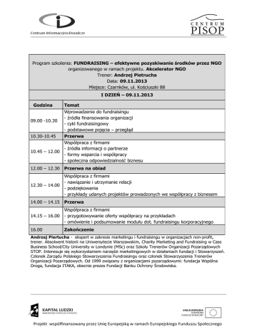 Program szkolenia: FUNDRAISING – efektywne pozyskiwanie środków przez NGO organizowanego w ramach projektu. Akcelerator NGO Trener: Andrzej Pietrucha Data: 09.11.2013 Miejsce: Czarnków, ul. Kościuszki 88 I DZIEŃ – 09.11.2013 Godzina Temat Wprowadzenie do fundraisingu - źródła finansowania organizacji 09.00 -10.30 - cykl fundraisingowy - podstawowe pojęcia – przegląd 10.30-10.45 Przerwa Współpraca z firmami - źródła informacji o partnerze 10.45 – 12.00 - formy wsparcia i współpracy - społeczna odpowiedzialność biznesu 12.00 – 12.30 Przerwa na obiad Współpraca z firmami - nawiązanie i utrzymanie relacji 12.30 – 14.00 - podziękowania - przykłady udanych projektów prowadzonych we współpracy z biznesem 14.00 – 14.15 Przerwa Współpraca z firmami 14.15 – 16.00 - przygotowywanie oferty współpracy na przykładach - omówienie i podsumowanie modułu dot. fundraisingu korporacyjnego 16.00 Zakończenie Andrzej Piertucha - ekspert w zakresie marketingu i fundraisingu w organizacjach non-profit, trener. Absolwent historii na Uniwersytecie Warszawskim, Charity Marketing and Fundraising w Cass Business School/City University w Londynie (MSc) oraz Szkoły Trenerów Organizacji Pozarządowych STOP. Interesuje się wykorzystaniem narzędzi marketingowych w działaniach fundacji i Stowarzyszeń. Członek Zarządu Polskiego Stowarzyszenia Fundraisingu oraz członek Stowarzyszenia Trenerów Organizacji Pozarządowych. Od 1999 związany z organizacjami pozarządowymi: fundacja Wspólna Droga, fundacja ITAKA, obecnie prezes Fundacji Banku Ochrony Środowiska. Projekt współfinansowany przez Unię Europejską w ramach Europejskiego Funduszu Społecznego