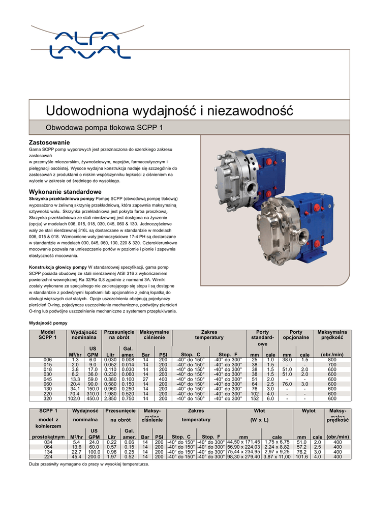 . ky Udowodniona wydajność i niezawodność Obwodowa pompa tłokowa SCPP 1 Zastosowanie Gama SCPP pomp wyporowych jest przeznaczona do szerokiego zakresu zastosowań w przemyśle mleczarskim, żywnościowym, napojów, farmaceutycznym i pielęgnacji osobistej. Wysoce wydajna konstrukcja nadaje się szczególnie do zastosowań z produktami o niskim współczynniku lepkości z ciśnieniem na wylocie w zakresie od średniego do wysokiego. Wykonanie standardowe Skrzynka przekładniowa pompy Pompę SCPP (obwodową pompę tłokową) wyposażono w żeliwną skrzynię przekładniową, która zapewnia maksymalną sztywność wału. Skrzynka przekładniowa jest pokryta farba proszkową. Skrzynka przekładniowa ze stali nierdzewnej jest dostępna na życzenie (opcja) w modelach 006, 015, 018, 030, 045, 060 & 130. Jednoczęściowe wały ze stali nierdzewnej 316L są dostarczane w standardzie w modelach 006, 015 & 018. Wzmocnione wały jednoczęściowe 17-4 PH są dostarczane w standardzie w modelach 030, 045, 060, 130, 220 & 320. Czterokierunkowe mocowanie pozwala na umieszczenie portów w poziomie i pionie i zapewnia elastyczność mocowania. Konstrukcja głowicy pompy W standardowej specyfikacji, gama pomp SCPP posiada obudowę ze stali nierdzewnej AISI 316 z wykończeniem powierzchni wewnętrznej Ra 32/Ra 0,8 zgodnie z normami 3A. Wirniki zostały wykonane ze specjalnego nie zacierającego się stopu i są dostępne w standardzie z podwójnymi łopatkami lub opcjonalnie z jedną łopatką do obsługi większych ciał stałych. Opcje uszczelnienia obejmują pojedynczy pierścień O-ring, pojedyncze uszczelnienie mechaniczne, podwójny pierścień .O-ring lub podwójne uszczelnienie mechaniczne z systemem przepłukiwania. Wydajność pompy Model SCPP 1 006 015 018 030 045 060 130 220 320 Wydajność nominalna M3/hr 1.3 2.0 3.8 8.2 13.3 20.4 34.1 70.4 102.0 US GPM 6.0 9.0 17.0 36.0 59.0 90.0 150.0 310.0 450.0 Przesunięcie na obrót Litr 0.030 0.052 0.110 0.230 0.380 0.580 0.960 1.980 2.850 Gal. amer. 0.008 0.014 0.030 0.060 0.100 0.150 0.250 0.520 0.750 SCPP 1 Wydajność Przesunięcie model z kołnierzem nominalna na obrót prostokątnym 034 064 134 224 M3/hr 5.4 13.6 22.7 45.4 US GPM 24.0 60.0 100.0 200.0 Litr 0.22 0.57 0.96 1.97 Gal. amer. 0.06 0.15 0.25 0.52 Maksymalne ciśnienie Bar 14 14 14 14 27 14 14 14 14 PSI 200 200 200 200 400 200 200 200 200 Maksymalne ciśnienie Bar 14 14 14 14 Duże prześwity wymagane do pracy w wysokiej temperaturze. PSI 200 200 200 200 Zakres temperatury Stop. C -40° do 150° -40° do 150° -40° do 150° -40° do 150° -40° do 150° -40° do 150° -40° do 150° -40° do 150° -40° do 150° Stop. F -40° do 300° -40° do 300° -40° do 300° -40° do 300° -40° do 300° -40° do 300° -40° do 300° -40° do 300° -40° do 300° Porty standardowe Porty opcjonalne mm 25 38 38 38 51 64 76 102 152 mm 38.0 51.0 51.0 76.0 - cale 1.0 1.5 1.5 1.5 2.0 2.5 3.0 4.0 6.0 Zakres Wlot temperatury (W x L) Stop. C -40° do 150° -40° do 150° -40° do 150° -40° do 150° Stop. F -40° do 300° -40° do 300° -40° do 300° -40° do 300° mm 44,50 x 171,45 56,90 x 224,03 75,44 x 234,95 98,30 x 279,40 cale 1,75 x 6,75 2,24 x 8,82 2,97 x 9,25 3,87 x 11,00 cale 1.5 2.0 2.0 3.0 Wylot Maksymalna prędkość (obr./min) 800 700 600 600 600 600 600 600 600 Maksymalna prędkość mm cale (obr./min) 51.0 2.0 400 57.2 2.5 400 76.2 3.0 400 101.6 4.0 400 Materiały konstrukcyjne Skrzynka przekładniowa pompy – wysokiej jakości żeliwo w kolorze szarym. Głowica pompy - elementy mające kontakt z produktem ze stali nierdzewnej 316L i wirniki ze specjalnego materiału nie zacierającego się. Elastomery mające kontakt z produktem EPDM, FPM, wszystkie zgodne z FDA. Opcje uszczelnienia wału …do różnych cieczy i warunków serwisowych Pojedyncze pierścienie O-Ring - Pierścienie O-ring i uszczelnienia osłony w standardzie: Pierścienie O-ring i uszczelnienia osłony dostępne jako opcja: Buna Wirniki z podwójną łopatką w standardzie. Zapewnia minimalne drgania. FPM, EPDM, silikon TD 249-003 Podwójne pierścienie O-Ring z systemem przepłukiwania - Pierścienie O-ring i uszczelnienia osłony w Buna - standardzie: Pierścienie O-ring i uszczelnienia osłony dostępne jako opcja: TD 249-005 FPM, EPDM, silikon TD 249-002 Pojedyncze uszczelnienia mechaniczne - Powierzchnie uszczelniające w standardzie: Pierścienie O-ring i uszczelnienia osłony w standardzie: Powierzchnie dostępne w opcji: Pierścienie O-ring i uszczelnienia osłony dostępne jako opcja: SiC/SiC Buna ze stali węglowej, ceramiczne FPM, EPDM, silikon Wirniki z jedną łopatką dostępne w opcji. Zapewnia mniejszą prędkość w przypadku cieczy wrażliwych na prędkość lub większych ciał stałych takich jak kawałki owoców, orzechy, twaróg lub mięso. TD249001.eps Podwójne uszczelnienia mechaniczne z systemem przepłukiwania - Powierzchnie uszczelniające w standardzie: SiC/SiC - Pierścienie O-ring i uszczelnienia osłony w Buna - TD 249-004 standardzie: Powierzchnie dostępne w opcji: Pierścienie O-ring i uszczelnienia osłony dostępne jako opcja: ze stali węglowej, ceramiczne FPM, EPDM, silikon TD 249-006 Zasada działania obwodowej, tłokowej pompy wyporowej Alfa Laval Łopatki wirnika (tłoki) Alfa Laval obracają się po obwodzie kanału w obudowie pompy. To działanie w sposób nieprzerwany wytwarza podciśnienie przy króćcu wlotowym, ponieważ wirniki nie zazębiają się powodując przedostawanie się cieczy do pompy. Ciecz jest transportowana wokół kanału przez łopatki wirnika i jest wypierana, ponieważ łopatki ponownie się zazębiają generując ciśnienie przy króćcu wylotowym. Kierunek przepływu jest odwracalny. TD 249-008 TD 249-009 Głębokie kanały, w których przesuwają się wirniki zapewniają duże luki, pozwalające na zminimalizowanie prędkości i uszkodzeń ciał stałych. TD 249-012 TD 249-010 Wirniki zostały wykonane z nie zacierającego się stopu, co pozwala na