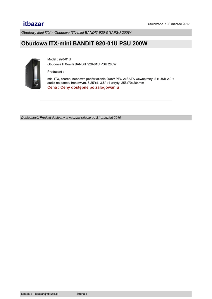itbazar Utworzono : 08 marzec 2017 Obudowy Mini ITX > Obudowa ITX-mini BANDIT 920-01U PSU 200W Obudowa ITX-mini BANDIT 920-01U PSU 200W Model : 920-01U Obudowa ITX-mini BANDIT 920-01U PSU 200W Producent : mini ITX, czarna, neonowe podświetlanie,200W PFC 2xSATA wewnętrzny, 2 x USB 2.0 + audio na panelu frontowym, 5,25"x1, 3,5" x1 ukryty, 258x70x284mm Cena : Ceny dostępne po zalogowaniu Dostępność: Produkt dostępny w naszym sklepie od 21 grudzień 2010 kontakt : - [email protected] Strona 1