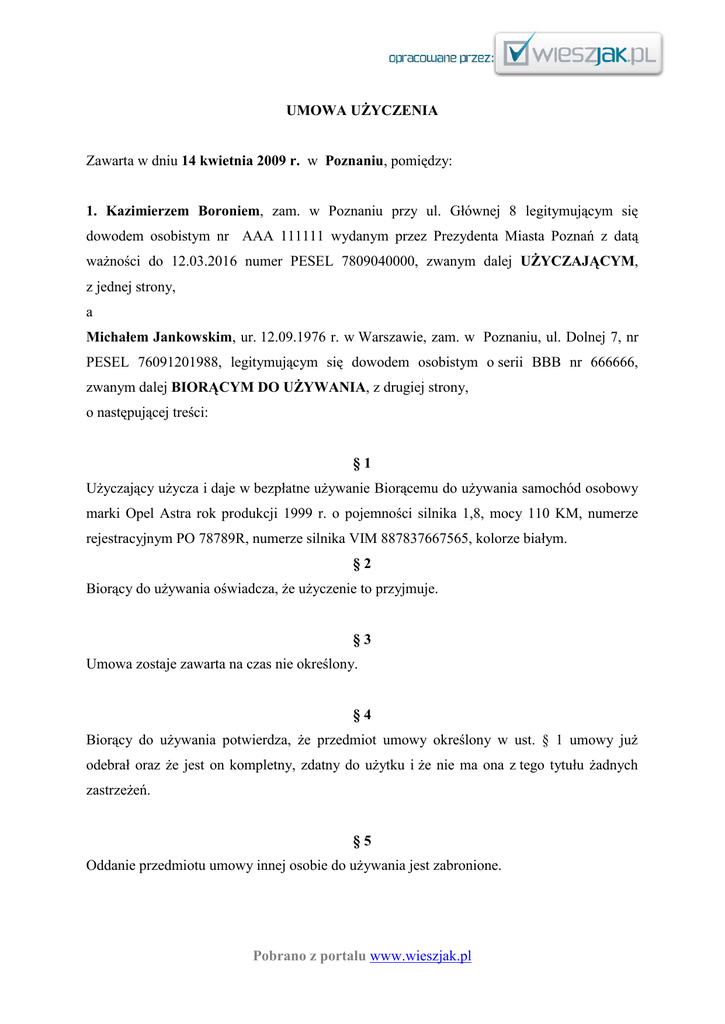 UMOWA UŻYCZENIA Zawarta w dniu 14 kwietnia 2009 r. w Poznaniu, pomiędzy: 1. Kazimierzem Boroniem, zam. w Poznaniu przy ul. Głównej 8 legitymującym się dowodem osobistym nr AAA 111111 wydanym przez Prezydenta Miasta Poznań z datą ważności do 12.03.2016 numer PESEL 7809040000, zwanym dalej UŻYCZAJĄCYM, z jednej strony, a Michałem Jankowskim, ur. 12.09.1976 r. w Warszawie, zam. w Poznaniu, ul. Dolnej 7, nr PESEL 76091201988, legitymującym się dowodem osobistym o serii BBB nr 666666, zwanym dalej BIORĄCYM DO UŻYWANIA, z drugiej strony, o następującej treści: §1 Użyczający użycza i daje w bezpłatne używanie Biorącemu do używania samochód osobowy marki Opel Astra rok produkcji 1999 r. o pojemności silnika 1,8, mocy 110 KM, numerze rejestracyjnym PO 78789R, numerze silnika VIM 887837667565, kolorze białym. §2 Biorący do używania oświadcza, że użyczenie to przyjmuje. §3 Umowa zostaje zawarta na czas nie określony. §4 Biorący do używania potwierdza, że przedmiot umowy określony w ust. § 1 umowy już odebrał oraz że jest on kompletny, zdatny do użytku i że nie ma ona z tego tytułu żadnych zastrzeżeń. §5 Oddanie przedmiotu umowy innej osobie do używania jest zabronione. Pobrano z portalu www.wieszjak.pl §6 Korzystanie z przedmiotu umowy dozwolone jest wyłącznie na terenie kraju. §7 1. Wszelkie naprawy w czasie trwania użyczenia Biorący do używania prowadzi na własny koszt oraz zwróci przedmiot umowy w stanie niepogorszonym. 2. Biorący do używania jest odpowiedzialny za przypadkową utratę przedmiotu umowy, jeżeli używał go w sposób sprzeczny z umową lub z przeznaczeniem. §8 Niezwłocznie po upływie czasu obowiązywania umowy Biorący do używania jest obowiązany zwrócić przedmiotowy samochód do siedziby Użyczającego. §9 W sprawach nieuregulowanych niniejszą umową mają zastosowanie przepisy Kodeksu cywilnego. § 10 Umowę sporządzono w dwóch jednobrzmiących egzemplarzach, po jednym dla każdej ze stron. ........................................... ............................................. UŻYCZAJĄCY BIORĄCY DO UŻYWANIA Pobrano z portalu www.wieszjak.pl