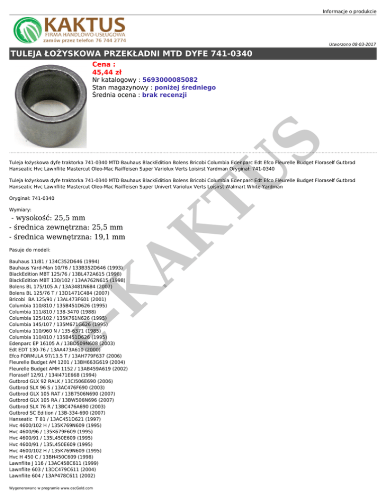 Informacje o produkcie Utworzono 08-03-2017 TULEJA ŁOŻYSKOWA PRZEKŁADNI MTD DYFE 741-0340 Cena : 45,44 zł S Nr katalogowy : 5693000085082 Stan magazynowy : poniżej średniego Średnia ocena : brak recenzji AK TU Tuleja łożyskowa dyfe traktorka 741-0340 MTD Bauhaus BlackEdition Bolens Bricobi Columbia Edenparc Edt Efco Fleurelle Budget Floraself Gutbrod Hanseatic Hvc Lawnflite Mastercut Oleo-Mac Raiffeisen Super Variolux Verts Loisirst Yardman Oryginał: 741-0340 Tuleja łożyskowa dyfe traktorka 741-0340 MTD Bauhaus BlackEdition Bolens Bricobi Columbia Edenparc Edt Efco Fleurelle Budget Floraself Gutbrod Hanseatic Hvc Lawnflite Mastercut Oleo-Mac Raiffeisen Super Univert Variolux Verts Loisirst Walmart White Yardman Oryginał: 741-0340 Wymiary: - wysokość: 25,5 mm - średnica zewnętrzna: 25,5 mm - średnica wewnętrzna: 19,1 mm Pasuje do modeli: eK Bauhaus 11/81 / 134C352D646 (1994) Bauhaus Yard-Man 10/76 / 133B352D646 (1993) BlackEdition MBT 125/76 / 13BL472A615 (1998) BlackEdition MBT 130/102 / 13AA762N615 (1998) Bolens BL 175/105 A / 13A3481N684 (2007) Bolens BL 125/76 T / 13D1471C484 (2007) Bricobi BA 125/91 / 13AL473F601 (2001) Columbia 110/810 / 135B451D626 (1995) Columbia 111/810 / 138-3470 (1988) Columbia 125/102 / 135K761N626 (1995) Columbia 145/107 / 135M671G626 (1995) Columbia 110/960 N / 135-6371 (1985) Columbia 110/810 / 135B451D626 (1995) Edenparc EP 16105 A / 13BD509N608 (2003) Edt EDT 130-76 / 13AA473A610 (2000) Efco FORMULA 97/13.5 T / 13AH779F637 (2006) Fleurelle Budget AM 1201 / 13BH663G619 (2004) Fleurelle Budget AMH 1152 / 13AB459A619 (2002) Floraself 12/91 / 134I471E668 (1994) Gutbrod GLX 92 RALK / 13CI506E690 (2006) Gutbrod SLX 96 S / 13AC476F690 (2003) Gutbrod GLX 105 RAT / 13B7506N690 (2007) Gutbrod GLX 105 RA / 13BW506N696 (2007) Gutbrod SLX 76 R / 13BC476A690 (2003) Gutbrod SC Edition / 13B-334-690 (2007) Hanseatic T 81 / 13AC451D621 (1997) Hvc 4600/102 H / 135K769N609 (1995) Hvc 4600/96 / 135K679F609 (1995) Hvc 4600/91 / 135L450E609 (1995) Hvc 4600/91 / 135L450E609 (1995) Hvc 4600/102 H / 135K769N609 (1995) Hvc H 450 C / 13BH450C609 (1998) Lawnflite J 116 / 13AC458C611 (1999) Lawnflite 603 / 13DC479C611 (2004) Lawnflite 604 / 13AP478C611 (2002) Wygenerowano w programie www.oscGold.com eK S AK TU Lawnflite 908 / 13BQ509N611 (2003) Lawnflite 903 / 13AM489N611 (2006) Lawnflite 503 / 13B-332-611 (2005) Mastercut 11/81 / 13BB450D659 (2000) Mastercut 16/102 / 13AT761N659 (1997) Mastercut VI 125/96 / 13AC665F659 (2002) Mastercut 92 A / 13AH483E659 (2007) Mastercut 125/76 / 13AH452C659 (2000) Mastercut B 12 / 13AH450F659 (1999) Mtd B 10 / 13A1451D600 (2000) Mtd 11/30 / 133C679C600 (1993) Mtd Sprinto / 13A-315-678 (2000) Mtd J/115 / 13AA458C670 (2000) Mtd 12/81 / 135H450D678 (1995) Mtd Junior 115 / 13DH452C600 (2006) Mtd B 124 / 13AH455F661 (1999) Mtd Sprinto / 13B-33E-678 (2006) Mtd RH 150/105 / 13A3488N400 (2006) Mtd JE 135 A / 13AH488E670 (2007) Mtd L 450 E / 135L450E678 (1995) Mtd B/160 / 13AT675G678 (1997] Mtd B 155 / 13AA688G678 (2003) Mtd B/115 / 13AC458D678 (2000) Mtd J 125 / 136L450C678 (1996) Mtd B 155 / 13AP678G678 (2000) Mtd B/130 / 13AA478F678 (2000) Mtd B 560 C / 134B560C678 (1994) Mtd SN 150 A / 13BA508N678 (2003) Mtd SE 135 A / 13AA508E670 (2002) Mtd JA 115 / 13AC478A678 (2002) Mtd JE 135 AT / 13A1488E678 (2005) Mtd JF 135 T / 13DH473F478 (2006) Mtd JN 155 A / 13AM483N678 (2006) Mtd JA 125 T / 13DH473A670 (2006) Oleo-Mac POLO 97/13.5 T / 13AH779F636 (2006) Raiffeisen RMH 412-76 T / 13DH477A628 (2007) Raiffeisen RMS 414-96 T / 13DH477F628 (2006) Raiffeisen RMH 12.5-76 / 13AL452C628 (2000) Raiffeisen RMS 412-81 T / 13DC457D628 (2004) Raiffeisen RMH 514-92 A / 13CM507E628 (2005) Super Super 114 / 137-7040 (1987) Super Super 111 / 136-6981 (1986) Univert UN 145 BN / 13AP764N663 (1998) Univert UN 125 BF / 13BL47GE663 (1998) Variolux GT 115/91 / 13D1450B620 (2007) Verts Loisirs VL 15536 TD / 13BA508E617 (2003) Walmart B 12 / 136H451E352 (1996) White ET 13 / 13BN766N679 (1998) White RI 700 / 13A-312-679 (2000) White L 130 / 136N472F679 (1996) White N 676 C / 134N676C679 (1994) White L 120 / 13A5452D679 (1998) Yardman AE 5150 / 13DV50YE643 (2009) Yardman AN 5170 / 13CV50YN443 (2009) Yardman DX 70 / 13B-334-643 (2009) Yardman AN 5175 / 13AD504N643 (2002) Yardman 11.5/76 / 136C561C643 (1996) Yardman TC 4125 / 136L452C643 (1996) Yardman AJ 5200 / 13AP504J643 (2007) Yardman DX 70 / 13A-315-643 (2002) Yardman AG 6145 / 13BP604G643 (2001) Yardman AG 6145 / 13BP604G643 (2001) Yardman TN 7135 / 13A7764N643 (1997) Yardman AE 5150 K / 13BI504E643 (2003)