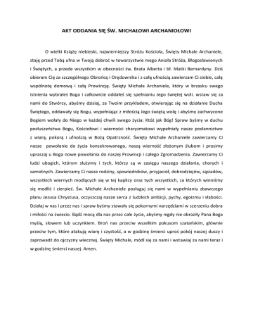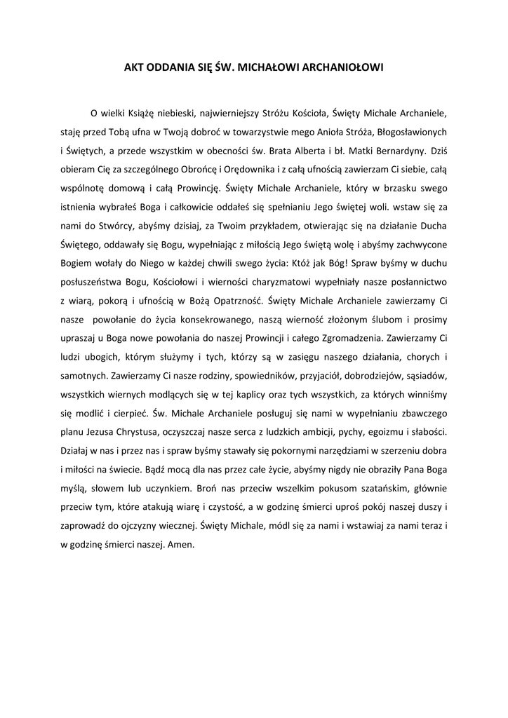 AKT ODDANIA SIĘ ŚW. MICHAŁOWI ARCHANIOŁOWI O wielki Książę niebieski, najwierniejszy Stróżu Kościoła, Święty Michale Archaniele, staję przed Tobą ufna w Twoją dobroć w towarzystwie mego Anioła Stróża, Błogosławionych i Świętych, a przede wszystkim w obecności św. Brata Alberta i bł. Matki Bernardyny. Dziś obieram Cię za szczególnego Obrońcę i Orędownika i z całą ufnością zawierzam Ci siebie, całą wspólnotę domową i całą Prowincję. Święty Michale Archaniele, który w brzasku swego istnienia wybrałeś Boga i całkowicie oddałeś się spełnianiu Jego świętej woli. wstaw się za nami do Stwórcy, abyśmy dzisiaj, za Twoim przykładem, otwierając się na działanie Ducha Świętego, oddawały się Bogu, wypełniając z miłością Jego świętą wolę i abyśmy zachwycone Bogiem wołały do Niego w każdej chwili swego życia: Któż jak Bóg! Spraw byśmy w duchu posłuszeństwa Bogu, Kościołowi i wierności charyzmatowi wypełniały nasze posłannictwo z wiarą, pokorą i ufnością w Bożą Opatrzność. Święty Michale Archaniele zawierzamy Ci nasze powołanie do życia konsekrowanego, naszą wierność złożonym ślubom i prosimy upraszaj u Boga nowe powołania do naszej Prowincji i całego Zgromadzenia. Zawierzamy Ci ludzi ubogich, którym służymy i tych, którzy są w zasięgu naszego działania, chorych i samotnych. Zawierzamy Ci nasze rodziny, spowiedników, przyjaciół, dobrodziejów, sąsiadów, wszystkich wiernych modlących się w tej kaplicy oraz tych wszystkich, za których winniśmy się modlić i cierpieć. Św. Michale Archaniele posługuj się nami w wypełnianiu zbawczego planu Jezusa Chrystusa, oczyszczaj nasze serca z ludzkich ambicji, pychy, egoizmu i słabości. Działaj w nas i przez nas i spraw byśmy stawały się pokornymi narzędziami w szerzeniu dobra i miłości na świecie. Bądź mocą dla nas przez całe życie, abyśmy nigdy nie obraziły Pana Boga myślą, słowem lub uczynkiem. Broń nas przeciw wszelkim pokusom szatańskim, głównie przeciw tym, które atakują wiarę i czystość, a w godzinę śmierci uproś pokój naszej duszy i zaprowadź do ojczyzny wiecznej. Święty Michale, módl się za nami i wstawiaj za nami teraz i w godzinę śmierci naszej. Amen.