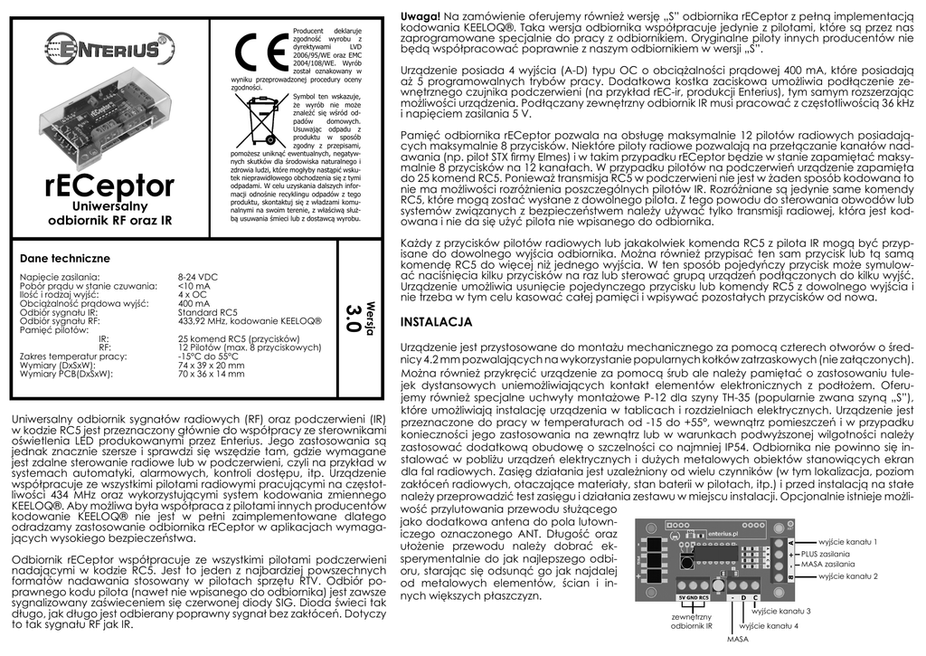 ® rECeptor Uniwersalny odbiornik RF oraz IR Uwaga! Na zamówienie oferujemy również wersję „S” odbiornika rECeptor z pełną implementacją kodowania KEELOQ®. Taka wersja odbiornika współpracuje jedynie z pilotami, które są przez nas zaprogramowane specjalnie do pracy z odbiornikiem. Oryginalne piloty innych producentów nie będą współpracować poprawnie z naszym odbiornikiem w wersji „S”. Producent deklaruje zgodność wyrobu z dyrektywami LVD 2006/95/WE oraz EMC 2004/108/WE. Wyrób został oznakowany w wyniku przeprowadzonej procedury oceny zgodności. Symbol ten wskazuje, że wyrób nie może znaleźć się wśród odpadów domowych. Usuwając odpadu z produktu w sposób zgodny z przepisami, pomożesz uniknąć ewentualnych, negatywnych skutków dla środowiska naturalnego i zdrowia ludzi, które mogłyby nastąpić wskutek nieprawidłowego obchodzenia się z tymi odpadami. W celu uzyskania dalszych informacji odnośnie recyklingu odpadów z tego produktu, skontaktuj się z władzami komunalnymi na swoim terenie, z właściwą służbą usuwania śmieci lub z dostawcą wyrobu. Urządzenie posiada 4 wyjścia (A-D) typu OC o obciążalności prądowej 400 mA, które posiadają aż 5 programowalnych trybów pracy. Dodatkowa kostka zaciskowa umożliwia podłączenie zewnętrznego czujnika podczerwieni (na przykład rEC-ir, produkcji Enterius), tym samym rozszerzając możliwości urządzenia. Podłączany zewnętrzny odbiornik IR musi pracować z częstotliwością 36 kHz i napięciem zasilania 5 V. Pamięć odbiornika rECeptor pozwala na obsługę maksymalnie 12 pilotów radiowych posiadających maksymalnie 8 przycisków. Niektóre piloty radiowe pozwalają na przełączanie kanałów nadawania (np. pilot STX firmy Elmes) i w takim przypadku rECeptor będzie w stanie zapamiętać maksymalnie 8 przycisków na 12 kanałach. W przypadku pilotów na podczerwień urządzenie zapamięta do 25 komend RC5. Ponieważ transmisja RC5 w podczerwieni nie jest w żaden sposób kodowana to nie ma możliwości rozróżnienia poszczególnych pilotów IR. Rozróżniane są jedynie same komendy RC5, które mogą zostać wysłane z dowolnego pilota. Z tego powodu do sterowania obwodów lub systemów związanych z bezpieczeństwem należy używać tylko transmisji radiowej, która jest kodowana i nie da się użyć pilota nie wpisanego do odbiornika. Dane techniczne 25 komend RC5 (przycisków) 12 Pilotów (max. 8 przyciskowych) -15°C do 55°C 74 x 39 x 20 mm 70 x 36 x 14 mm Wersja 8-24 VDC <10 mA 4 x OC 400 mA Standard RC5 433,92 MHz, kodowanie KEELOQ® 3.0 Napięcie zasilania: Pobór prądu w stanie czuwania: Ilość i rodzaj wyjść: Obciążalność prądowa wyjść: Odbiór sygnału IR: Odbiór sygnału RF: Pamięć pilotów: IR: RF: Zakres temperatur pracy: Wymiary (DxSxW): Wymiary PCB(DxSxW): Uniwersalny odbiornik sygnałów radiowych (RF) oraz podczerwieni (IR) w kodzie RC5 jest przeznaczony głównie do współpracy ze sterownikami oświetlenia LED produkowanymi przez Enterius. Jego zastosowania są jednak znacznie szersze i sprawdzi się wszędzie tam, gdzie wymagane jest zdalne sterowanie radiowe lub w podczerwieni, czyli na przykład w systemach automatyki, alarmowych, kontroli dostępu, itp. Urządzenie współpracuje ze wszystkimi pilotami radiowymi pracującymi na częstotliwości 434 MHz oraz wykorzystującymi system kodowania zmiennego KEELOQ®. Aby możliwa była współpraca z pilotami innych producentów kodowanie KEELOQ® nie jest w pełni zaimplementowane dlatego odradzamy zastosowanie odbiornika rECeptor w aplikacjach wymagających wysokiego bezpieczeństwa. Odbiornik rECeptor współpracuje ze wszystkimi pilotami podczerwieni nadającymi w kodzie RC5. Jest to jeden z najbardziej powszechnych formatów nadawania stosowany w pilotach sprzętu RTV. Odbiór poprawnego kodu pilota (nawet nie wpisanego do odbiornika) jest zawsze sygnalizowany zaświeceniem się czerwonej diody SIG. Dioda świeci tak długo, jak długo jest odbierany poprawny sygnał bez zakłóceń. Dotyczy to tak sygnału RF jak IR. Każdy z przycisków pilotów radiowych lub jakakolwiek komenda RC5 z pilota IR mogą być przypisane do dowolnego wyjścia odbiornika. Można również przypisać ten sam przycisk lub tą samą komendę RC5 do więcej niż jednego wyjścia. W ten sposób pojedyńczy przycisk może symulować naciśnięcia kilku przycisków na raz lub sterować grupą urządzeń podłączonych do kilku wyjść. Urządzenie umożliwia usunięcie pojedynczego przycisku lub komendy RC5 z dowolnego wyjścia i nie trzeba w tym celu kasować całej pamięci i wpisywać pozostałych przycisków od nowa. INSTALACJA Urządzenie jest przystosowane do montażu mechanicznego za pomocą czterech otworów o średnicy 4.2 mm pozwalających na wykorzystanie popularnych kołków zatrzaskowych (nie załączonych). Można również przykręcić urządzenie za pomocą śrub ale należy pamiętać o zastosowaniu tulejek dystansowych uniemożliwiających kontakt elementów elektronicznych z podłożem. Oferujemy również specjalne uchwyty montażowe P-12 dla szyny TH-35 (popularnie zwana szyną „S”), które umożliwiają instalację urządzenia w tablicach i rozdzielniach elektrycznych. Urządzenie jest przeznaczone do pracy w temperaturach od -15 do +55°, wewnątrz pomieszczeń i w przypadku konieczności jego zastosowania na zewnątrz lub w warunkach podwyższonej wilgotności należy zastosować dodatkową obudowę o szczelności co najmniej IP54. Odbiornika nie powinno się instalować w pobliżu urządzeń elektrycznych i dużych metalowych obiektów stanowiących ekran dla fal radiowych. Zasięg działania jest uzależniony od wielu czynników (w tym lokalizacja, poziom zakłóceń radiowych, otaczające materiały, stan baterii w pilotach, itp.) i przed instalacją na stałe należy przeprowadzić test zasięgu i działania zestawu w miejscu instalacji. Opcjonalnie istnieje możliwość przylutowani